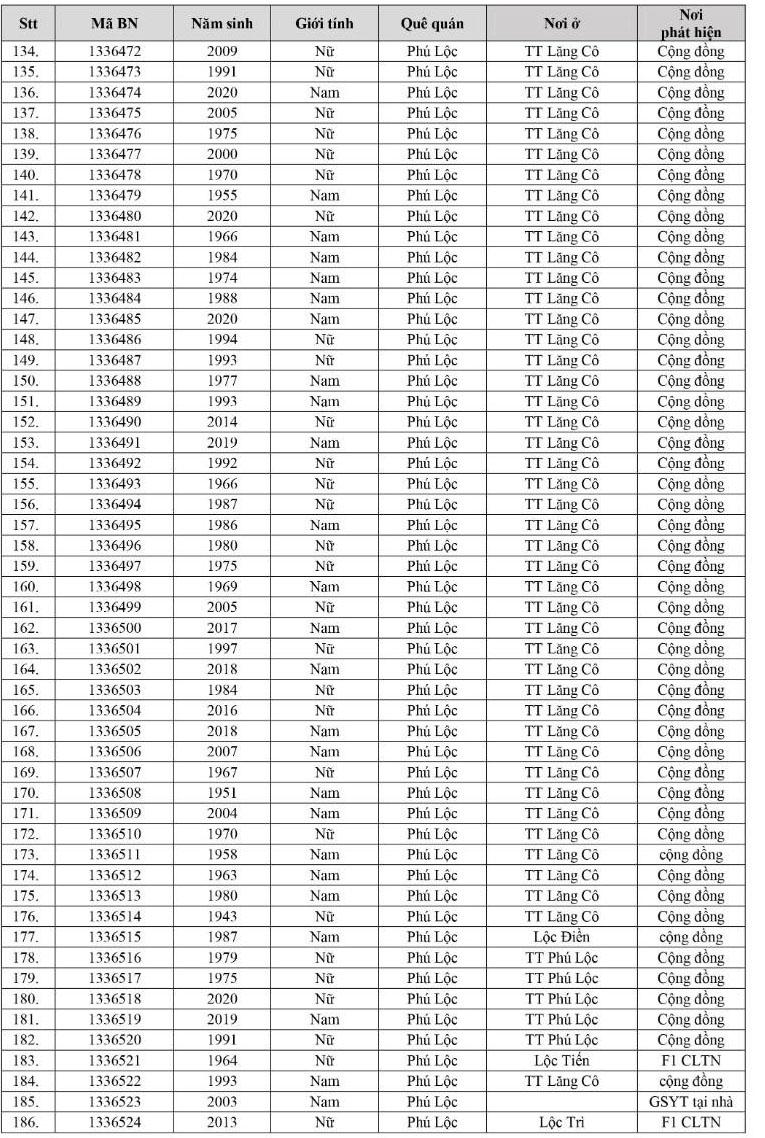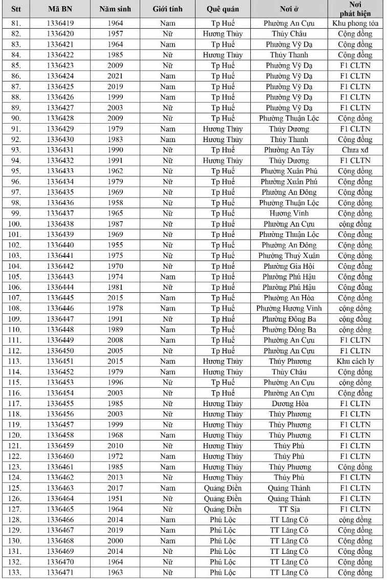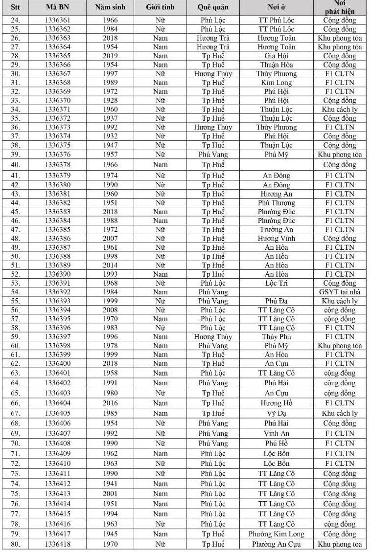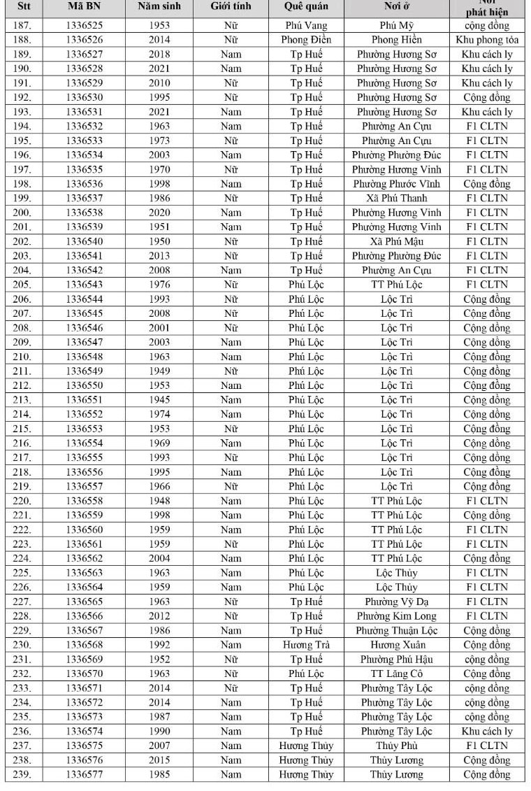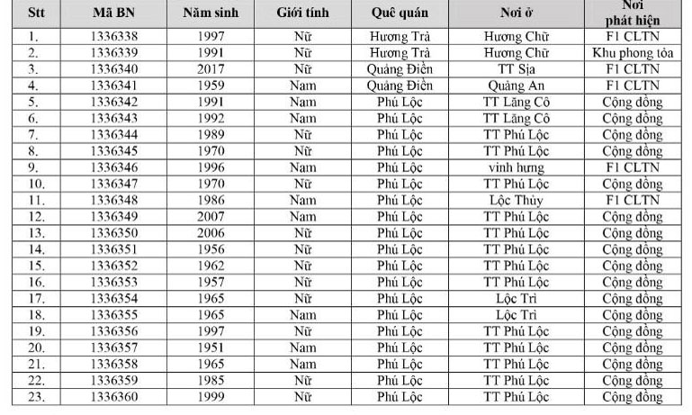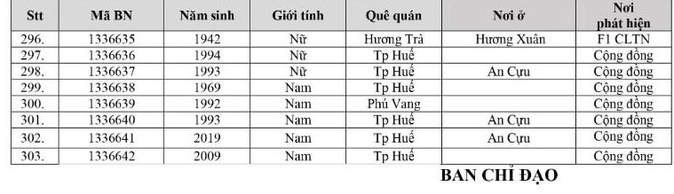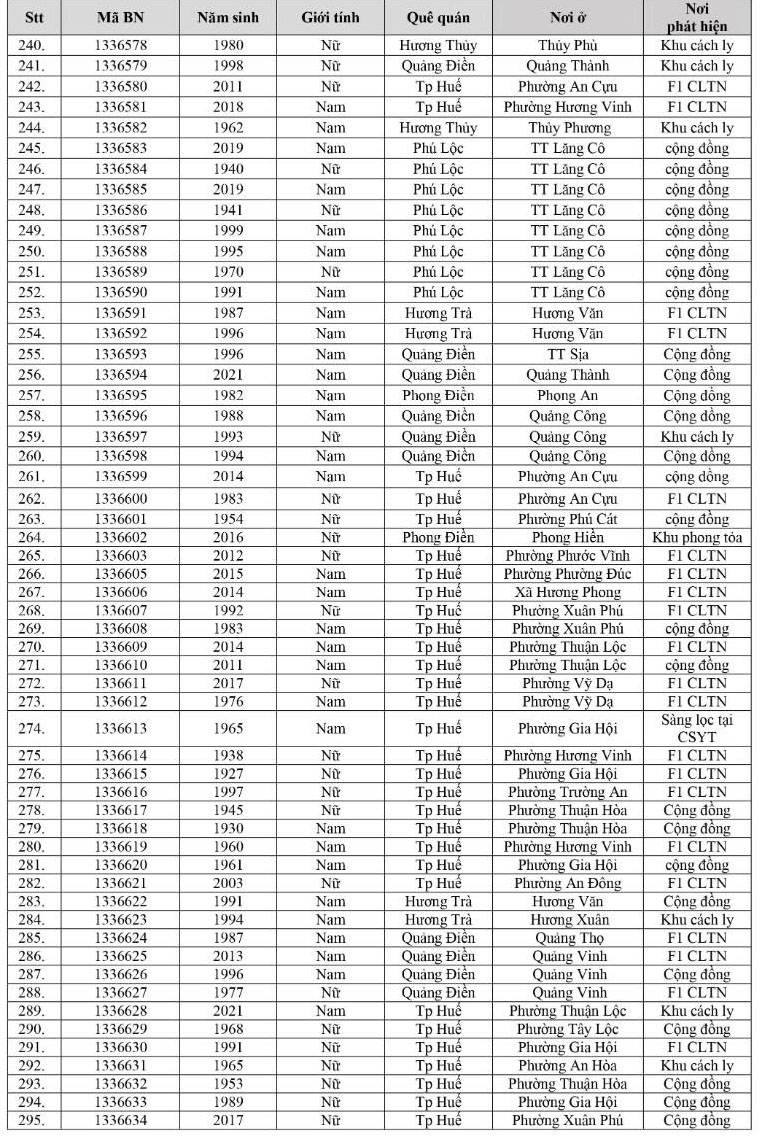 Kết quả đến 18h00 ngày 07/12/2021, tỉnh Thừa Thiên Huế ghi nhận thêm 303 ca bệnh khẳng định dương tính SARS-CoV-2. Trong đó, phát hiện tại khu cách ly tập trung (KCL): 16; khu phong toả: 09; giám sát y tế người từ vùng dịch về: 02; F1 đang thực hiện cách ly tại nhà (F1 CLTN): 91; tại cộng đồng: 185 (tất cả được đưa vào khu cách ly y tế ngay sau khi phát hiện).