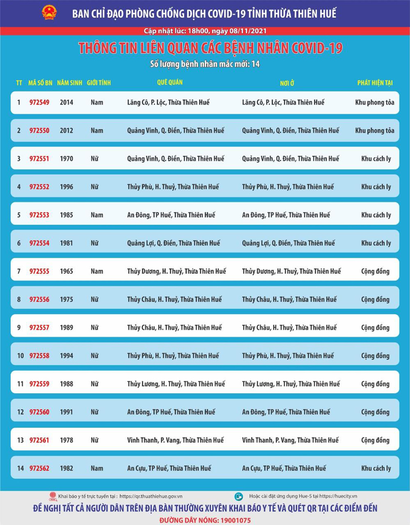 Ban Chỉ đạo Phòng, chống dịch COVID-19 tỉnh Thừa Thiên Huế thông tin liên quan đến các bệnh nhân mắc COVID-19 mới như sau:Số lượng bệnh nhân mắc mới trong ngày: 14. Trong đó, phát hiện tại khu cách ly tập trung (KCL): 05; tại khu phong toả (KPT): 02; tại cộng đồng: 07 (được đưa vào khu cách ly y tế ngay sau khi phát hiện)