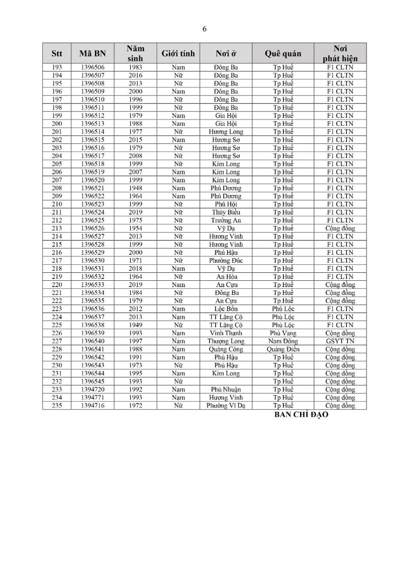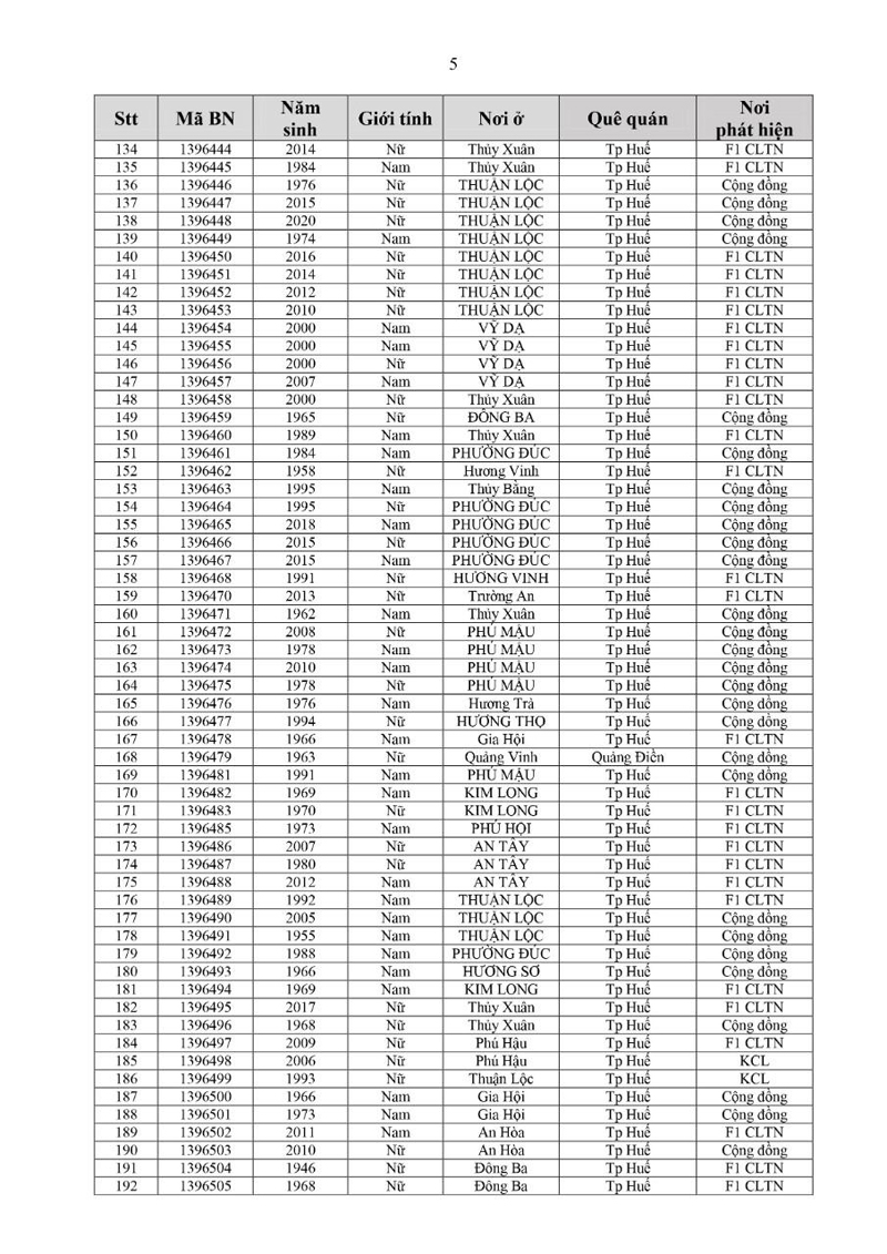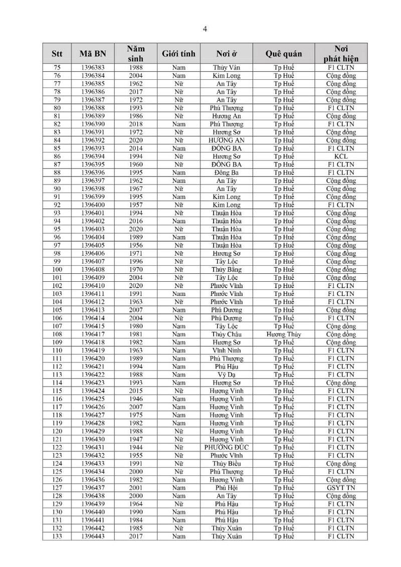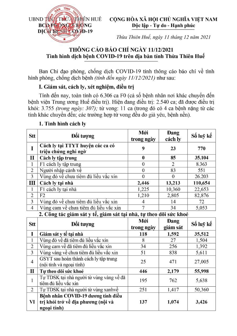 Kết quả đến 18h00 ngày 11/12/2021, test nhanh trong ngày phát hiện thêm 346 ca dương tính, trong đó 129 ca cộng đồng.Trong ngày tỉnh Thừa Thiên Huế ghi nhận thêm 235 ca bệnh khẳng định dương tính SARS-CoV-2 có mã bệnh của Bộ Y tế. Trong đó, phát hiện tại khu cách ly tập trung (KCL): 04; giám sát y tế tại nhà: 08; F1 đang thực hiện cách ly tại nhà (F1 CLTN): 135; tại cộng đồng: 88 (tất cả được đưa vào khu cách ly y tế ngay sau khi phát hiện).