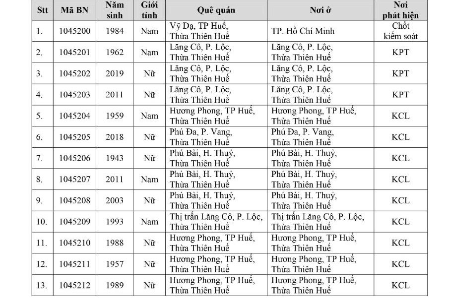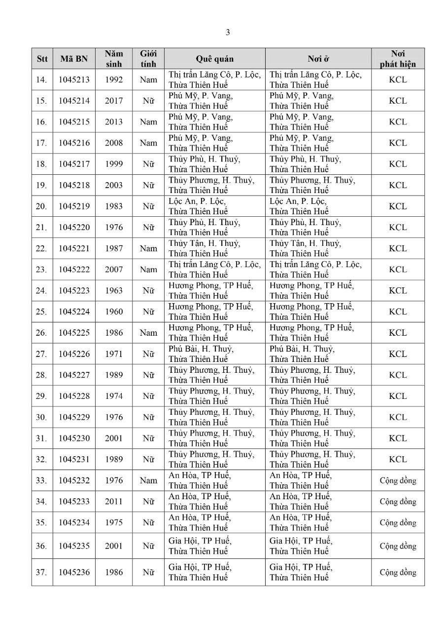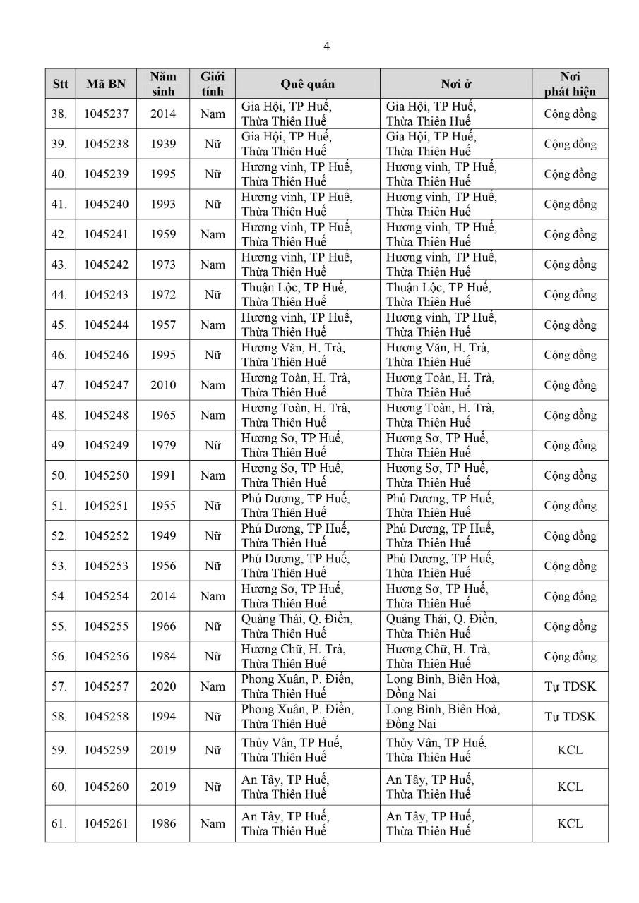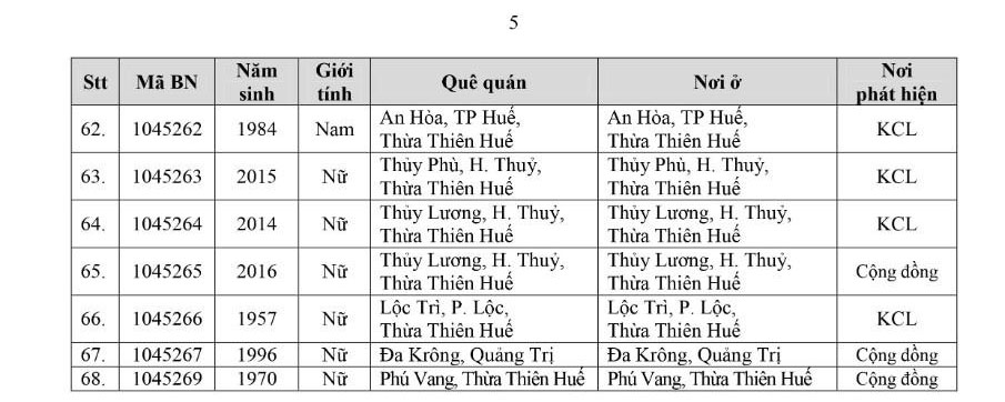 Kết quả đến 18h00 ngày 16/11/2021, tỉnh Thừa Thiên Huế ghi nhận thêm 68 ca bệnh khẳng định dương tính SARS-CoV-2. Trong đó, phát hiện tại khu cách ly tập trung (KCL): 35; tại khu phong toả (KPT): 03; tại Chốt kiểm soát: 01; tự theo dõi sức khoẻ từ vùng dịch về (tự TDSK): 02; tại cộng đồng: 27 (được đưa vào khu cách ly y tế ngay sau khi phát hiện).