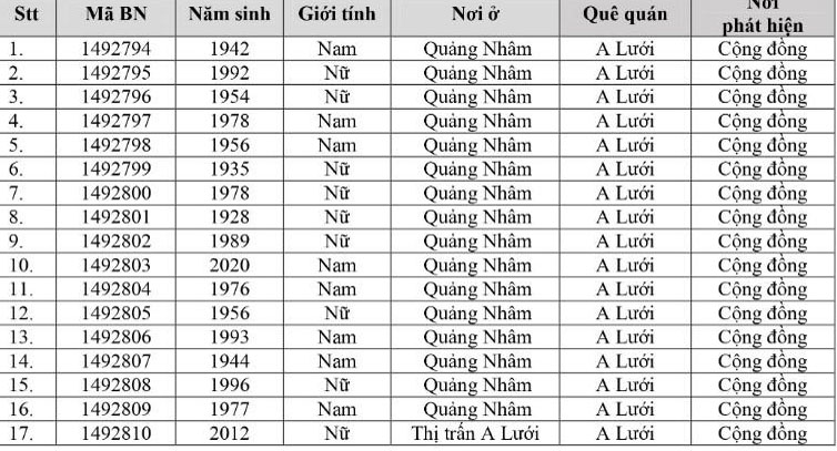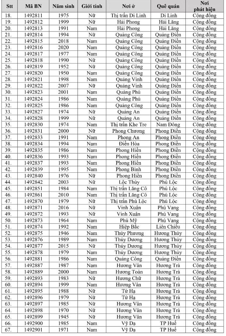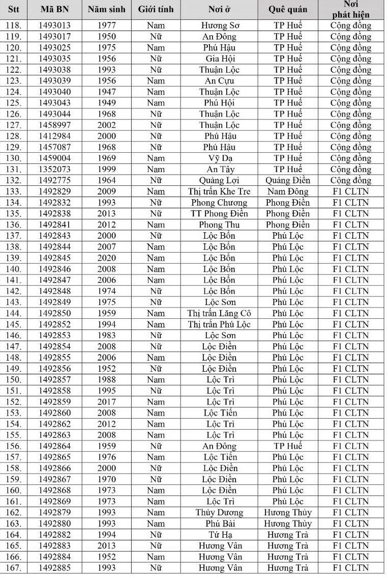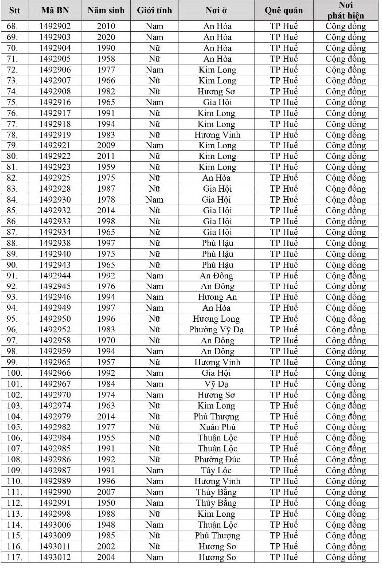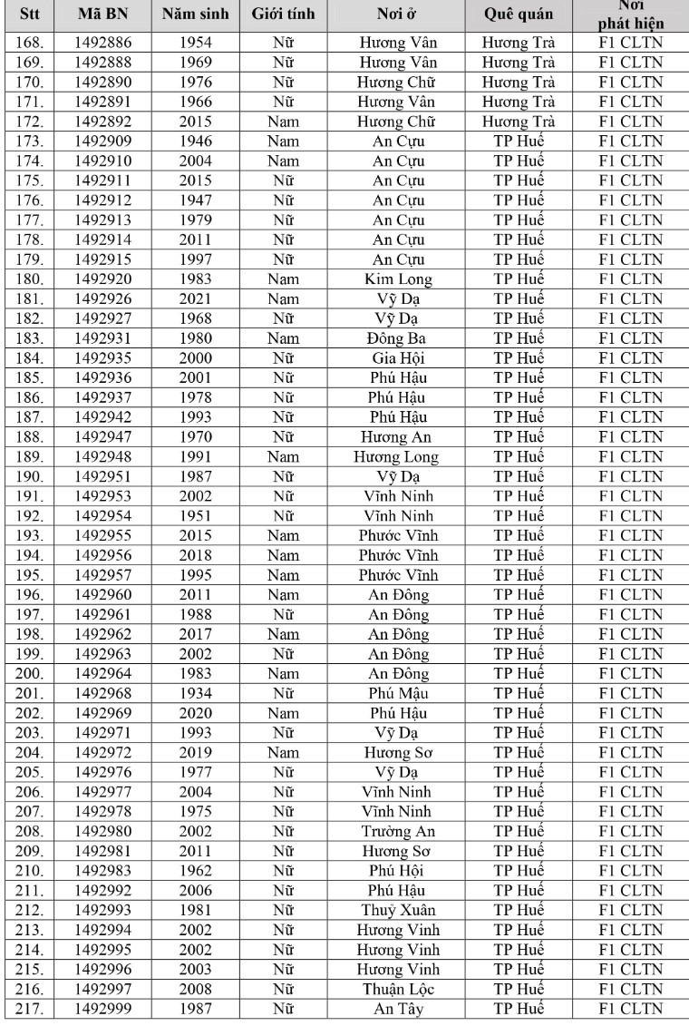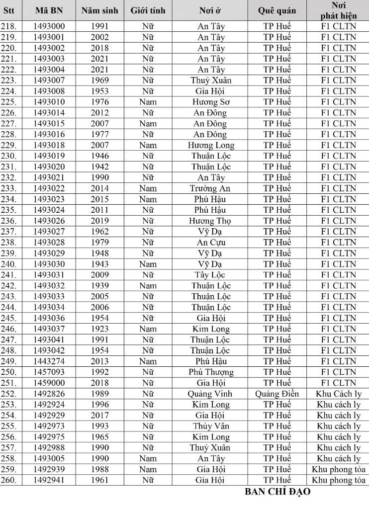 Kết quả đến 18h00 ngày 16/12/2021, tỉnh Thừa Thiên Huế ghi nhận thêm 260 ca bệnh khẳng định dương tính SARS-CoV-2 có mã bệnh của Bộ Y tế. Trong đó, phát hiện tại khu cách ly tập trung (KCL): 07; tại khu phong tỏa: 02; F1 đang thực hiện cách ly tại nhà (F1 CLTN): 119; tại cộng đồng: 132 (tất cả được đưa vào khu cách ly y tế ngay sau khi phát hiện).