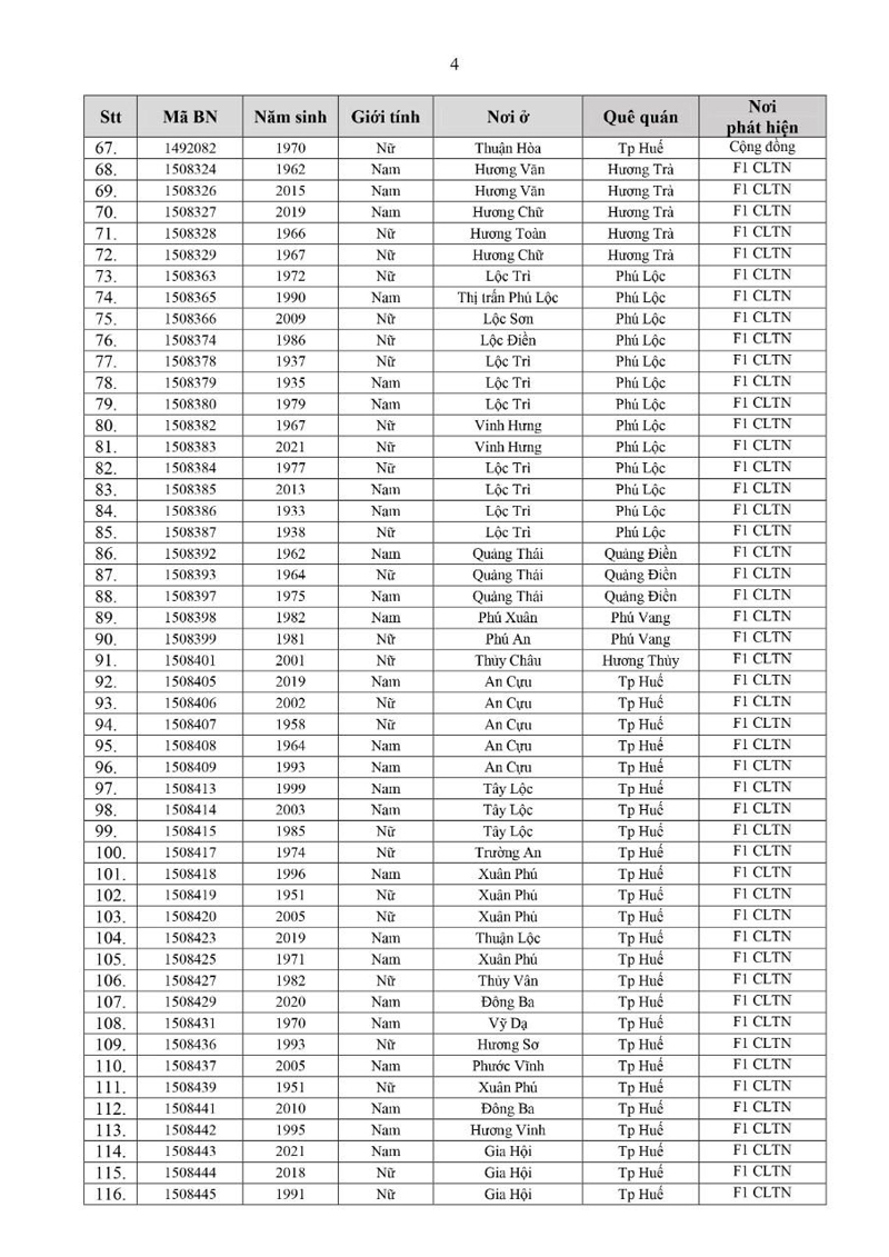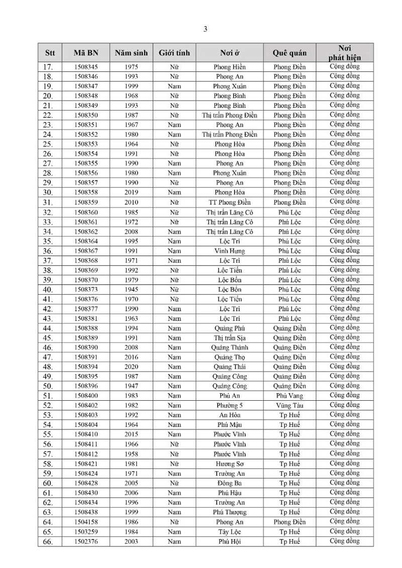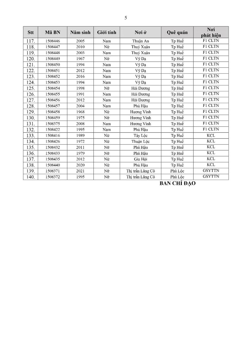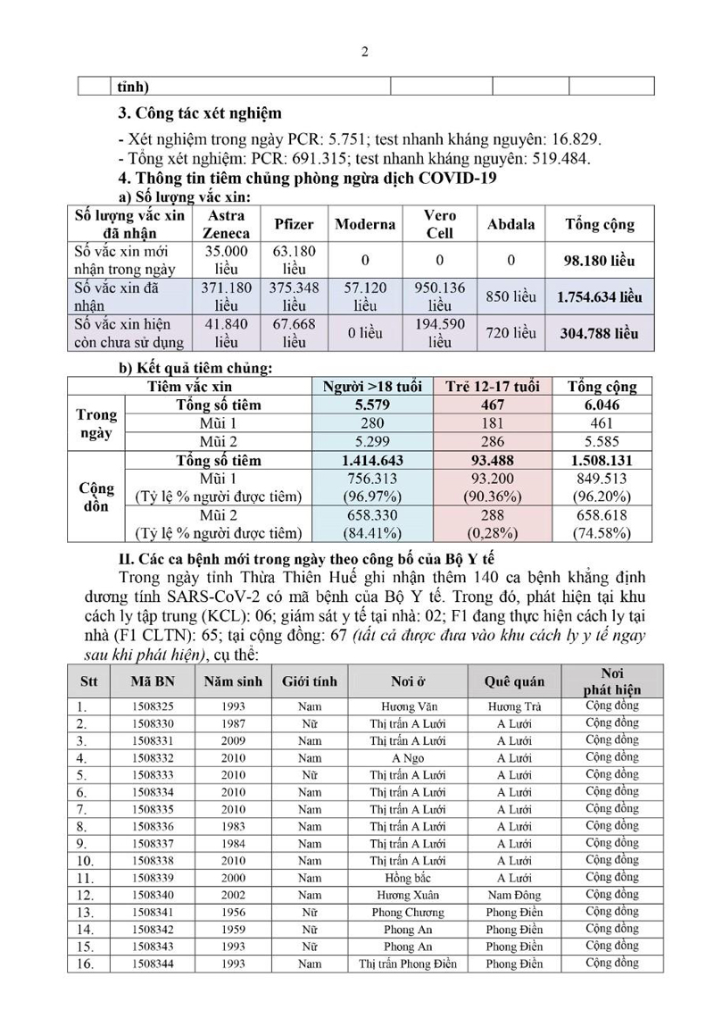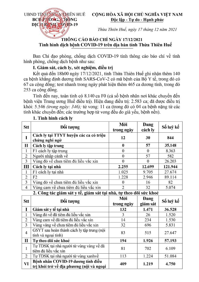 Kết quả đến 18h00 ngày 17/12/2021, tỉnh Thừa Thiên Huế ghi nhận thêm 140 ca bệnh khẳng định dương tính SARS-CoV-2 có mã bệnh của Bộ Y tế.Trong đó, phát hiện tại khu cách ly tập trung (KCL): 06; giám sát y tế tại nhà: 02; F1 đang thực hiện cách ly tại nhà (F1 CLTN): 65; tại cộng đồng: 67 (tất cả được đưa vào khu cách ly y tế ngay sau khi phát hiện).