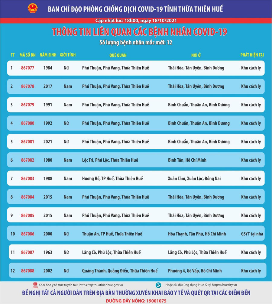 Ban chỉ đạo phòng chống dịch Covid-19 tỉnh Thừa Thiên Huế thông tin liên quan đến các bệnh nhân mắc Covid-19 ( cập nhật lúc 18 giờ ngày 18 tháng 10 năm 2021) Số lượng bệnh nhân mắc mới : 12