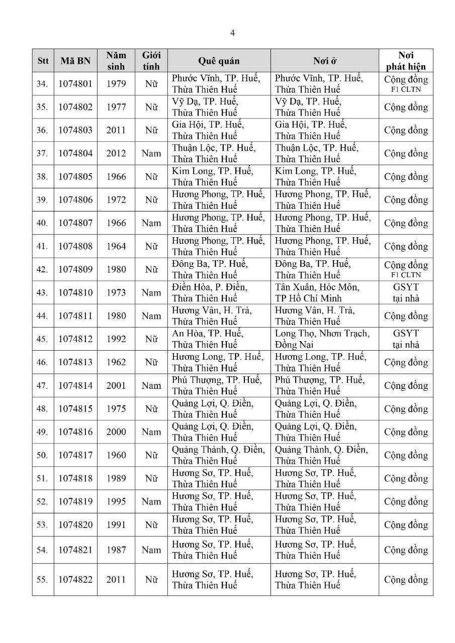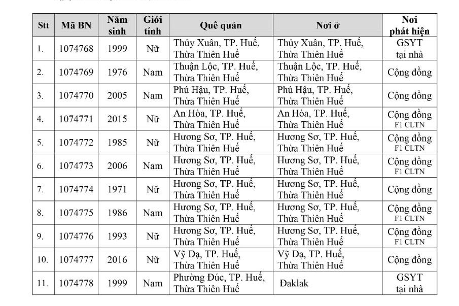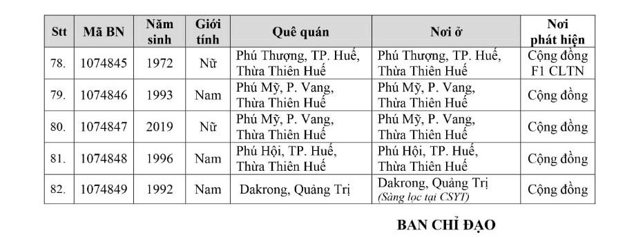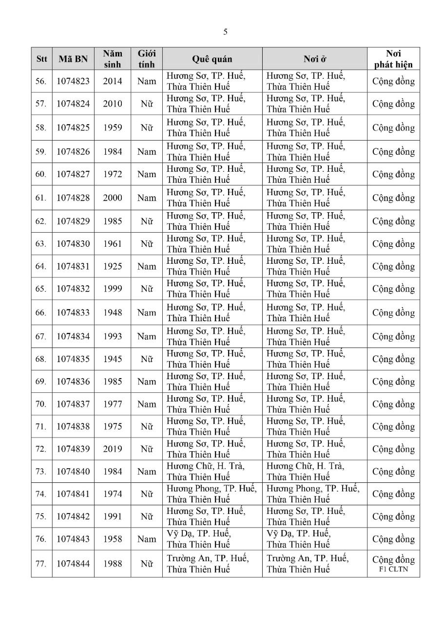 Kết quả đến 18h00 ngày 19/11/2021, tỉnh Thừa Thiên Huế ghi nhận thêm 82 ca bệnh khẳng định dương tính SARS-CoV-2. Trong đó, phát hiện tại khu cách ly tập trung (KCL): 07; giám sát y tế (GSYT) tại nhà: 05; tại cộng đồng: 70 (trong đó, F1 đang thực hiện cách ly tại nhà (F1 CLTN): 10; tất cả được đưa vào khu cách ly y tế ngay sau khi phát hiện)