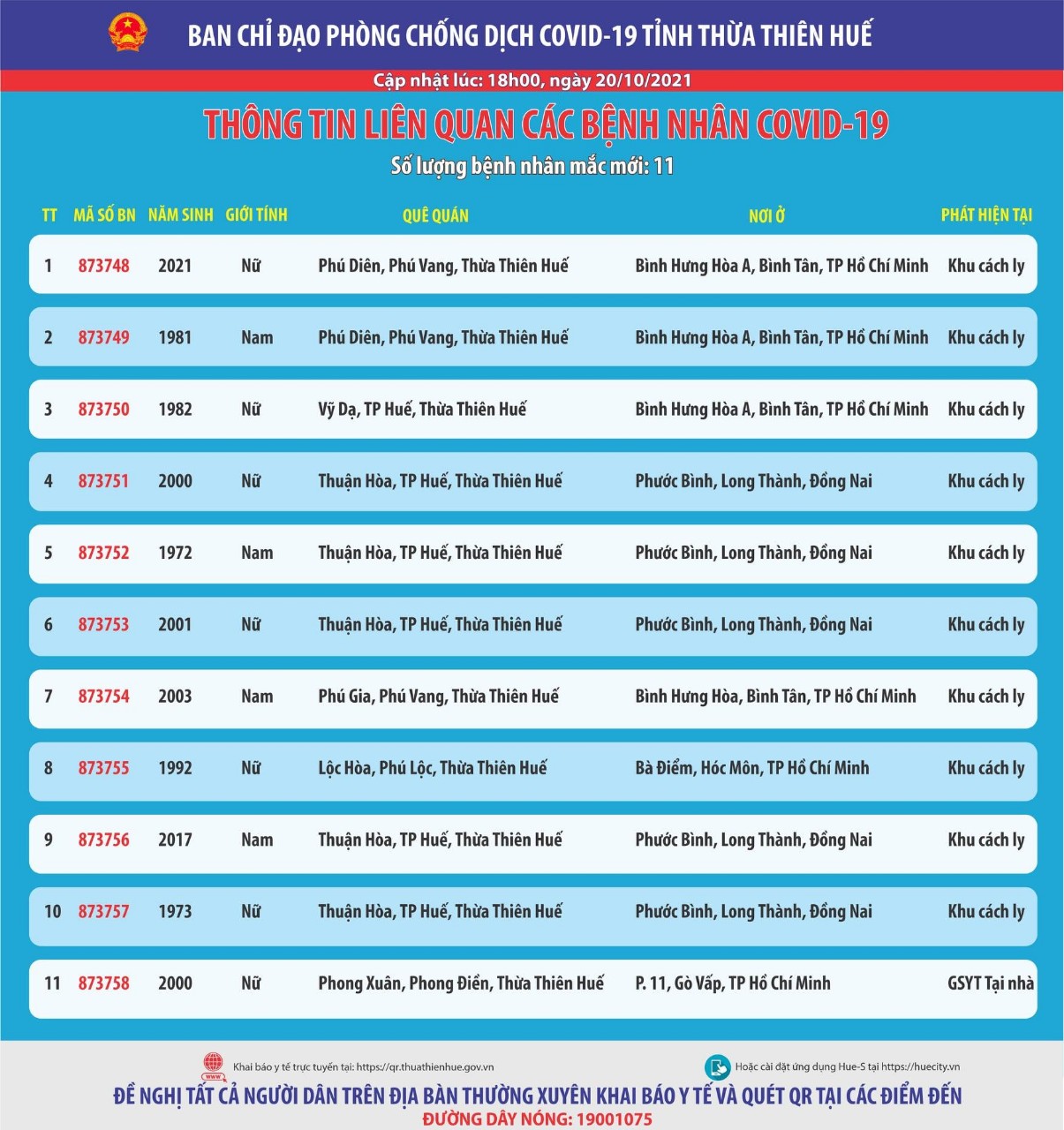 Ban chỉ đạo phòng chống dịch Covid-19 tỉnh Thừa Thiên Huế thông tin liên quan đến các bệnh nhân mắc Covid-19 ( cập nhật lúc 18 giờ ngày 20 tháng 10 năm 2021)