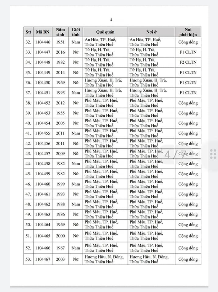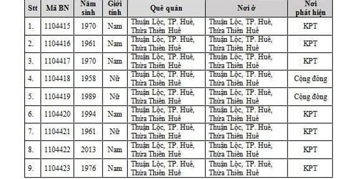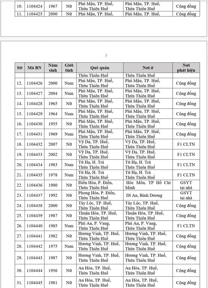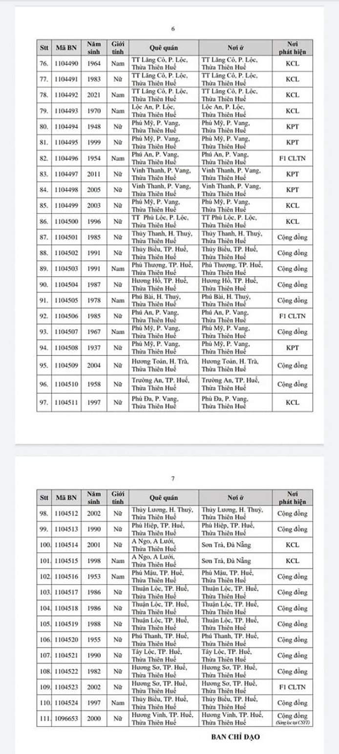 Kết quả đến 18h00 ngày 22/11/2021, tỉnh Thừa Thiên Huế ghi nhận thêm 111 ca bệnh khẳng định dương tính SARS-CoV-2. Trong đó, phát hiện tại khu cách ly tập trung (KCL): 20; khu phong toả (KPT): 17; giám sát y tế (GSYT) tại nhà: 02; F1 đang thực hiện cách ly tại nhà (F1 CLTN): 15; F2 đang thực hiện cách ly tại nhà (F2 CLTN): 01; tại cộng đồng: 56.