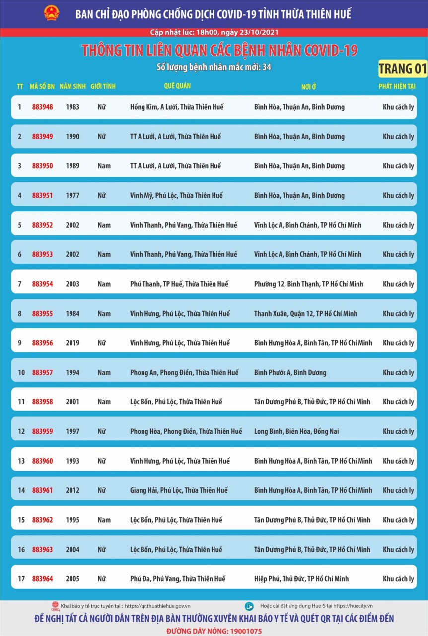 Ban chỉ đạo phòng chống dịch Covid-19 tỉnh Thừa Thiên Huế thông tin liên quan đến các bệnh nhân mắc Covid-19 ( cập nhật lúc 18 giờ ngày 23 tháng 10 năm 2021)
