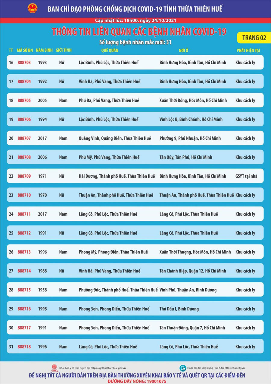 Ban chỉ đạo phòng chống dịch Covid-19 tỉnh Thừa Thiên Huế thông tin liên quan đến các bệnh nhân mắc Covid-19 ( cập nhật lúc 18 giờ ngày 24 tháng 10 năm 2021) Số lượng bệnh nhân mắc mới : 31