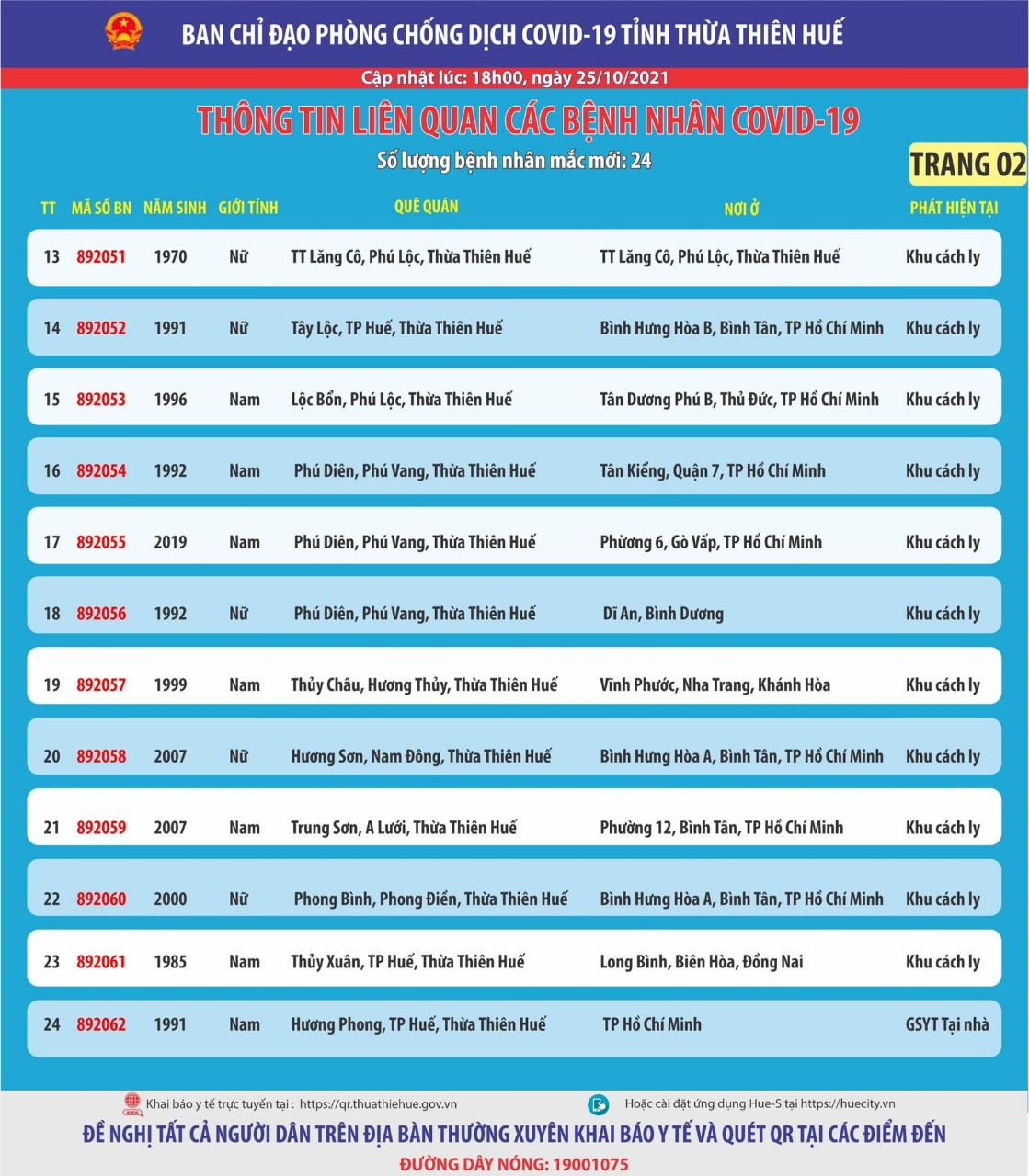 Ban chỉ đạo phòng chống dịch Covid-19 tỉnh Thừa Thiên Huế thông tin liên quan đến các bệnh nhân mắc Covid-19 ( cập nhật lúc 18 giờ ngày 25 tháng 10 năm 2021) Số lượng bệnh nhân mắc mới : 24
