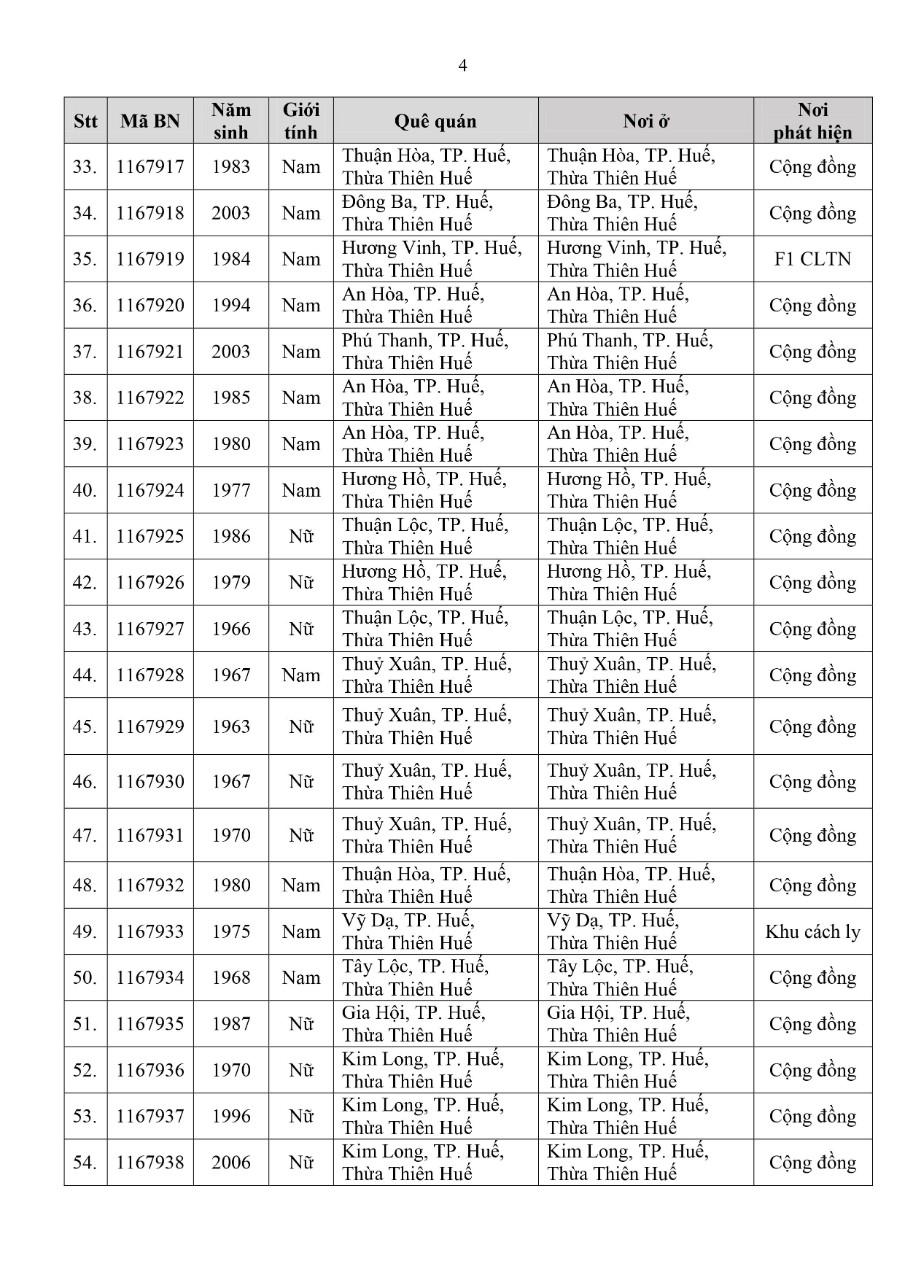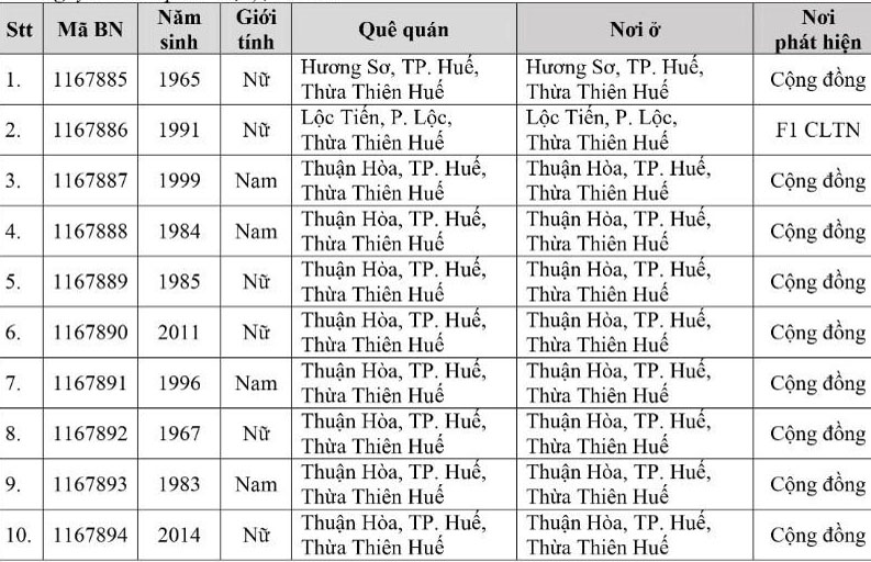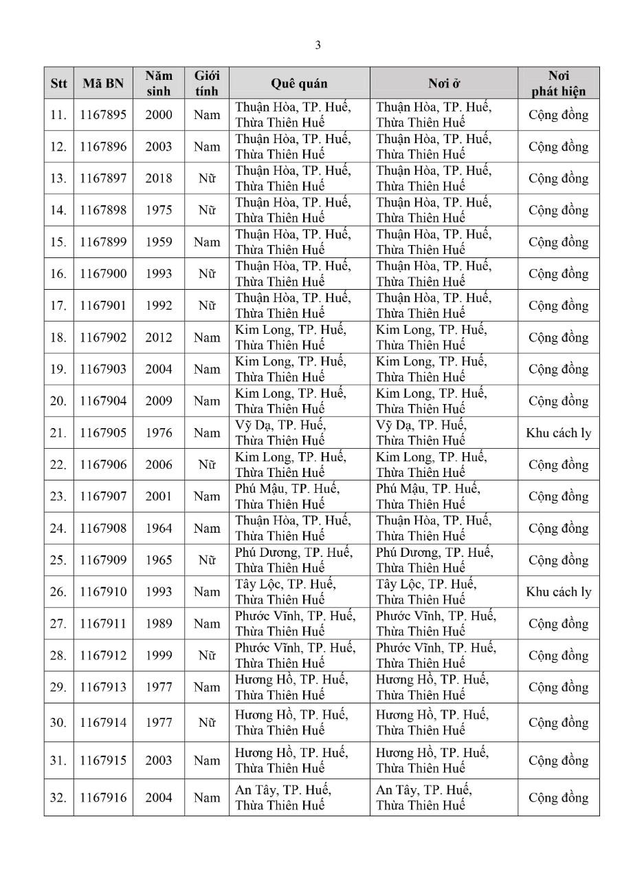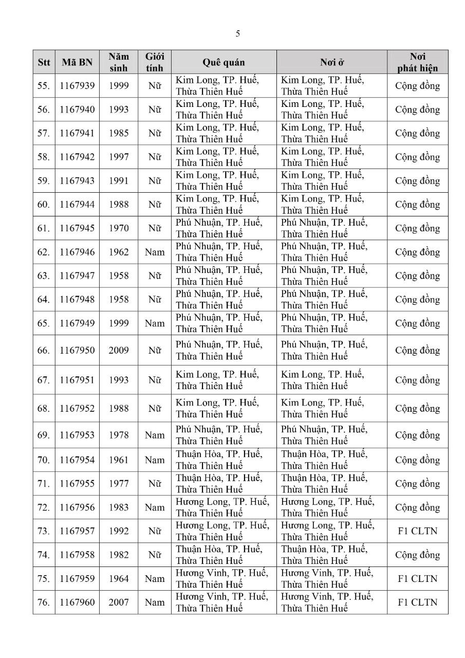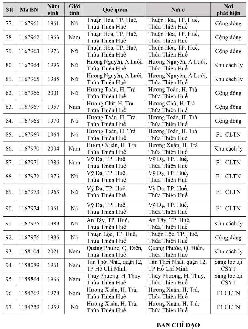 Kết quả đến 18h00 ngày 25/11/2021, tỉnh Thừa Thiên Huế ghi nhận thêm 97 ca bệnh khẳng định dương tính SARS-CoV-2. Trong đó, phát hiện tại khu cách ly tập trung (KCL): 08; sàng lọc tại cơ sở y tế (CSYT): 02; F1 đang thực hiện cách ly tại nhà (F1 CLTN): 12; tại cộng đồng: 75 (tất cả được đưa vào khu cách ly y tế ngay sau khi phát hiện).