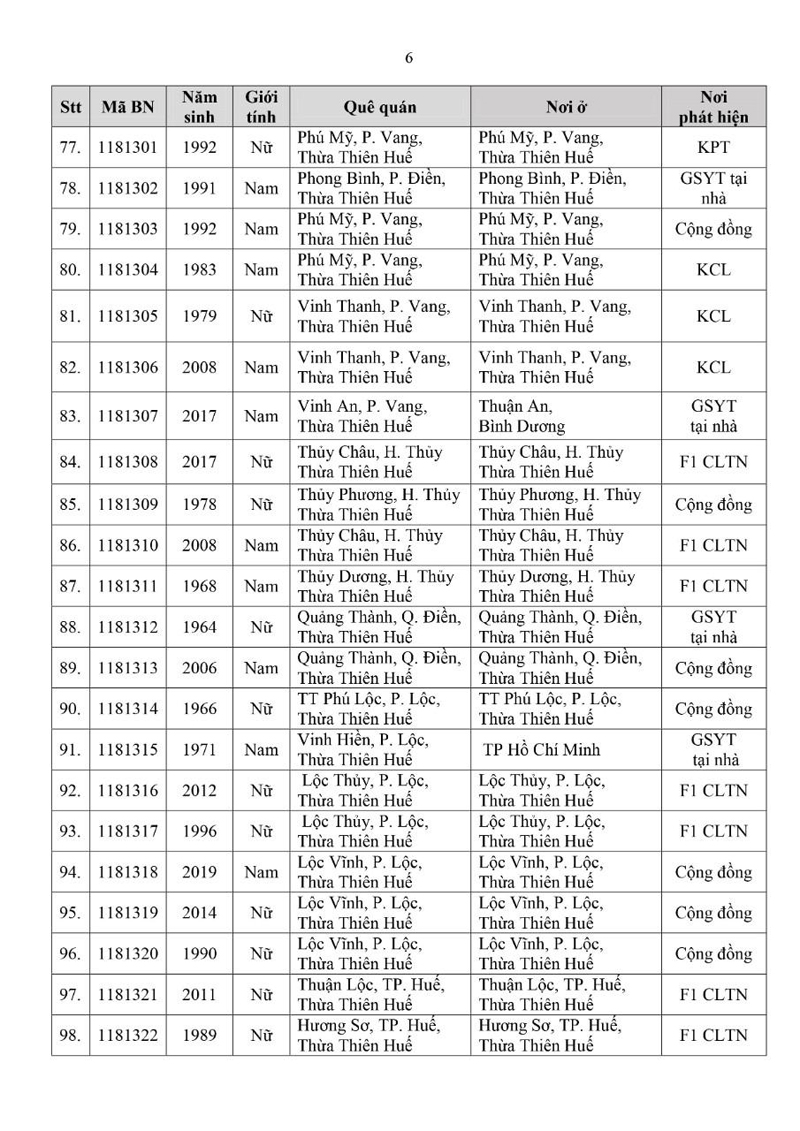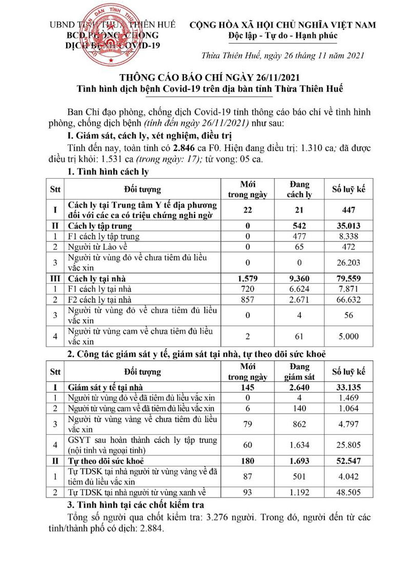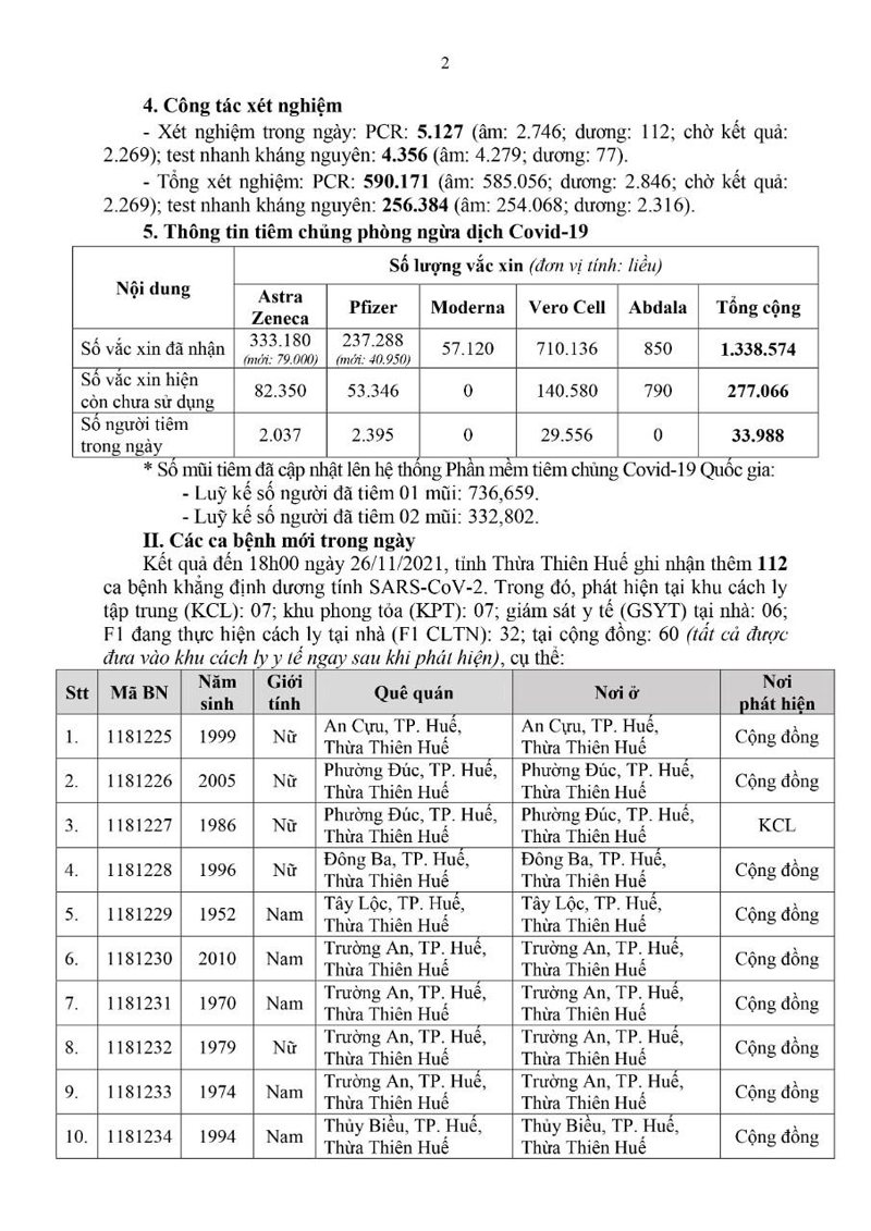 Kết quả đến 18h00 ngày 26/11/2021, tỉnh Thừa Thiên Huế ghi nhận thêm 112 ca bệnh khẳng định dương tính SARS-CoV-2.Trong đó, phát hiện tại khu cách ly tập trung (KCL): 07; khu phong tỏa (KPT): 07; giám sát y tế (GSYT) tại nhà: 06; F1 đang thực hiện cách ly tại nhà (F1 CLTN): 32; tại cộng đồng: 60 (tất cả được đưa vào khu cách ly y tế ngay sau khi phát hiện).