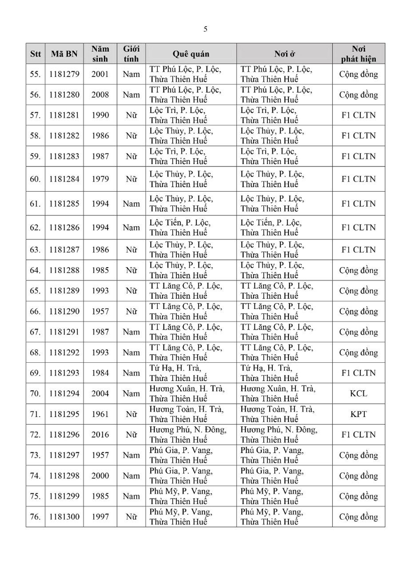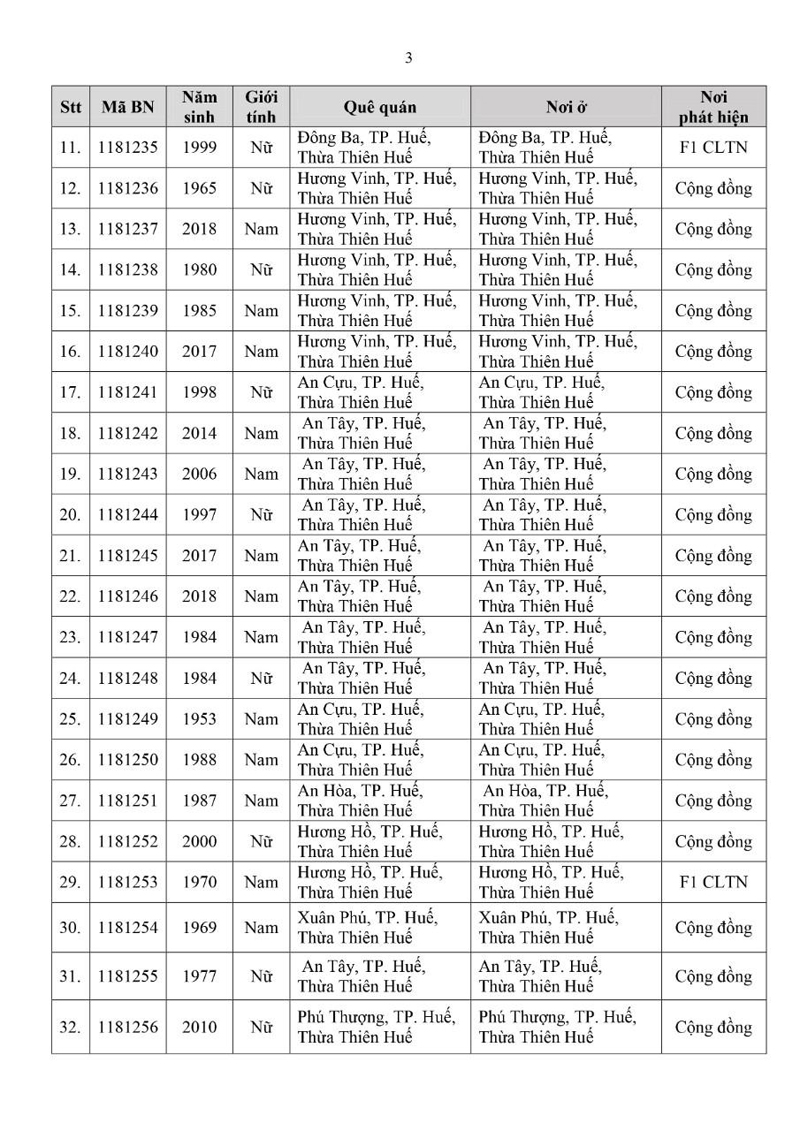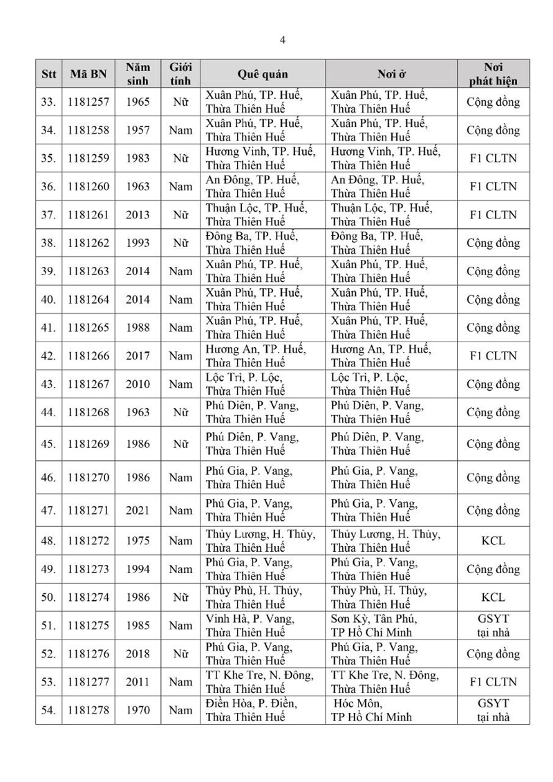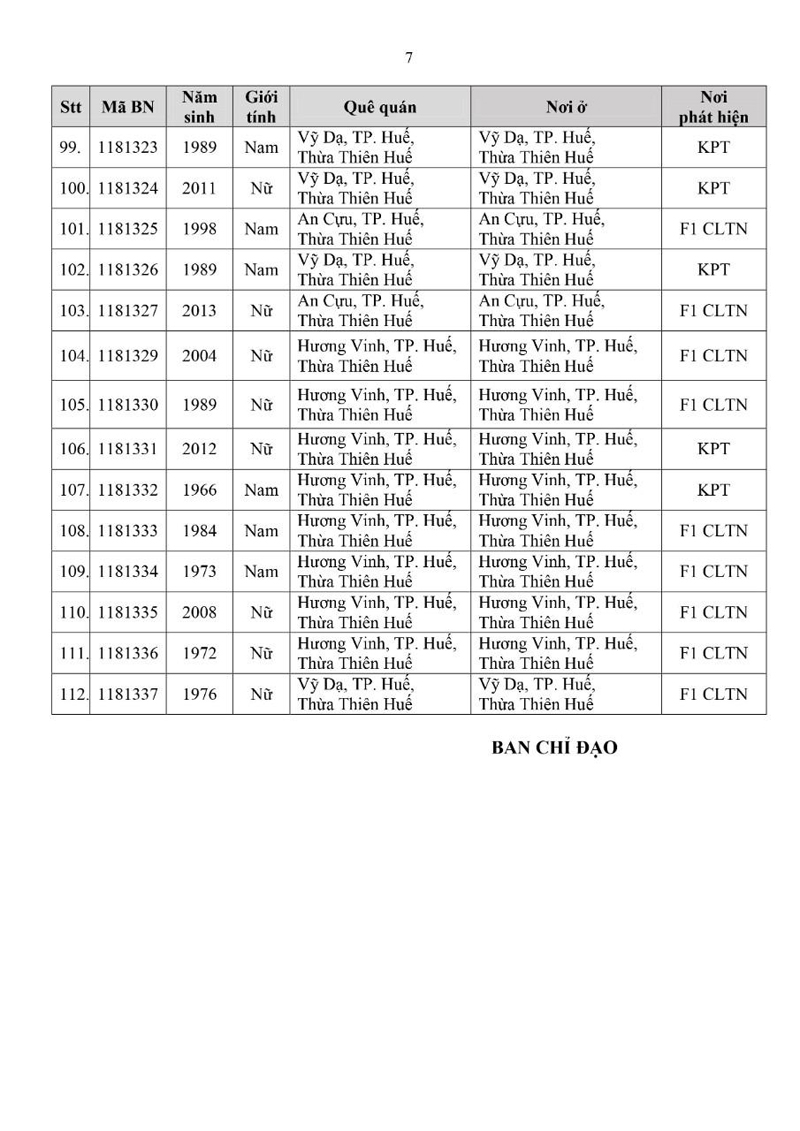 Kết quả đến 18h00 ngày 26/11/2021, tỉnh Thừa Thiên Huế ghi nhận thêm 112 ca bệnh khẳng định dương tính SARS-CoV-2.Trong đó, phát hiện tại khu cách ly tập trung (KCL): 07; khu phong tỏa (KPT): 07; giám sát y tế (GSYT) tại nhà: 06; F1 đang thực hiện cách ly tại nhà (F1 CLTN): 32; tại cộng đồng: 60 (tất cả được đưa vào khu cách ly y tế ngay sau khi phát hiện).