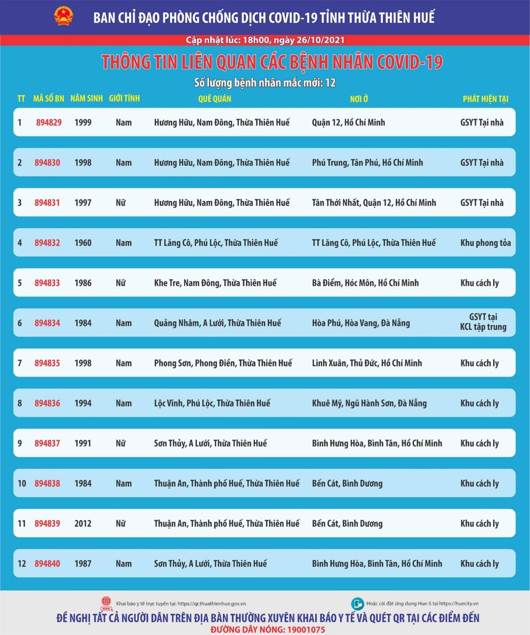 Ban chỉ đạo phòng chống dịch Covid-19 tỉnh Thừa Thiên Huế thông tin liên quan đến các bệnh nhân mắc Covid-19 ( cập nhật lúc 18 giờ ngày 26 tháng 10 năm 2021)