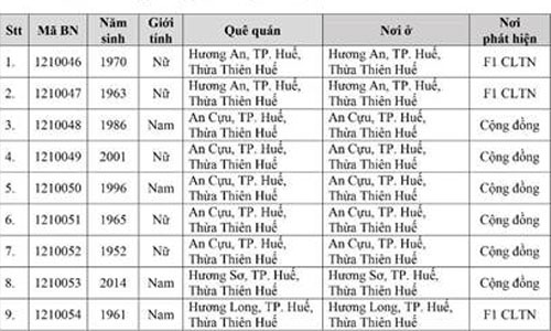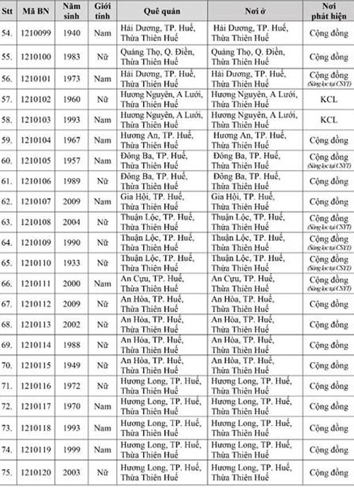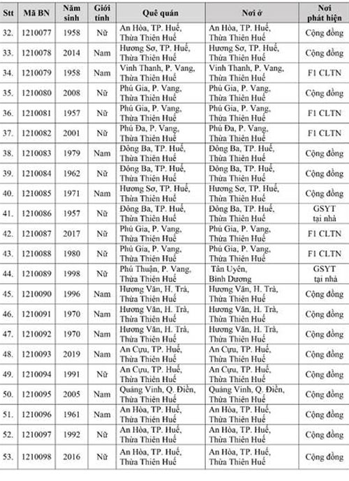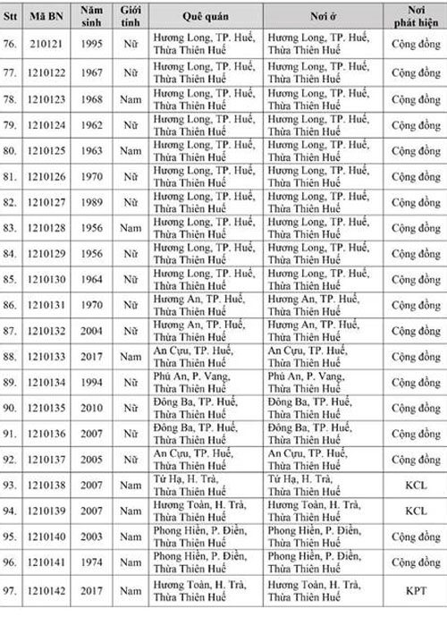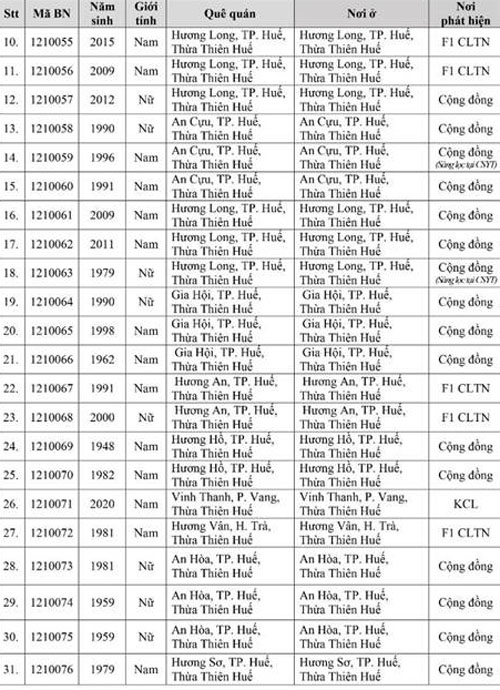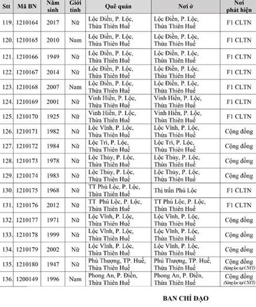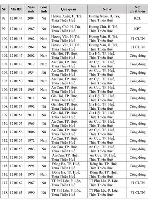 Kết quả đến 18h00 ngày 28/11/2021, tỉnh Thừa Thiên Huế ghi nhận thêm 136 ca bệnh khẳng định dương tính SARS-CoV-2. Trong đó, phát hiện tại khu cách ly tập trung (KCL): 06; khu phong tỏa (KPT): 02; giám sát y tế (GSYT) tại nhà: 02; F1 đang thực hiện cách ly tại nhà (F1 CLTN): 26; tại cộng đồng: 100 (tất cả được đưa vào khu cách ly y tế ngay sau khi phát hiện).