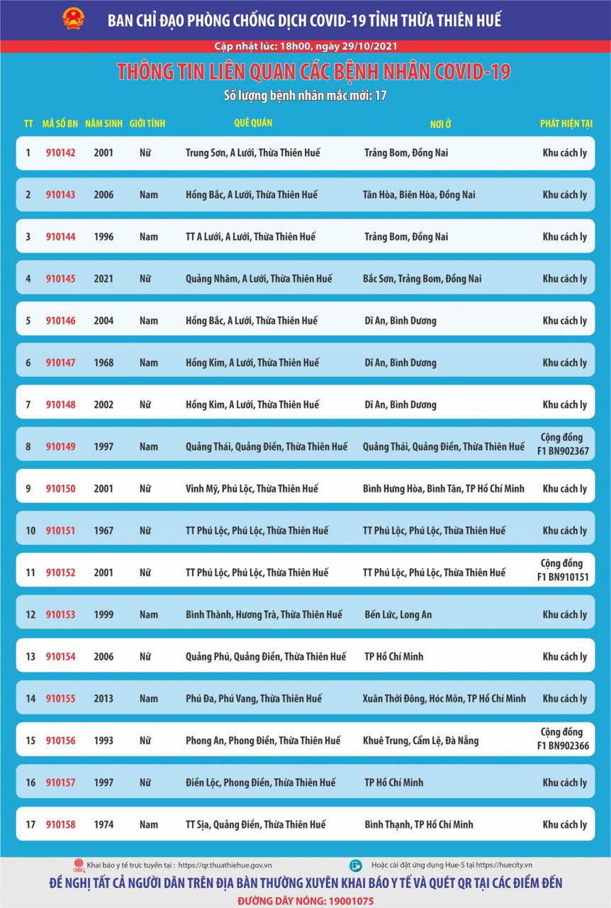 Ban chỉ đạo phòng chống dịch Covid-19 tỉnh Thừa Thiên Huế thông tin liên quan đến các bệnh nhân mắc Covid-19 ( cập nhật lúc 18 giờ ngày 29 tháng 10 năm 2021)