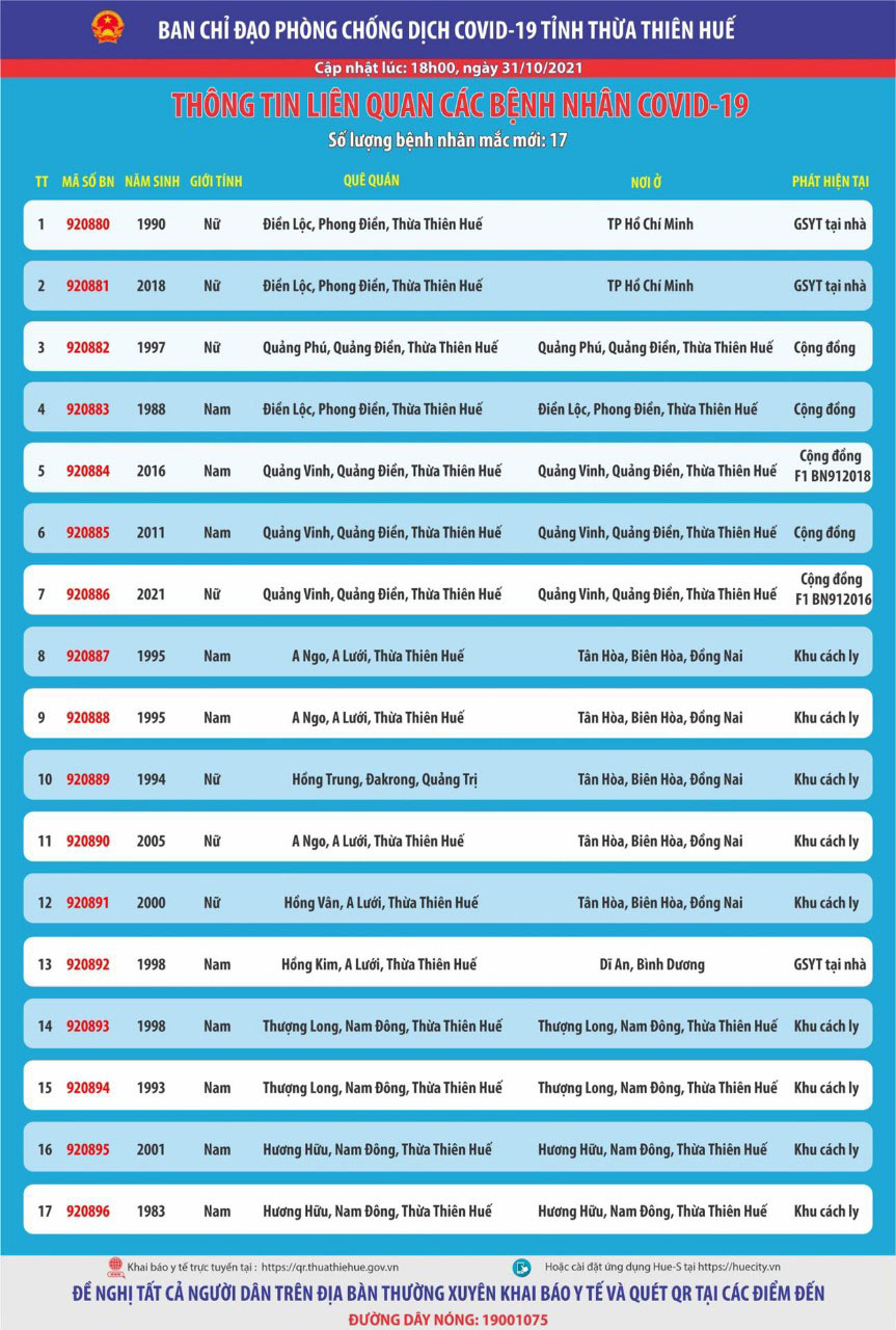 Ban chỉ đạo phòng chống dịch Covid-19 tỉnh Thừa Thiên Huế thông tin liên quan đến các bệnh nhân mắc Covid-19 (cập nhật lúc 18 giờ ngày 31 tháng 10 năm 2021)