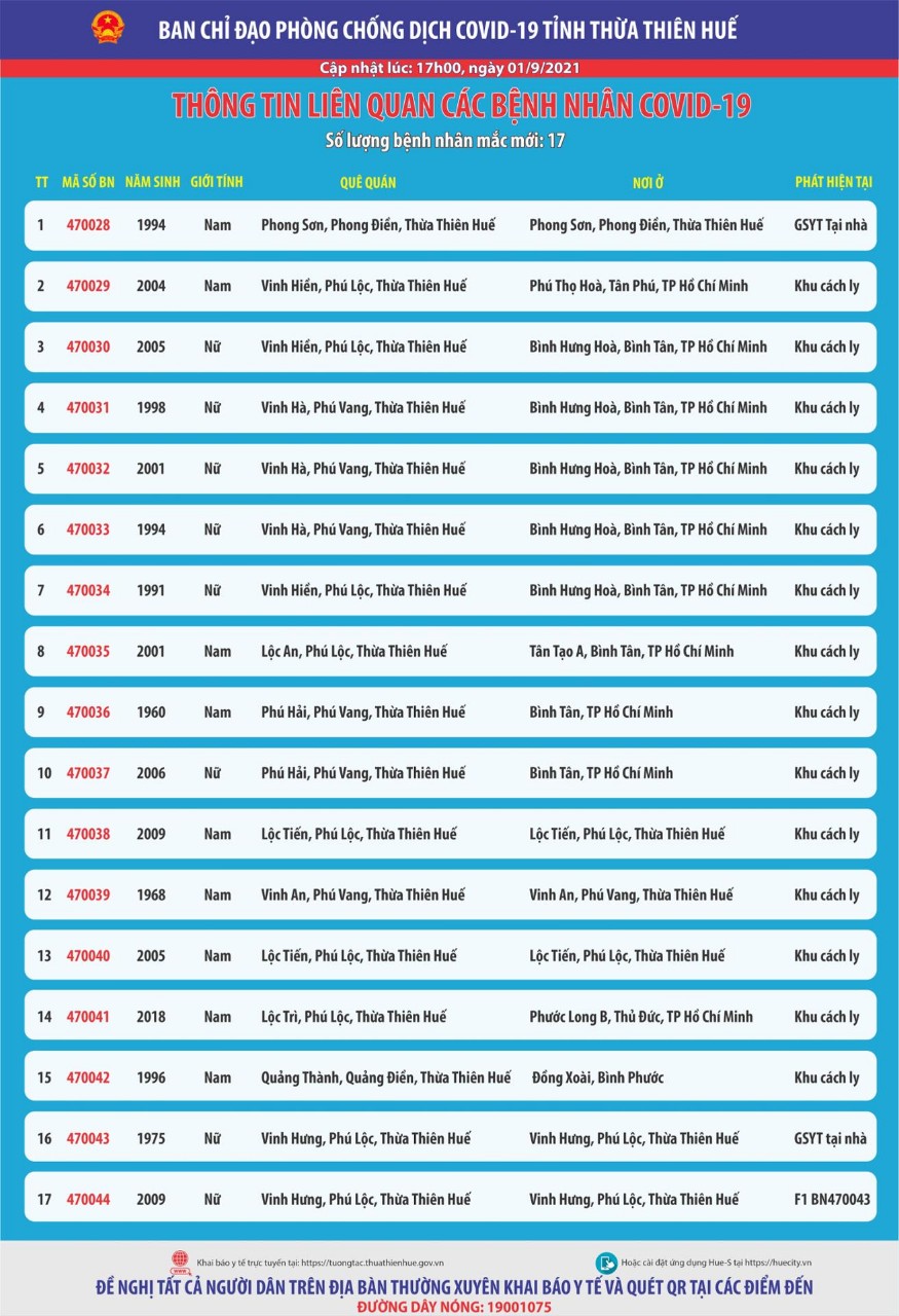 Thông báo của Ban chỉ đạo phòng chống dịch Covid-19 tỉnh Thừa Thiên Huế (cập nhật lúc 17h00 ngày 01 tháng 9 năm 2021). Thông tin liên quan các bệnh nhân Covid-19 Số lượng bệnh nhân mắc mới: 17