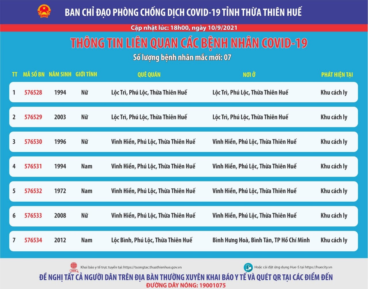 Thông báo của Ban chỉ đạo phòng chống dịch bệnh Covid-19 tỉnh Thừa Thiên Huế ( cập nhật lúc 18 giờ ngày 10 tháng 9 năm 2021) . Thông tin liên quan các bệnh nhân Covid-19 Số lượng bệnh nhân mắc mới : 07