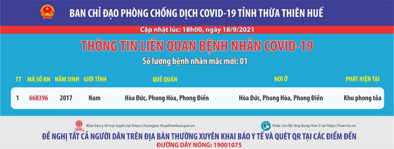 Ban chỉ đạo phòng chống dịch Covid-19 tỉnh Thừa Thiên Huế thông tin liên quan đến các bệnh nhân mắc Covid-19 ( cập nhật lúc 18 giờ ngày 18 tháng 9 năm 2021) Số lượng bệnh nhân mắc mới : 01