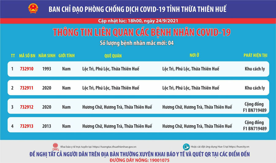 Ban chỉ đạo phòng chống dịch Covid-19 tỉnh Thừa Thiên Huế thông tin liên quan đến các bệnh nhân mắc Covid-19 ( cập nhật lúc 18 giờ ngày 24 tháng 9 năm 2021) Số lượng bệnh nhân mắc mới : 04