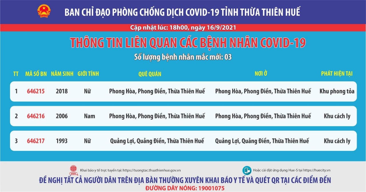 Ban chỉ đạo phòng chống dịch Covid-19 tỉnh Thừa Thiên Huế thông tin liên quan đến các bệnh nhân mắc Covid-19 (cập nhật lúc 18 giờ ngày 16 tháng 9 năm 2021) Số lượng bệnh nhân mắc mới : 03