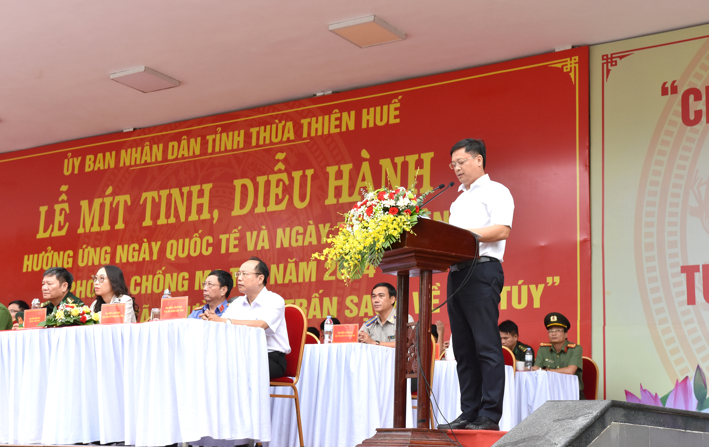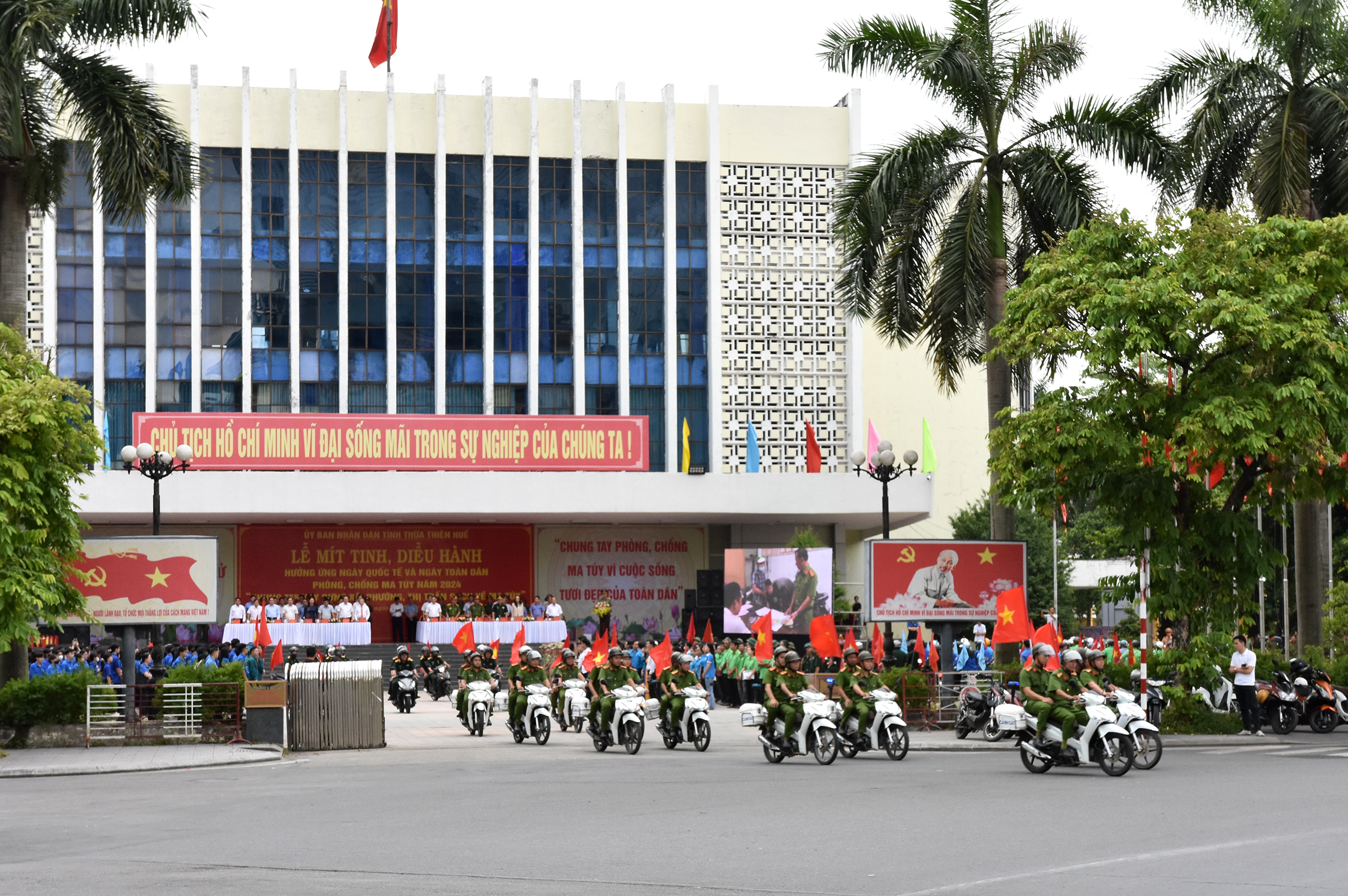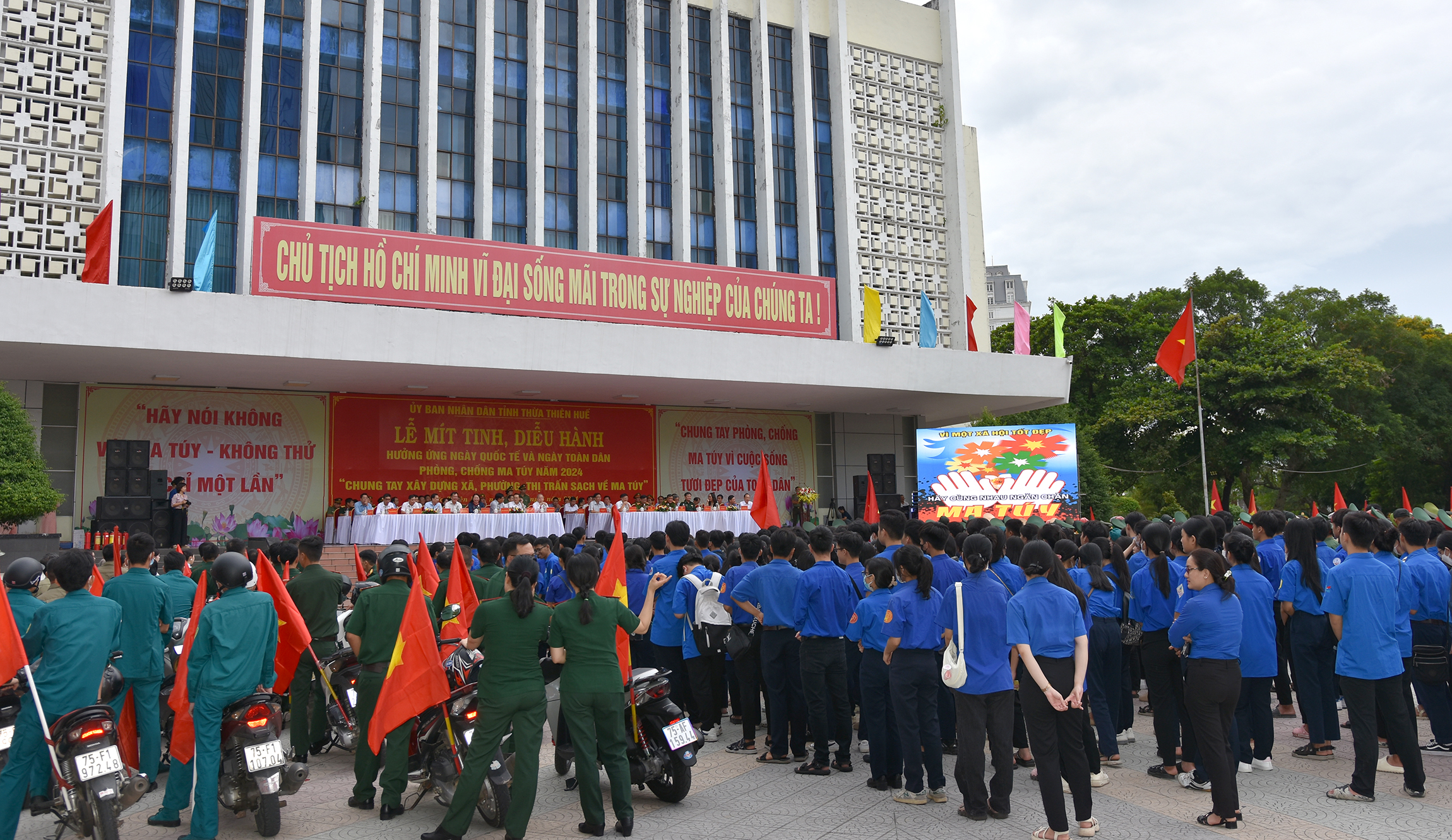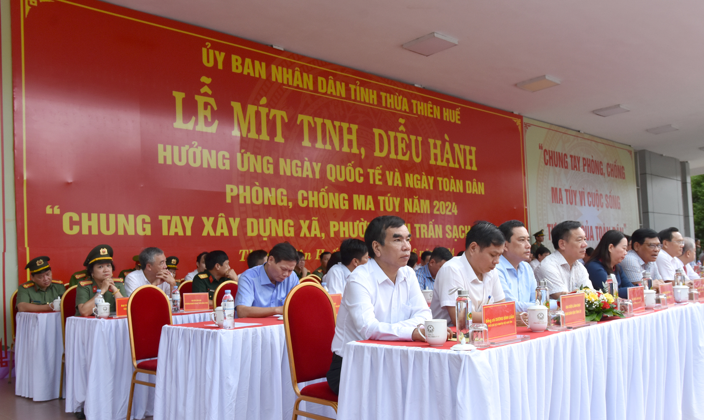 Sáng ngày 26/6/2024 tại Trung tâm Văn hóa và Điện ảnh, UBND tỉnh tổ chức Lễ mitting, diễu hành hưởng ứng “Ngày Quốc tế và Ngày toàn dân phòng, chống ma túy 26/6”. Tham dự lễ mitting có Thường trực Tỉnh ủy, HĐND tỉnh, Đoàn Đại biểu Quốc hội, UBMTTQ Việt Nam tỉnh, đại diện lãnh đạo các Ban/Ngành, Cơ quan/Đoàn thể cấp tỉnh, Bộ Chỉ huy Quân sự, Bộ Chỉ huy Bộ đội biên phòng tỉnh, các thành viên Ban Chỉ đạo Phòng chống tội phạm, tệ nạn xã hội và xây dựng phong trào Toàn dân bảo vệ ANTQ tỉnh Thừa Thiên Huế (BCĐ 138 tỉnh), lãnh đạo UBND các huyện/thị xã/thành phố cùng hơn 800 người của các ban ngành/đoàn thể, lực lượng Công an, Quân đội, Dân quân tự vệ.
