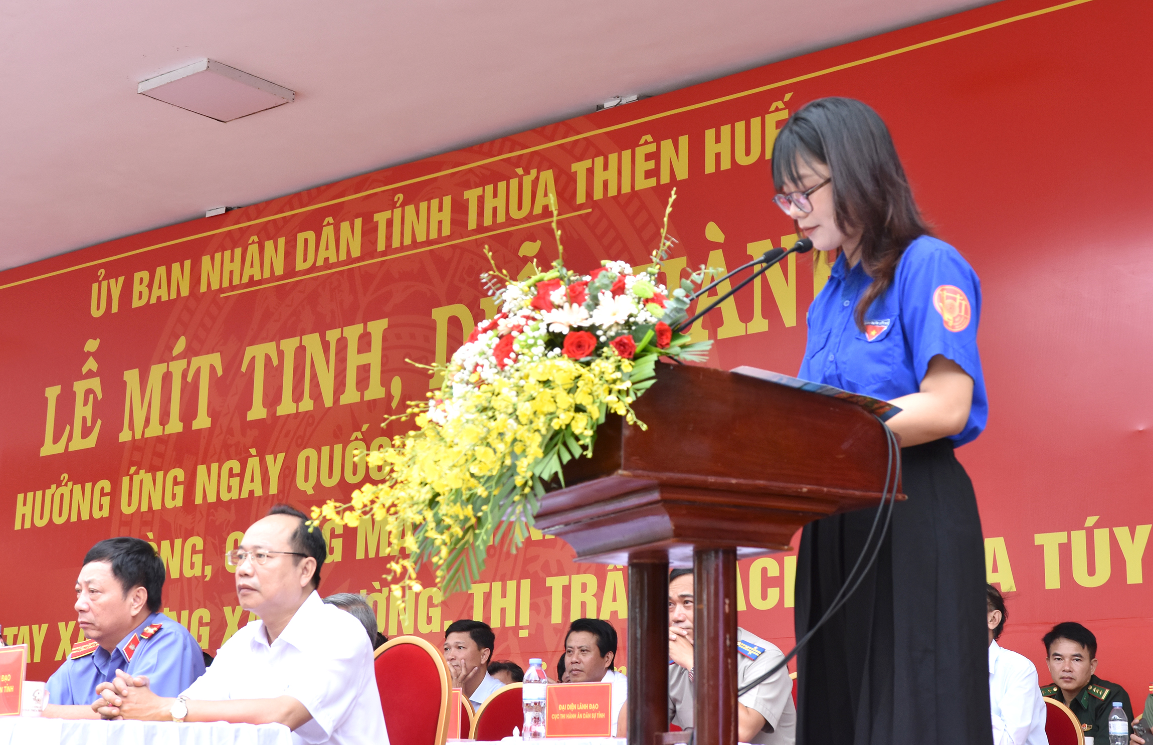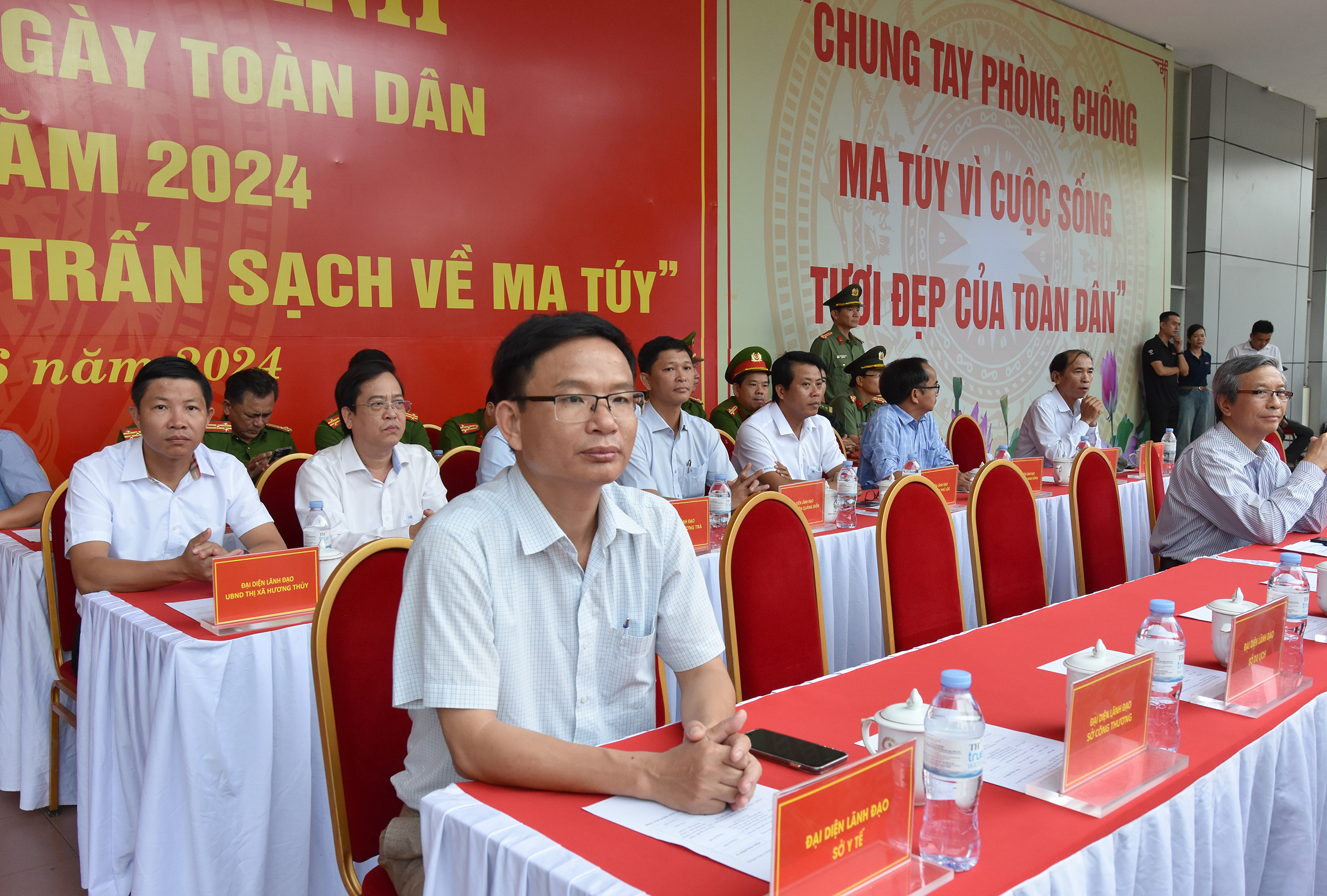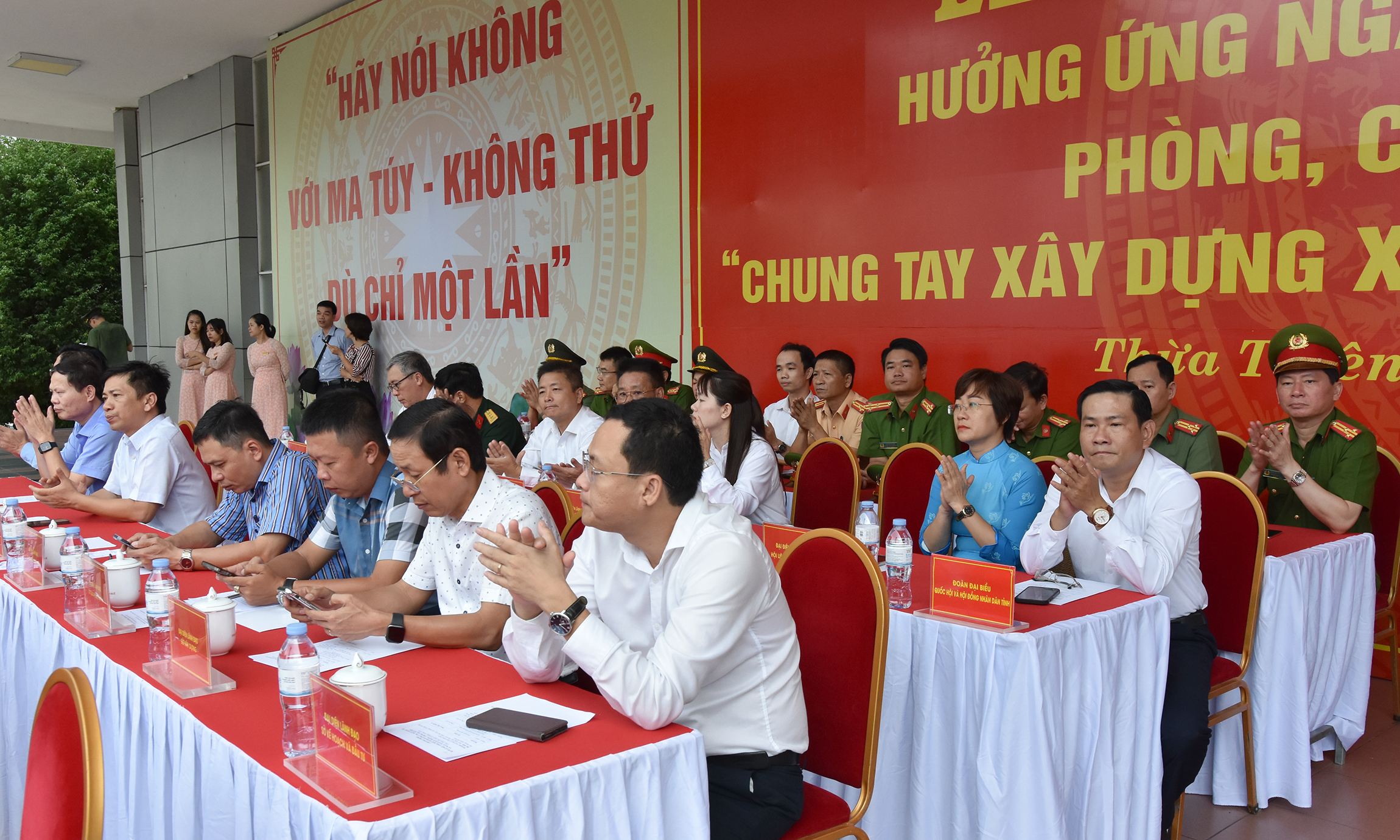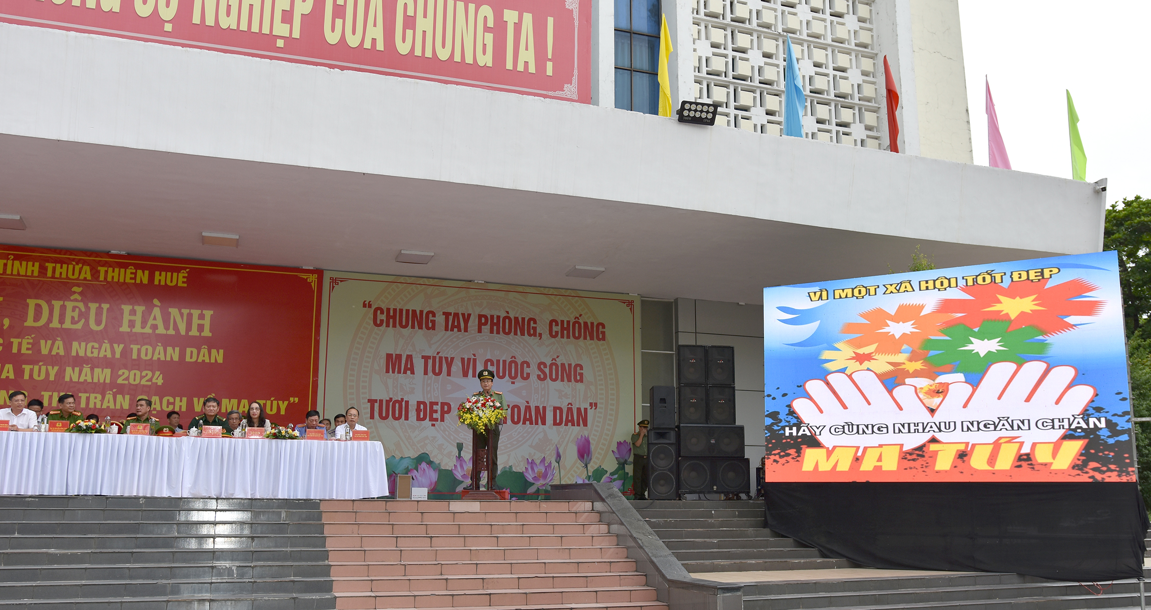 Sáng ngày 26/6/2024 tại Trung tâm Văn hóa và Điện ảnh, UBND tỉnh tổ chức Lễ mitting, diễu hành hưởng ứng “Ngày Quốc tế và Ngày toàn dân phòng, chống ma túy 26/6”. Tham dự lễ mitting có Thường trực Tỉnh ủy, HĐND tỉnh, Đoàn Đại biểu Quốc hội, UBMTTQ Việt Nam tỉnh, đại diện lãnh đạo các Ban/Ngành, Cơ quan/Đoàn thể cấp tỉnh, Bộ Chỉ huy Quân sự, Bộ Chỉ huy Bộ đội biên phòng tỉnh, các thành viên Ban Chỉ đạo Phòng chống tội phạm, tệ nạn xã hội và xây dựng phong trào Toàn dân bảo vệ ANTQ tỉnh Thừa Thiên Huế (BCĐ 138 tỉnh), lãnh đạo UBND các huyện/thị xã/thành phố cùng hơn 800 người của các ban ngành/đoàn thể, lực lượng Công an, Quân đội, Dân quân tự vệ.