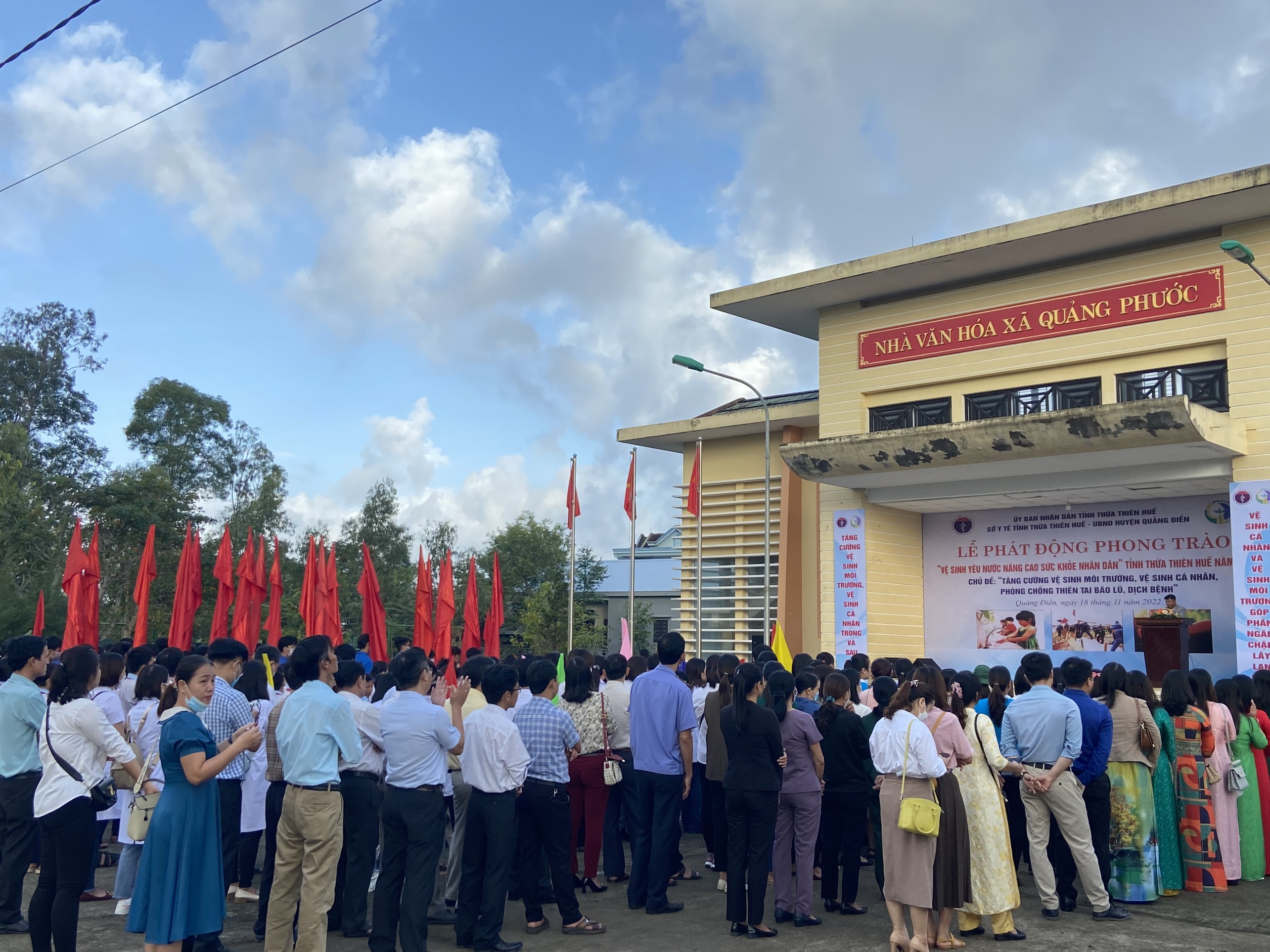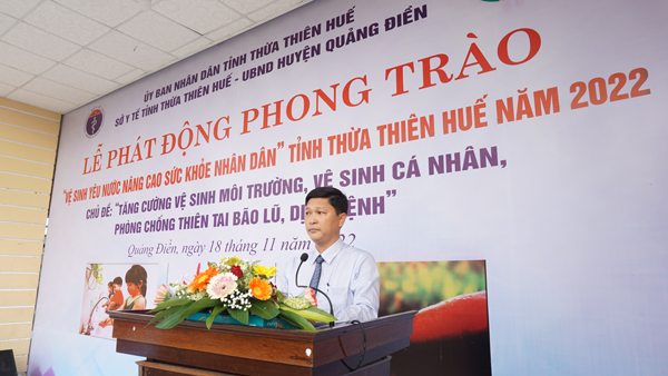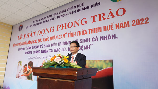Sáng ngày 18/11/2022, tại huyện Quảng Điền, Sở Y tế phối hợp với UBND huyện Quảng Điền tổ chức lễ phát động Phong trào “Vệ sinh yêu nước nâng cao sức khỏe Nhân dân” năm 2022 với chủ đề: “Tăng cường vệ sinh môi trường, vệ sinh cá nhân, phòng, chống thiên tai bão lũ, dịch bệnh” tại nhà văn hóa xã Quảng Phước, huyện Quảng Điền. Tham dự buổi lễ có đồng chí Hoàng Trọng Quý - Phó Giám đốc Sở Y tế tỉnh Thừa Thiên Huế; đồng chí Trương Duy Hải – Phó Bí thư Thường trực, Chủ tịch HĐND huyện Quảng Điền; đồng chí Nguyễn Tuấn Anh - Phó Chủ tịch huyện Quảng Điền; Đồng chí Phan Cảnh Ngưu - Chủ tịch Ủy ban MTTQ Việt Nam huyện Quảng Điền và các đồng chí lãnh đạo các cơ quan, ban ngành đoàn thể trên địa bàn huyện; các phòng chuyên môn của Sở Y tế, ban lãnh đạo Trung tâm Kiểm soát bệnh tật tỉnh, lãnh đạo 9 TTYT huyện, thị xã, thành phố, cơ quan truyền thông, cùng với sự tham gia hưởng ứng khoảng 400 học sinh, cán bộ viên chức, lực lượng vũ trang nhân dân, đoàn viên thanh niên trên địa bàn huyện.