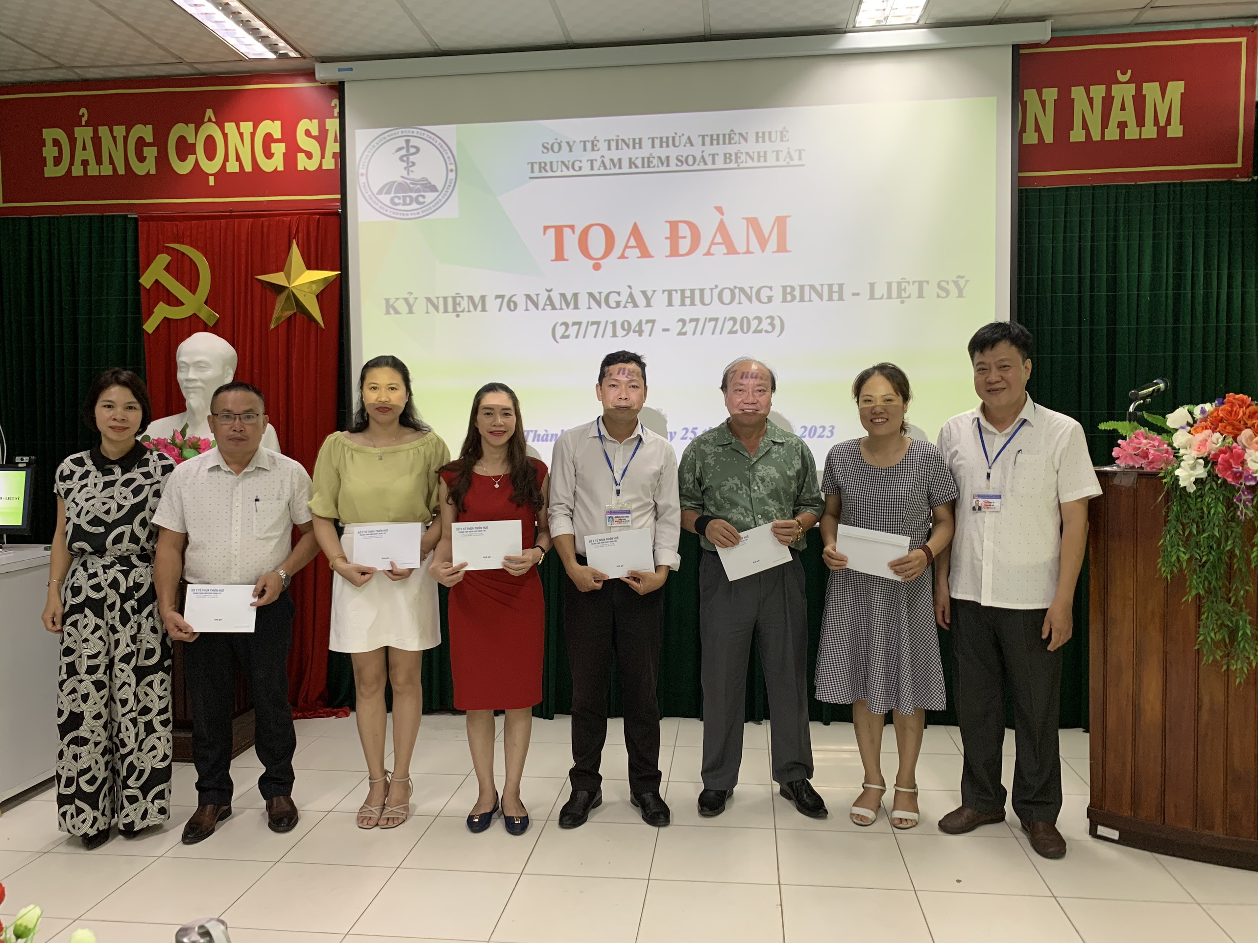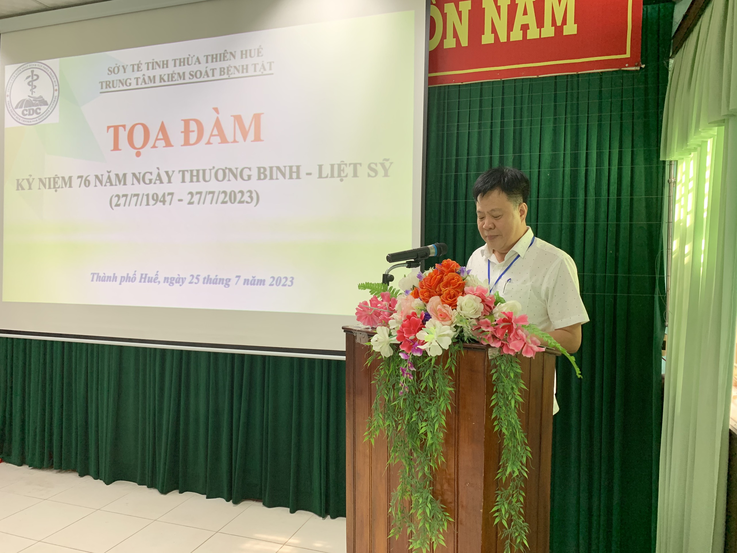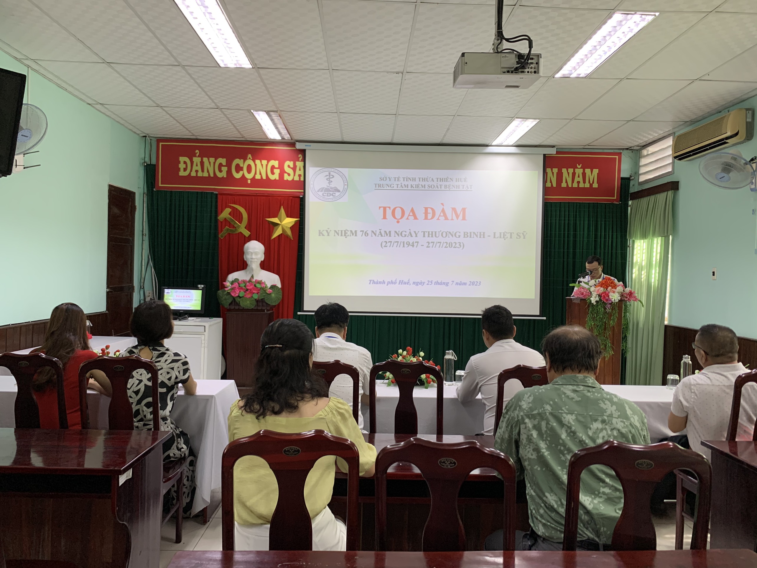 Thực hiện Kế hoạch số 853/KH-KSBT ngày 06 tháng 7 năm 2023 của Trung tâm Kiểm soát bệnh tật tỉnh về tổ chức các hoạt động kỷ niệm 76 năm Ngày Thương binh - Liệt sỹ (27/7/1947-27/7/2023). Vào chiều ngày 25/7/2023, Trung tâm Kiểm soát bệnh tật tỉnh Thừa Thiên Huế tổ chức tọa đàm, gặp mặt nhân dịp kỷ niệm 76 năm ngày Thương binh - Liệt sĩ (27/7/1947 - 27/7/2023). Đến tham dự buổi tọa đàm có ThSBS. Hồ Xuân Vũ - Phó Giám đốc Trung tâm Kiểm soát bệnh tật tỉnh, đại diện Ban chấp hành Công đoàn cơ sở, đại diện Ban chấp hành Đoàn thanh niên và viên chức, người lao động là thương binh, con liệt sĩ, con thương binh đang công tác tại đơn vị.