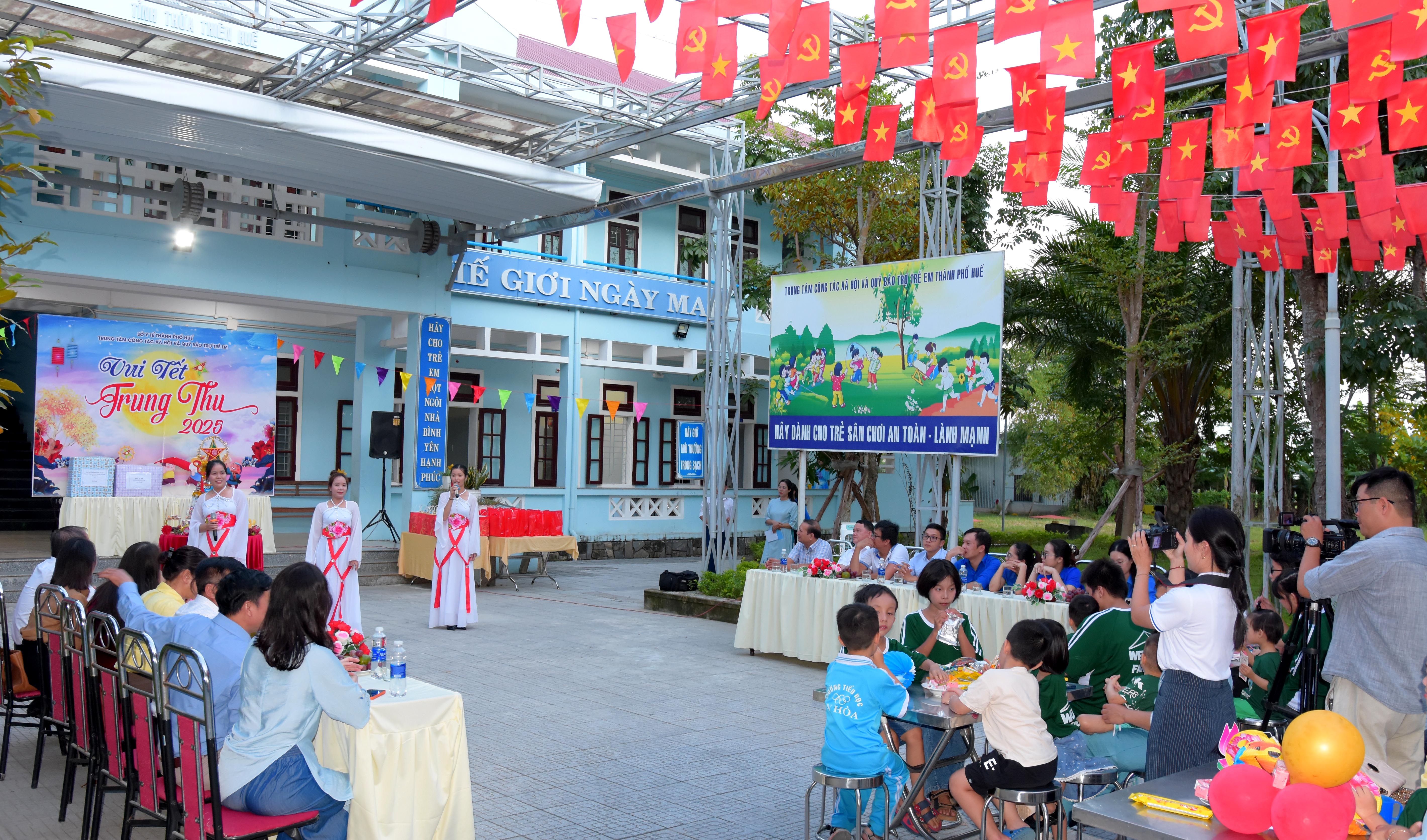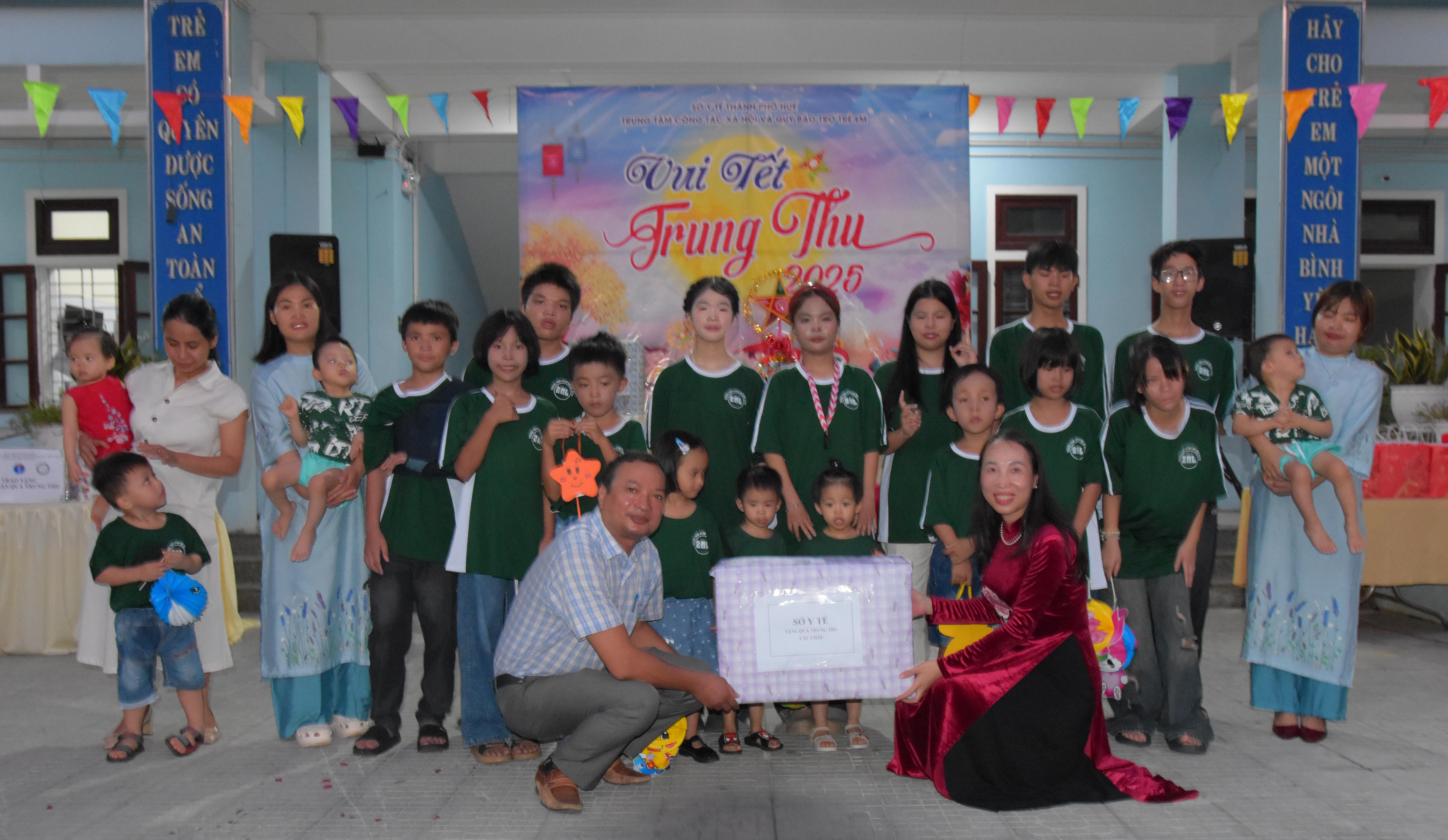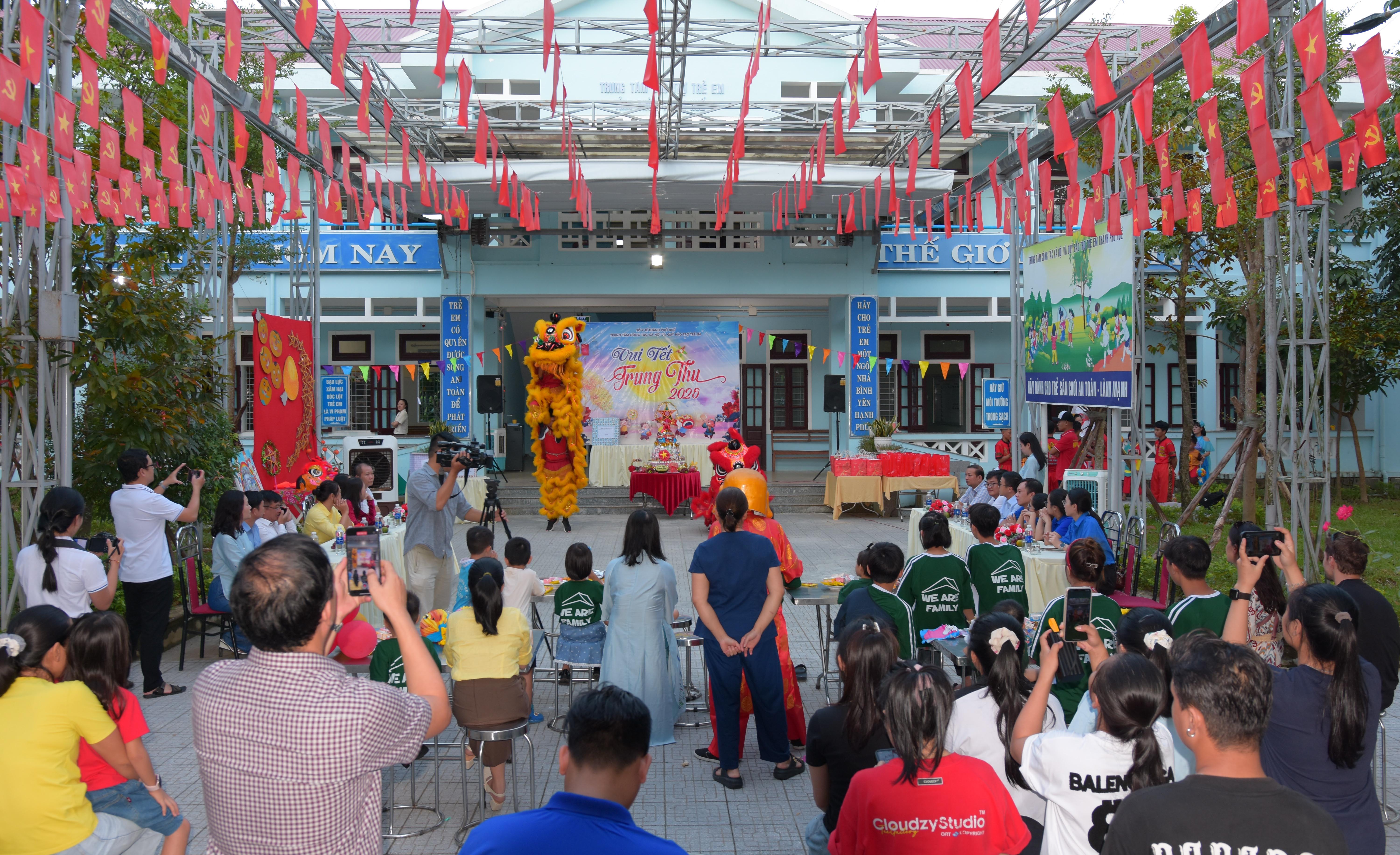 Tham dự chương trình “Vui Tết Trung thu - 2025” với các cháu có ThS. Phan Minh Nguyệt - Phó Giám đốc Sở Y tế; ông Bùi Sĩ Tuấn - Phó Cục trưởng Cục Người có công - Bộ Nội vụ; đại diện lãnh đạo UBND phường Hương An, Phòng Bảo trợ xã hội, Phòng Dân số - Trẻ em Sở Y tế; các nhà tài trợ, sinh viên trường Đại học Khoa học Huế, Ban Giám đốc, lãnh đạo và nhân viên các phòng thuộc Trung tâm Công tác xã hội và Quỹ Bảo trợ trẻ em (Trung tâm) - Sở Y tế thành phố Huế.