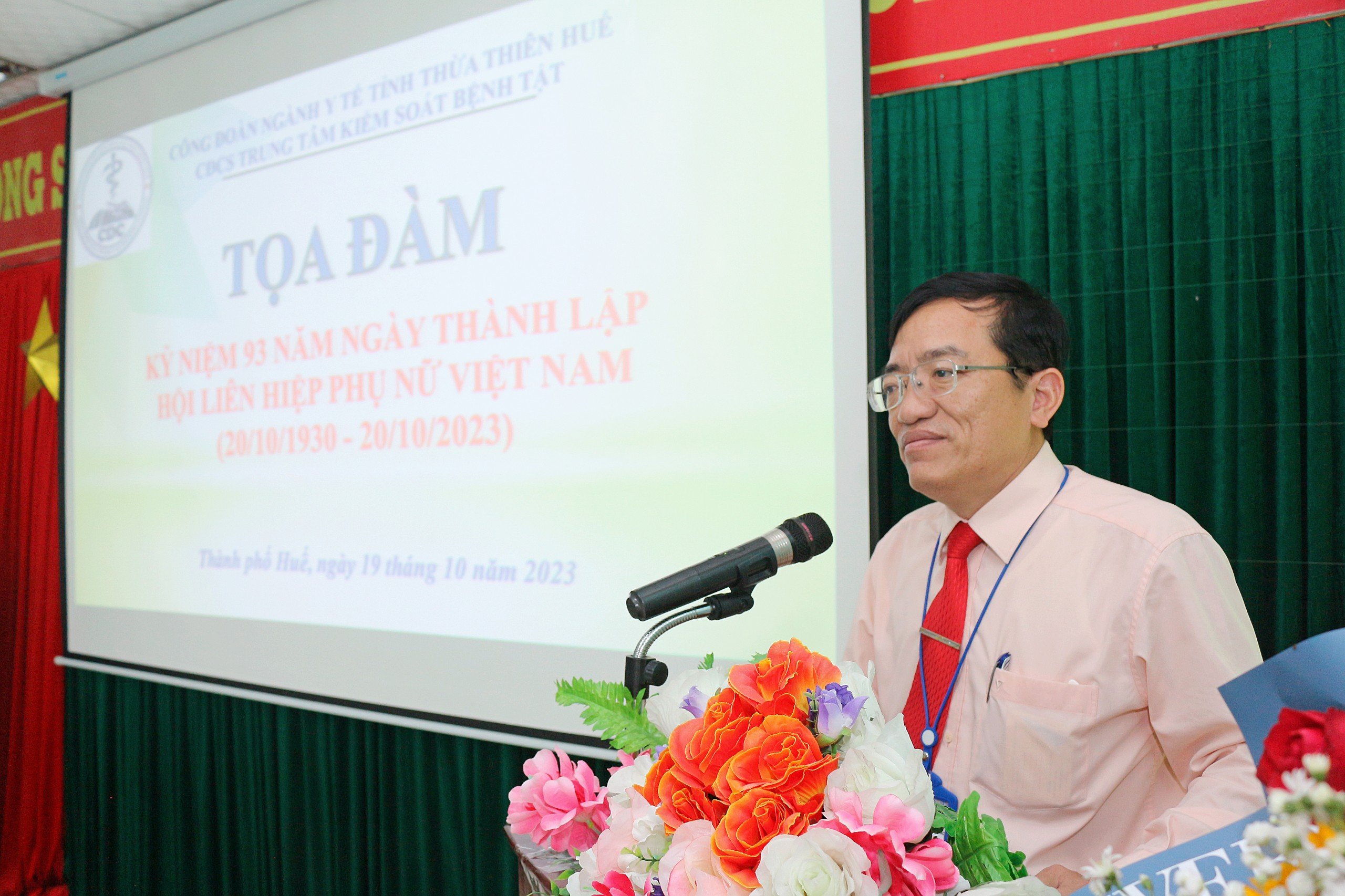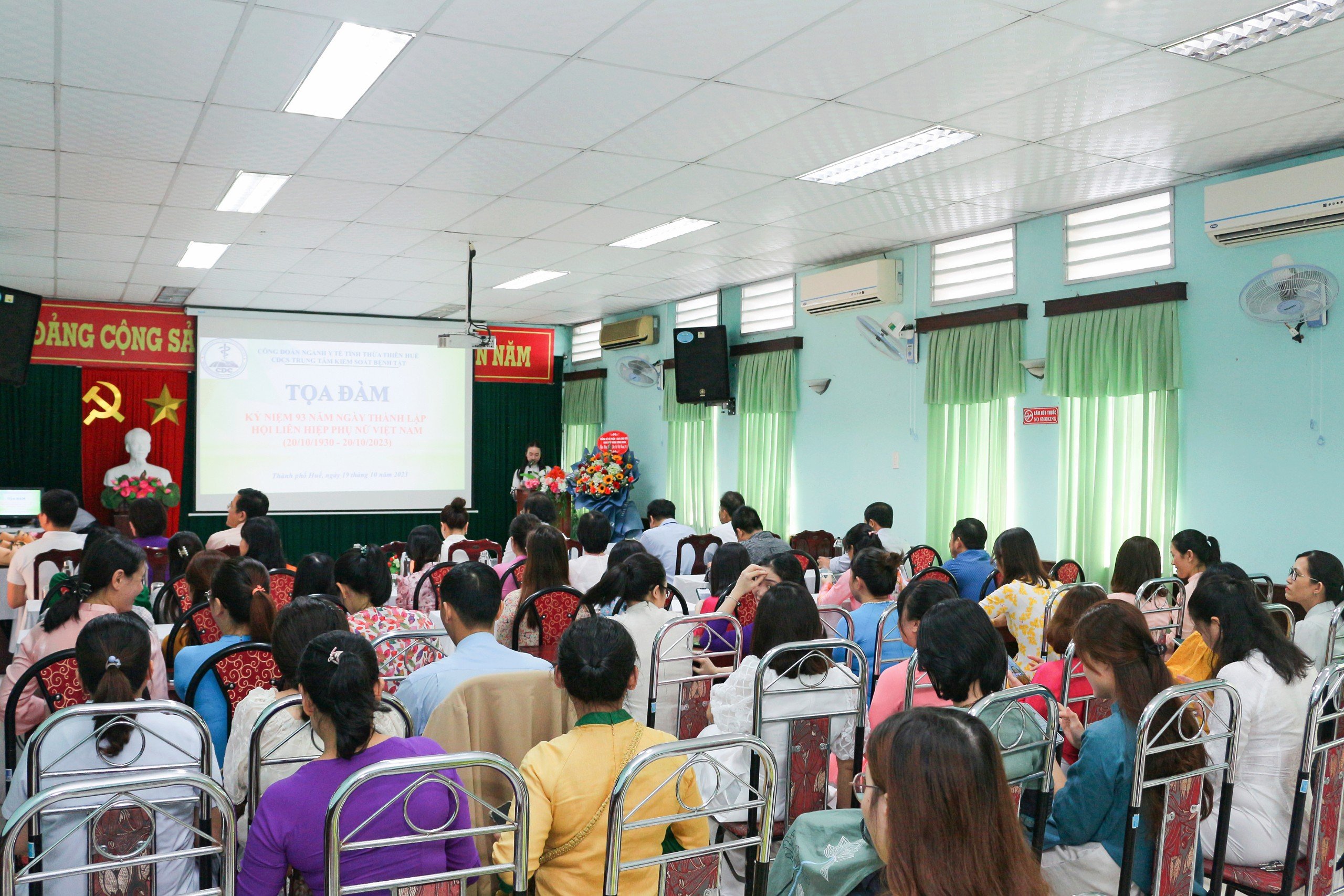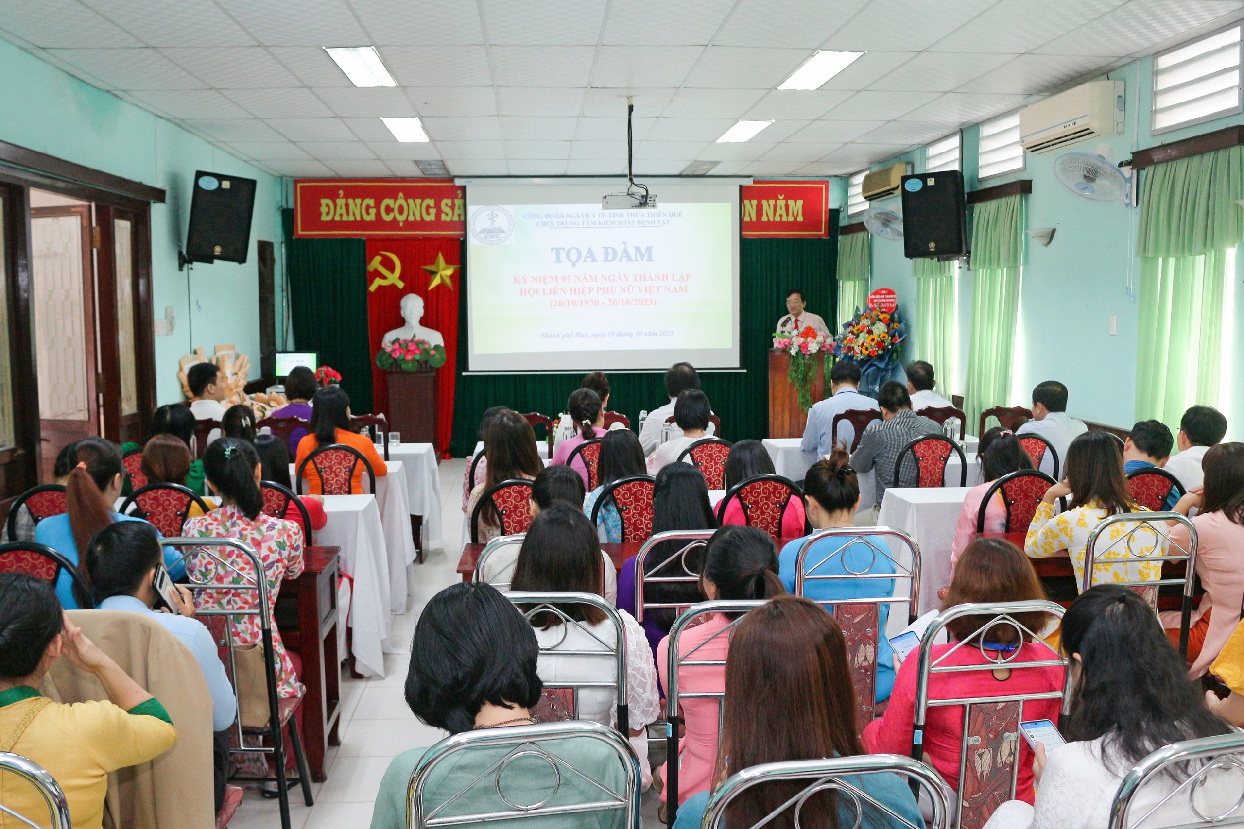 Chiều ngày 19/10/2023, tại hội trường Trung tâm Kiểm soát bệnh tật đã tổ chức tọa đàm kỷ niệm 93 năm ngày thành lập Hội Liên hiệp Phụ nữ Việt Nam (20/10/1930-20/10/2023). Đến tham dự buổi tọa đàm có ThS.BSCII. Nguyễn Lê Tâm - Phó Giám đốc phụ trách, BSCKII. Hoàng Văn Thám - Phó Giám đốc, ThS.BS. Hồ Xuân Vũ - Phó Giám đốc; Ban chấp hành Công đoàn, Tổ trưởng Công đoàn, đại diện lãnh đạo các Khoa, Phòng, Bí thư đoàn Thanh niên và toàn thể nữ viên chức, người lao động Trung tâm Kiểm soát bệnh tật tỉnh; ngoài ra tham dự buổi tọa đàm còn có ThS.BS Da liễu Lê Thị Cao Nguyên - Giám đốc Phòng Khám Akina Clinic.