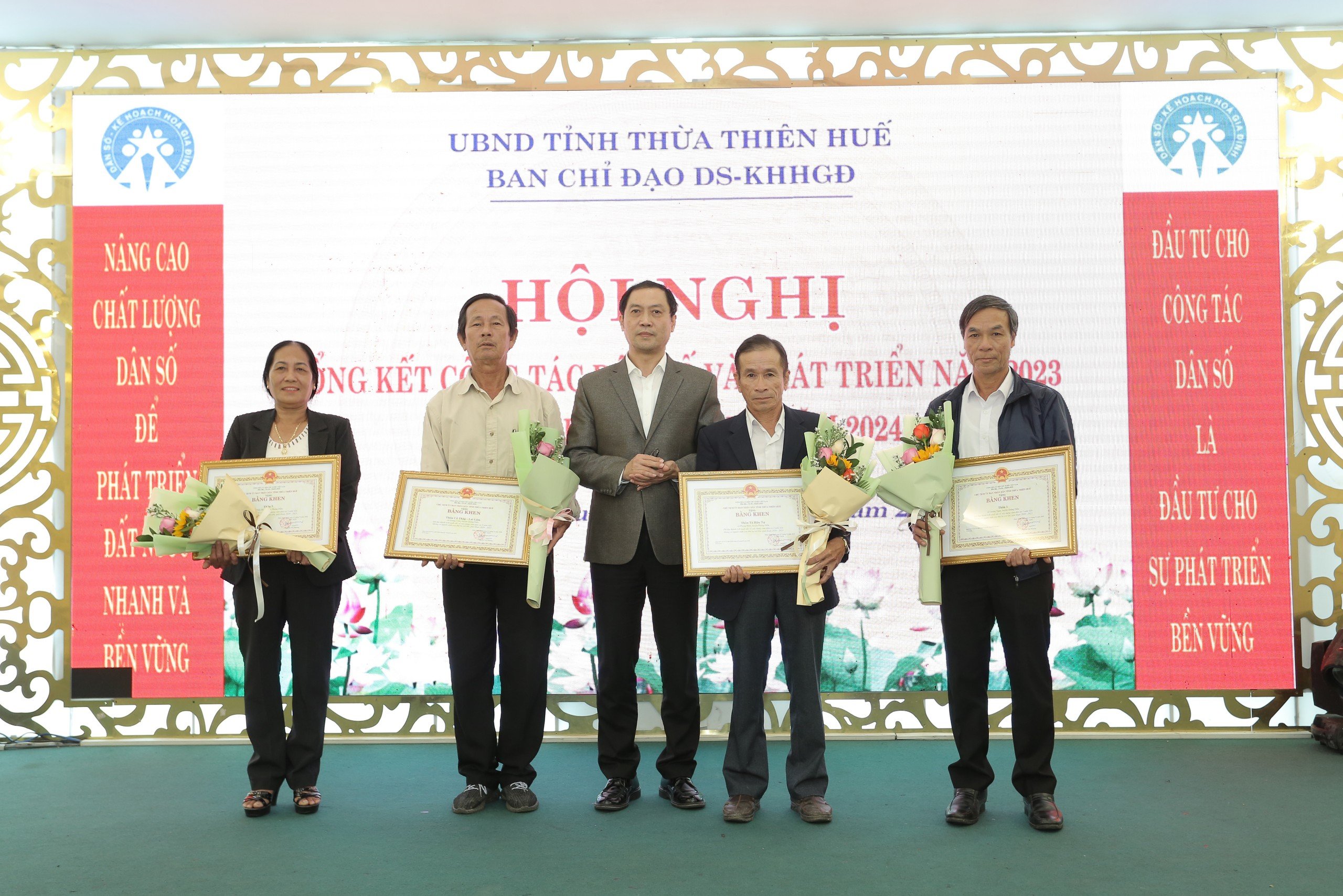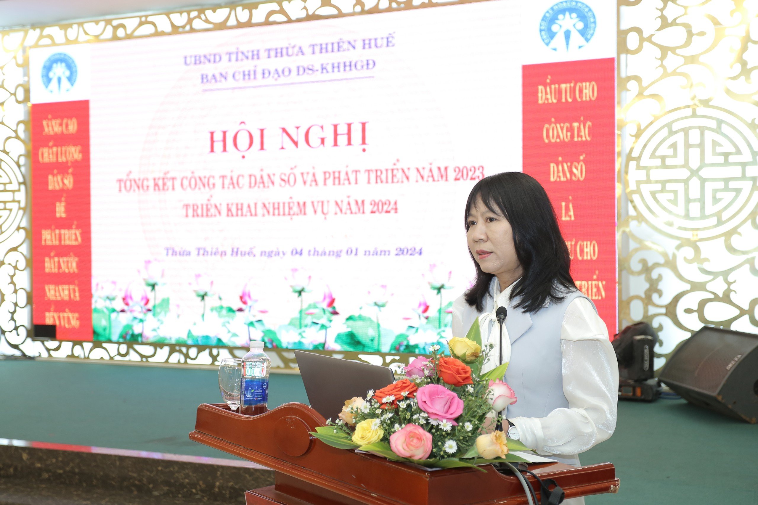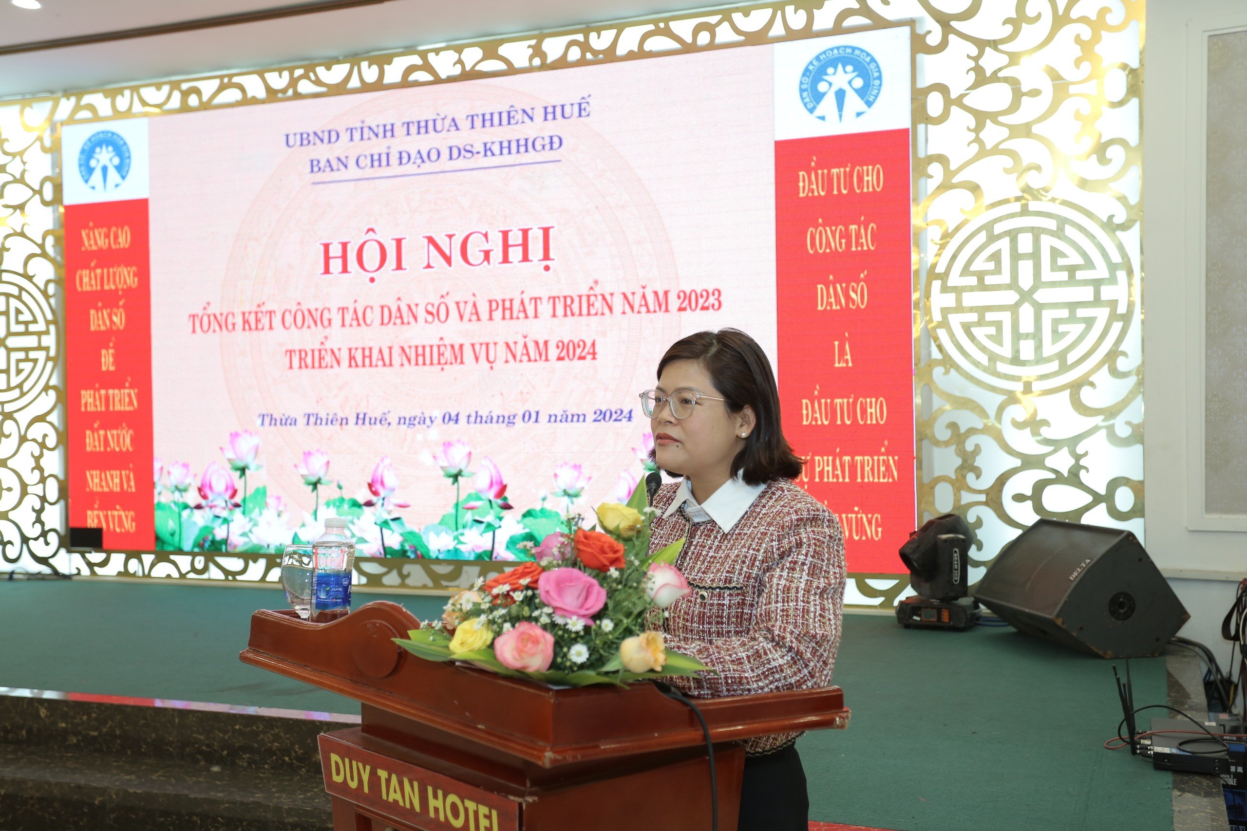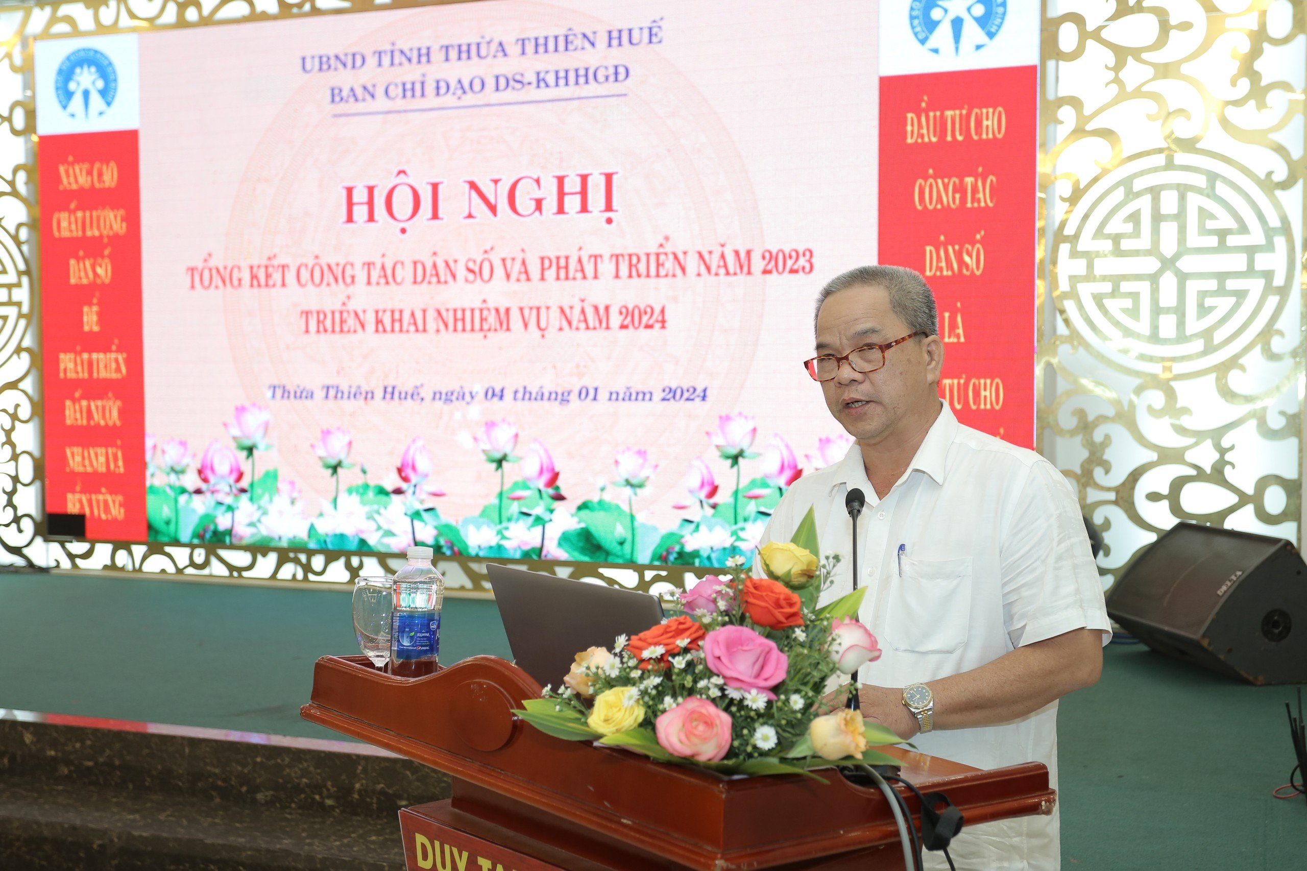 Chiều ngày 04/01/2024, được sự nhất trí của UBND tỉnh Thừa Thiên Huế, Ban chỉ đạo công tác DS-KHHGĐ đã tổ chức Hội nghị tổng kết công tác dân số và phát triển năm 2023, triển khai nhiệm vụ năm 2024. Đến tham dự và chỉ đạo Hội nghị có PGS.TS Trần Kiêm Hảo - Giám đốc Sở Y tế - Phó trưởng ban chỉ đạo công tác DS-KHHGĐ; đại diện lãnh đạo Uỷ ban Mặt trận Tổ quốc Việt Nam tỉnh, Ủy ban Kiểm tra Tỉnh ủy, Ban Tuyên giáo Tỉnh ủy, Ban Dân vận Tỉnh ủy, Ban Văn hóa xã hội - HĐND tỉnh, văn phòng UBND tỉnh; Bệnh viện Trung ương Huế, Trường Đại học Y Dược Huế, Trung tâm Sàng lọc - Chẩn đoán trước sinh và sơ sinh thuộc Trường Đại học Y dược Huế; các thành viên Ban chỉ đạo công tác DS-KHHGĐ tỉnh, Tổ giúp việc; Ban Dân tộc tỉnh; lãnh đạo Chi cục DS-KHHGĐ, các đơn vị trực thuộc ngành Y tế, Hội Kế hoạch hóa Gia đình tỉnh; UBND các huyện, thị xã, thành phố Huế và các tập thể, cá nhân có thành tích xuất sắc trong công tác dân số và phát triển trên địa bàn tỉnh.