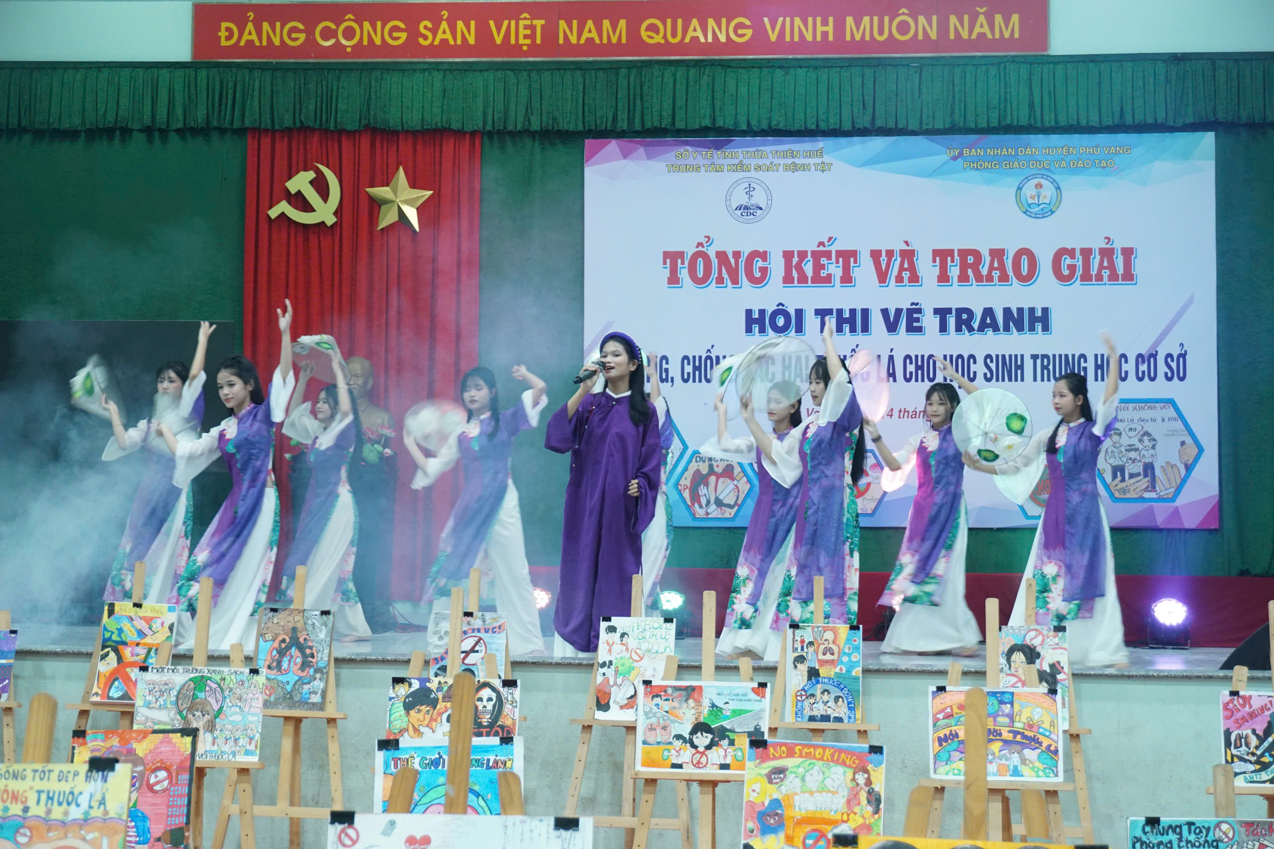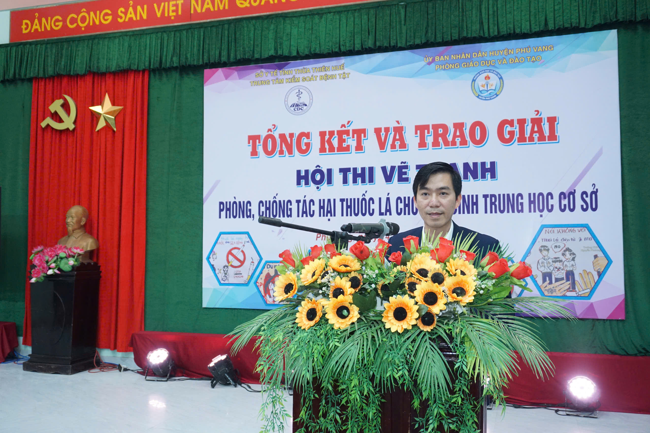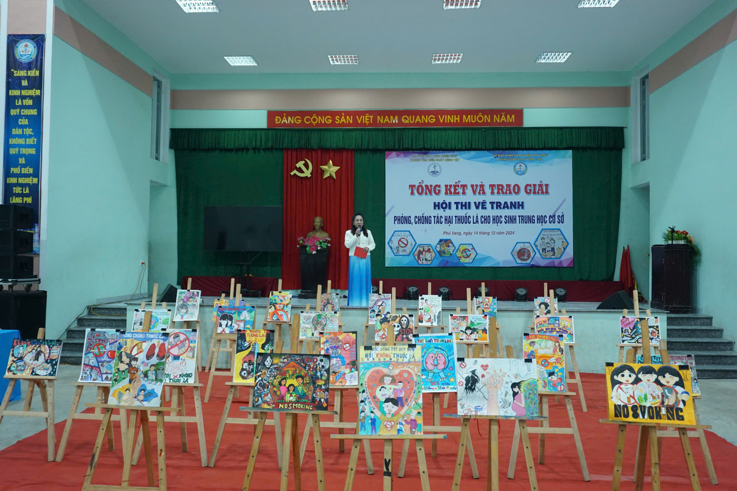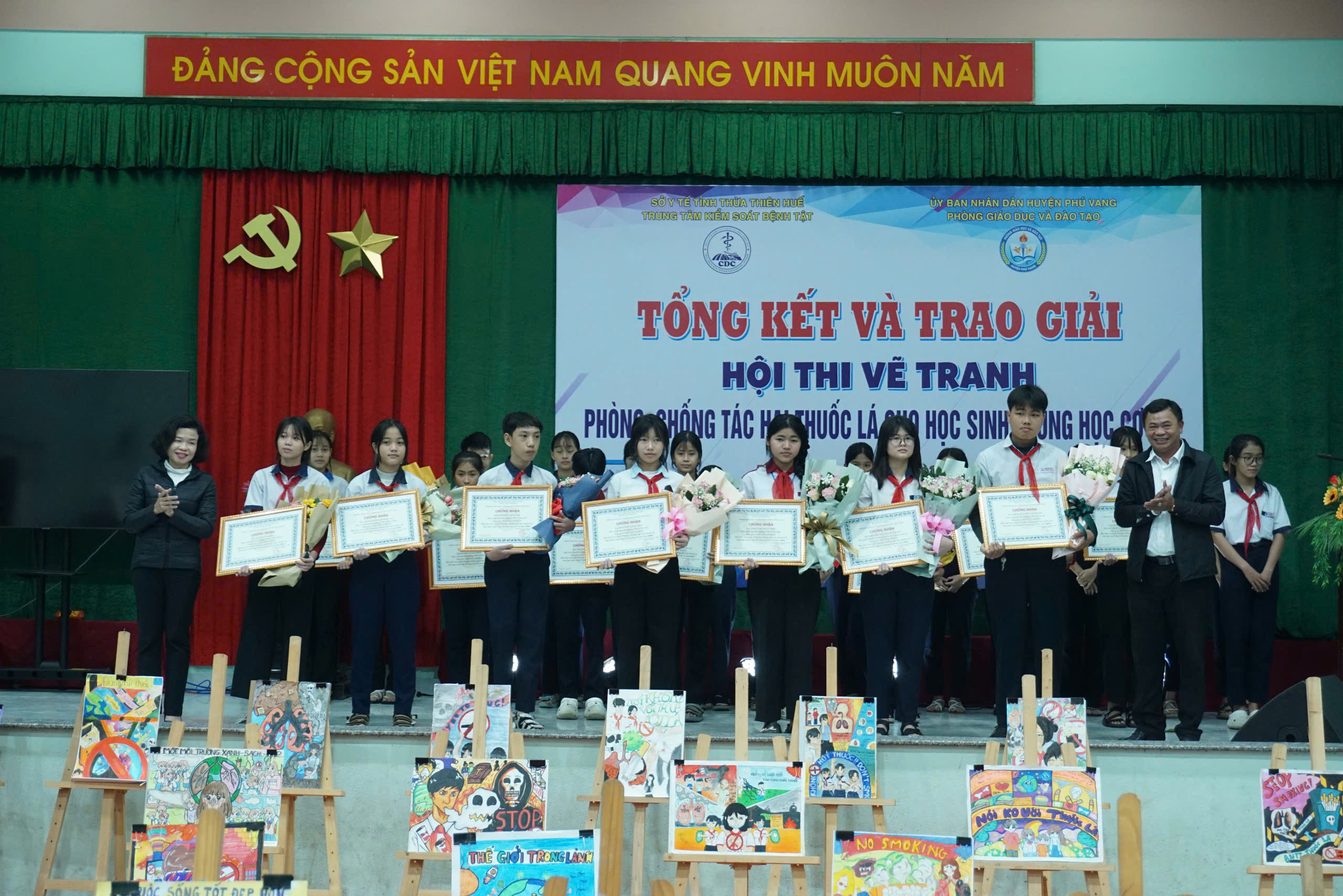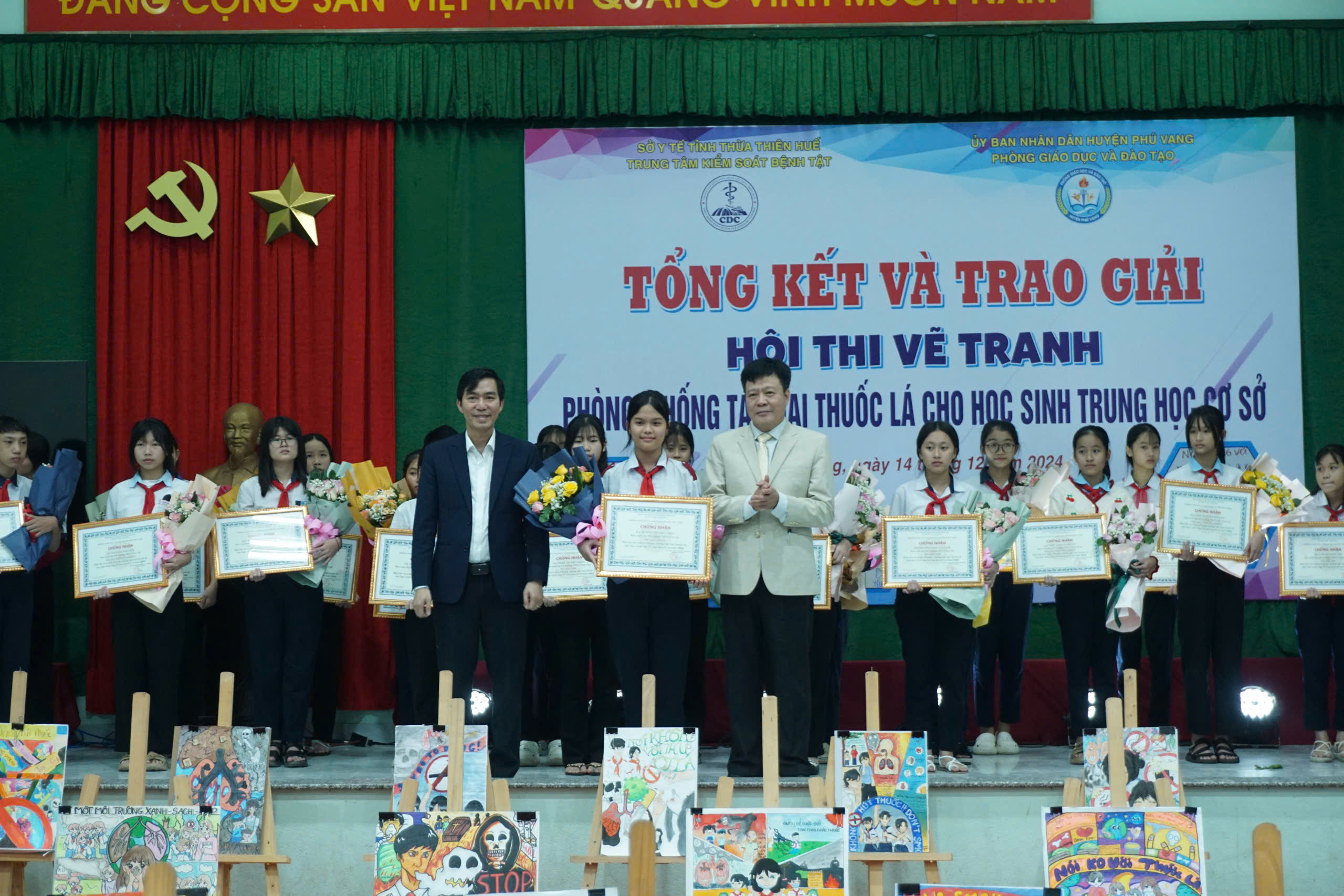 Chiều ngày 14/12/2024, Trung tâm Kiểm soát bệnh tật tỉnh Thừa Thiên Huế phối hợp với Phòng Giáo dục và Đào tạo huyện Phú Vang tổ chức tổng kết, trao giải Hội thi vẽ tranh phòng, chống tác hại thuốc lá cho học sinh trung học cơ sở năm 2024. Đến tham dự có ThS.BS Hồ Xuân Vũ - Phó Giám đốc Trung tâm KSBT tỉnh, Khoa TTGDSK; đại diện lãnh đạo UBND huyện Phú Vang, Phòng GD&ĐT, Trung tâm Y tế, Ban Giám khảo Hội thi, đại diện Ban Giám hiệu, giáo viên - Tổng phụ trách Đội, các tập thể, học sinh đạt giải, học sinh các trường THCS và các ban, ngành, đoàn thể có liên quan trên địa bàn huyện Phú Vang.