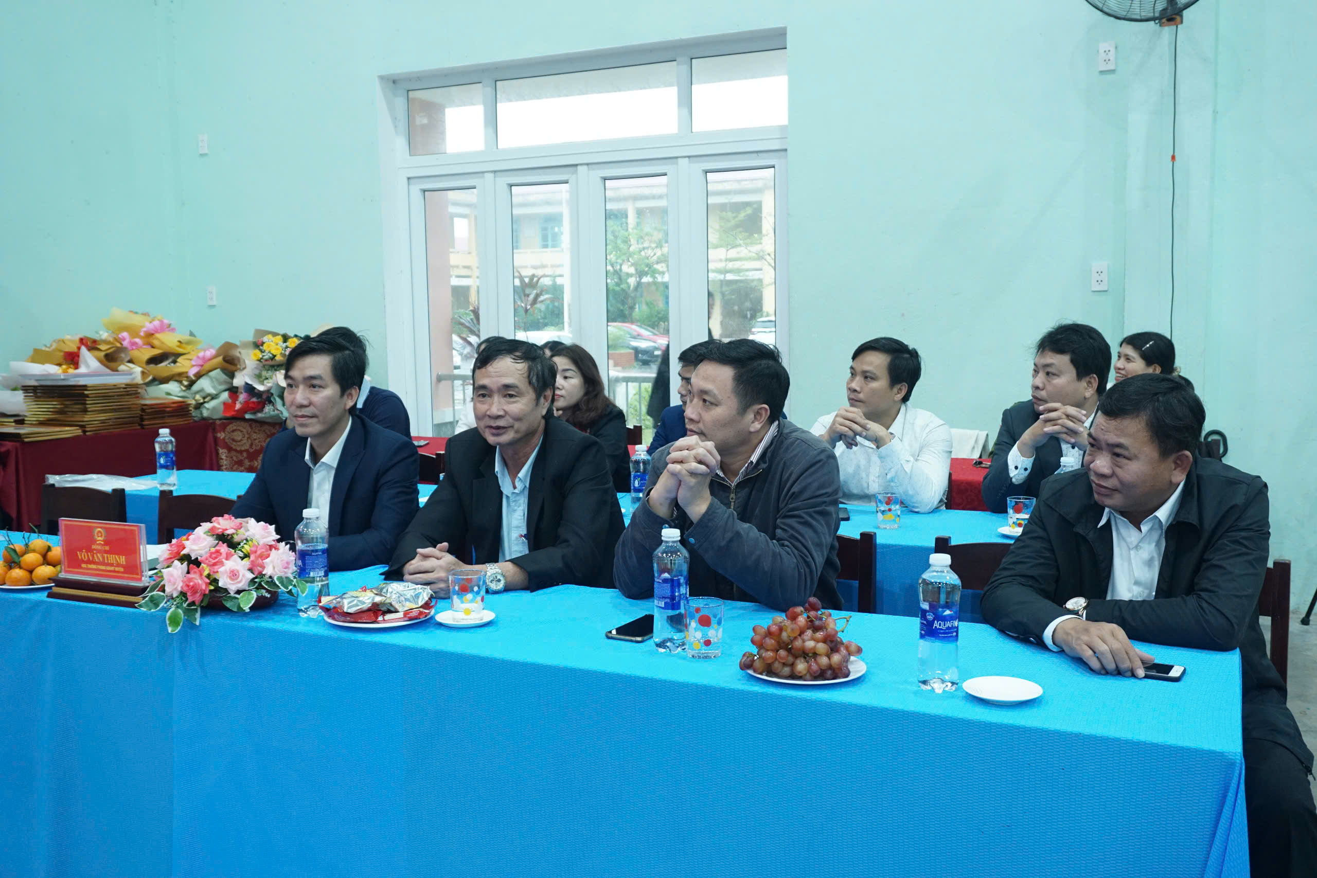 ThS.BS Hồ Xuân Vũ - Phó Giám đốc Trung tâm KSBT tỉnh và ông Võ Văn Thịnh - Trưởng Phòng GD&ĐT huyện Phú Vang tặng hoa, trao giấy chứng nhận cho các Tập thể xuất sắc.