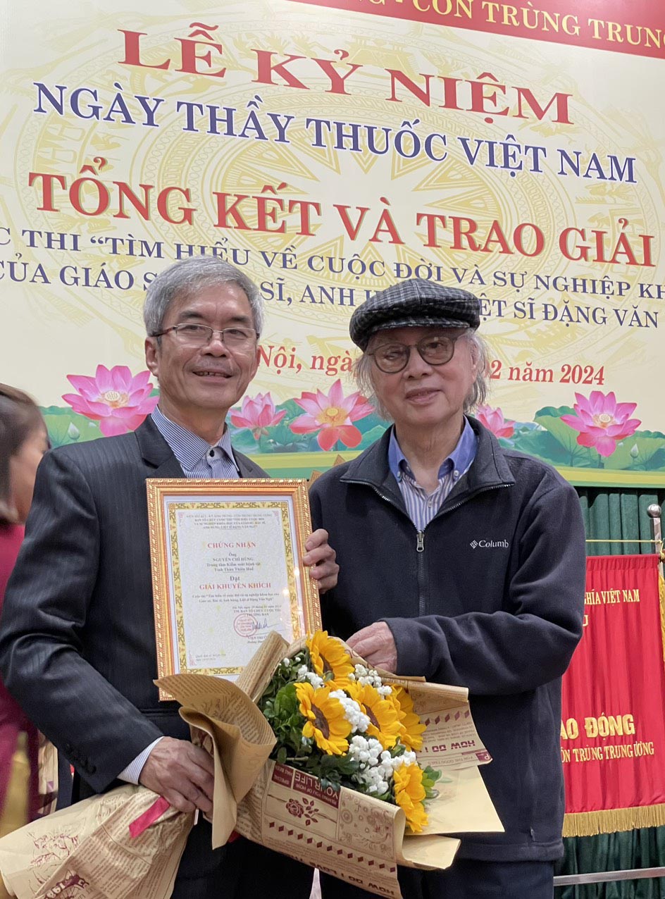 Viên chức Nguyễn Chí Hùng - Trung tâm Kiểm soát bệnh tật Thừa Thiên Huế nhận giải từ Ban Tổ chức và chụp ảnh lưu niệm cùng NSND Đặng Nhật Minh (con trai của Cố GS-BS-AH-LS Đặng Văn Ngữ).