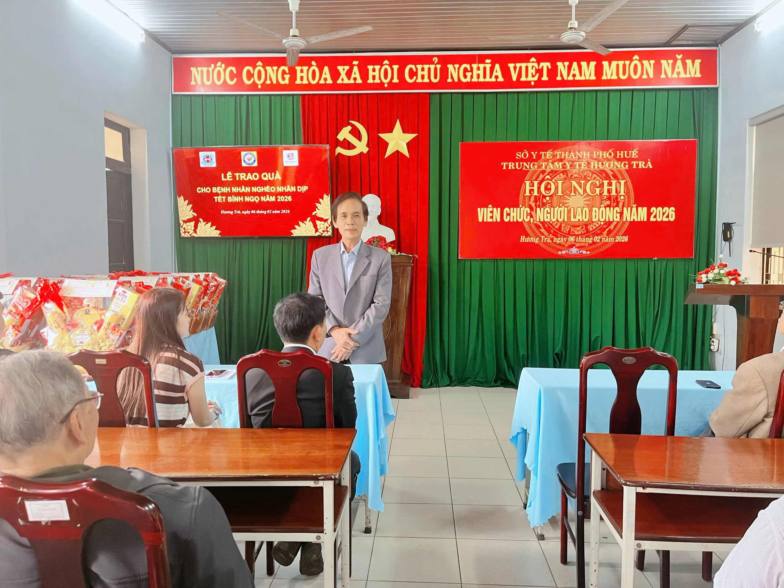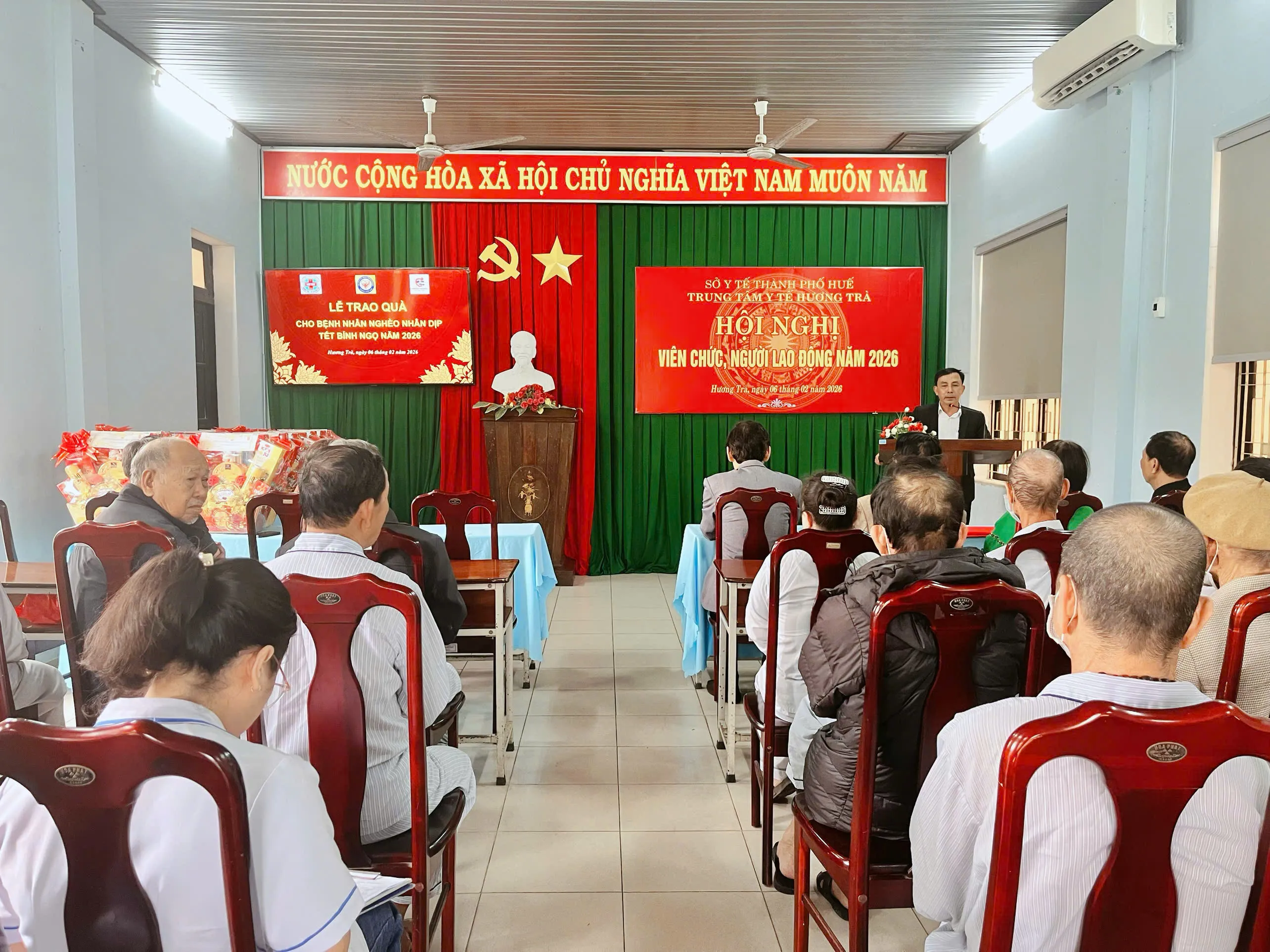 Ngày 06/02, Hội Bảo trợ bệnh nhân nghèo thành phố Huế phối hợp với Trung tâm Y tế Hương Trà và Công ty Cổ phần Vận tải Hùng Đạt tổ chức chương trình trao quà cho các bệnh nhân có hoàn cảnh khó khăn đang điều trị nội trú tại Trung tâm Y tế Hương Trà nhân dịp Tết Nguyên đán Bính Ngọ năm 2026.