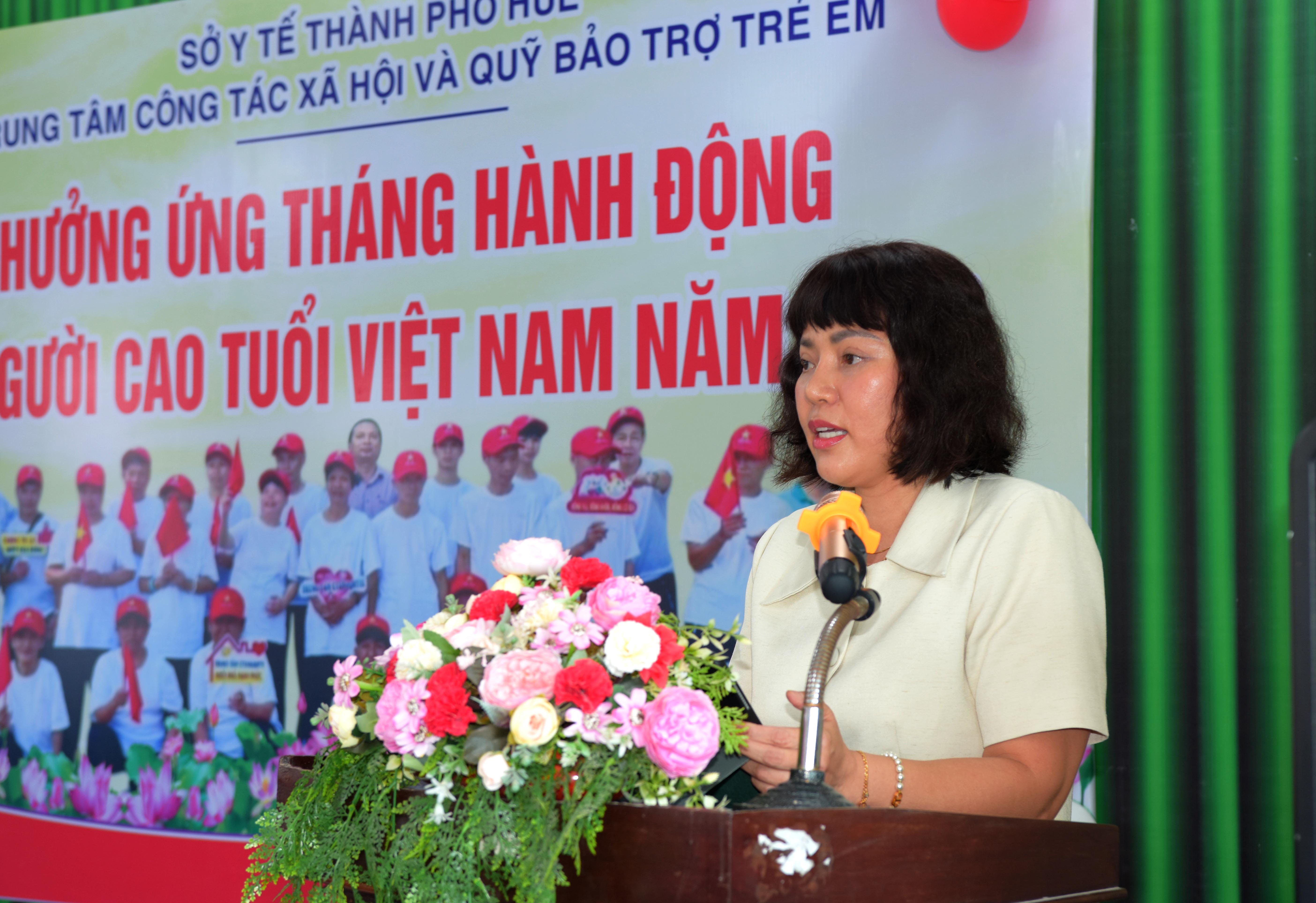ThS. Tôn Thị Nga - Phó Giám đốc Sở Y tế, phát biểu ghi nhận, tuyên dương những đóng góp và chúc mừng các cụ Người cao tuổi luôn khoẻ, phát huy tinh thần tương thân, tương ái, sống đồng thuận, vui vẻ. Đồng thời đánh giá cao tập thể Trung tâm CTXH&QBTTE đã có nhiều nỗ lực xây dựng, phát triển các dịch vụ hỗ trợ, chăm sóc, nuôi dưỡng tại Mái ấm Trung tâm ngày càng chất lượng góp phần nâng cao sức khỏe và đời sống tinh thần cho các đối tượng.