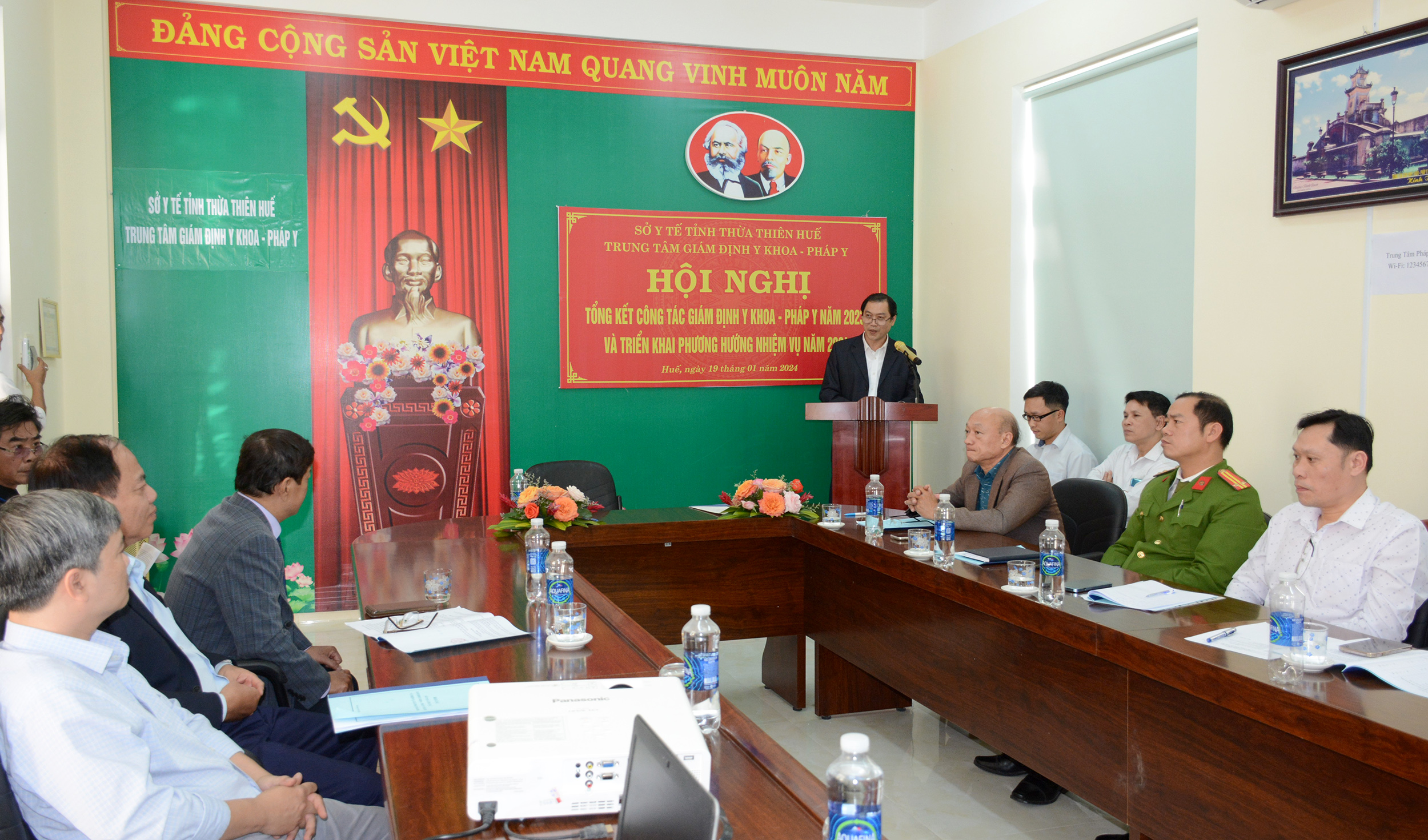 Chiều ngày 19/01, Trung tâm Giám định Y khoa - Pháp y tổ chức “Hội nghị Tổng kết công tác năm 2023 và triển khai nhiệm vụ năm 2024”. PGS.TS.BS Trần Kiêm Hảo - Giám đốc Sở Y tế dự và chủ trì hội nghị. Tham dự hội nghị có đại diện lãnh đạo các Phòng của Sở Y tế, đại diện Sở Tư pháp, Viện Kiểm sát, Văn phòng Cảnh sát điều tra Công an tỉnh, các bệnh viện/đơn vị thuộc sở Y tế, Cấp ủy, Ban Giám đốc, lãnh đạo các tổ chức đoàn thể, các khoa/phòng của Trung tâm Giám định Y khoa - Pháp y.