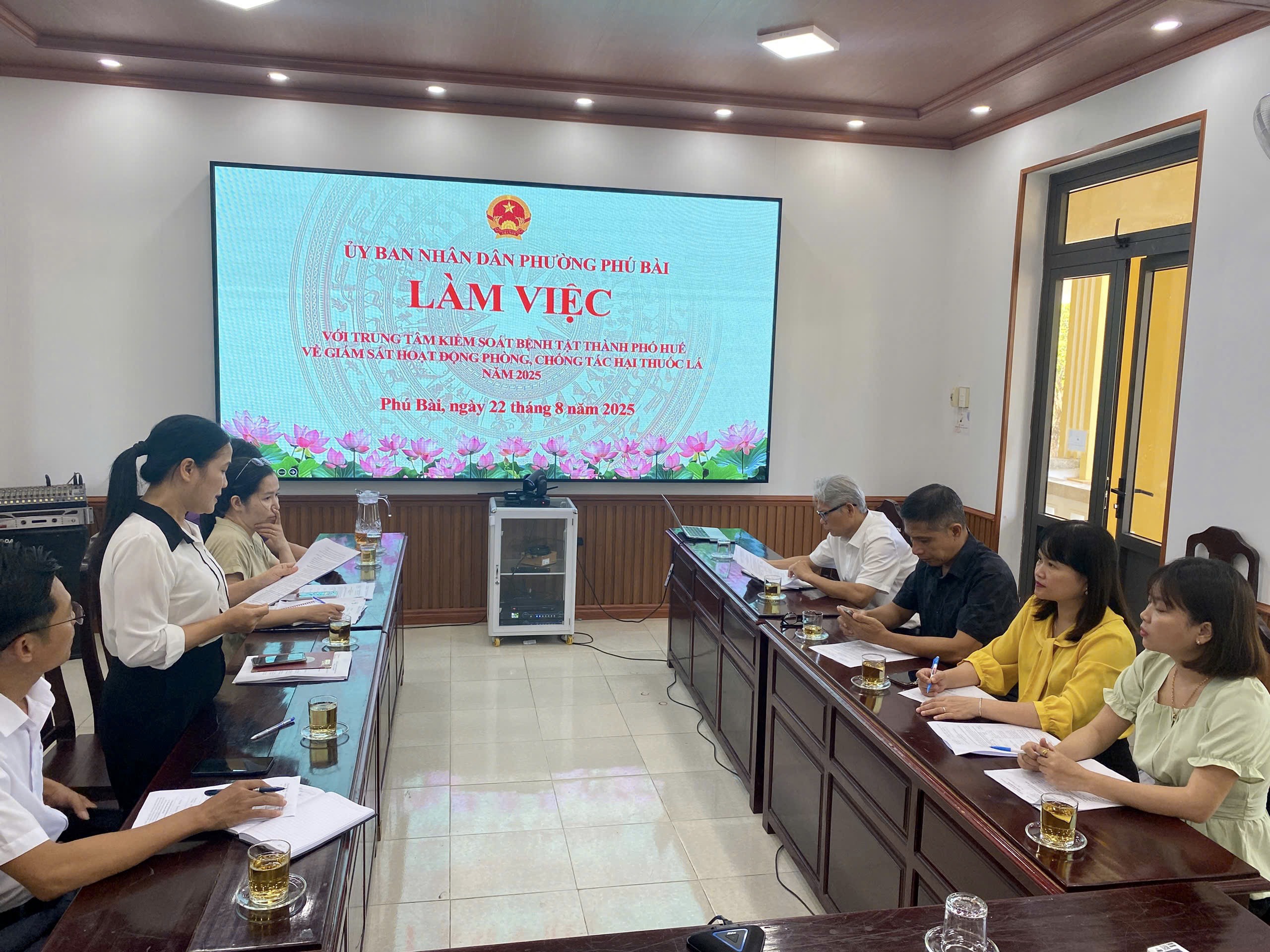 Ngày 21-22/8/2025, Trung tâm Kiểm soát bệnh tật thành phố Huế đã tổ chức giám sát hoạt động phòng, chống tác hại thuốc lá tại UBND, Trạm Y tế xã Khe Tre và phường Phú Bài. Tham dự đoàn giám sát, về phía Trung tâm Kiểm soát bệnh tật có lãnh đạo và viên chức Khoa Truyền thông giáo dục sức khỏe; về phía các đơn vị được giám sát có đại diện lãnh đạo và các thành viên Ban chỉ đạo Phòng chống tác hại thuốc lá cùng tham dự.