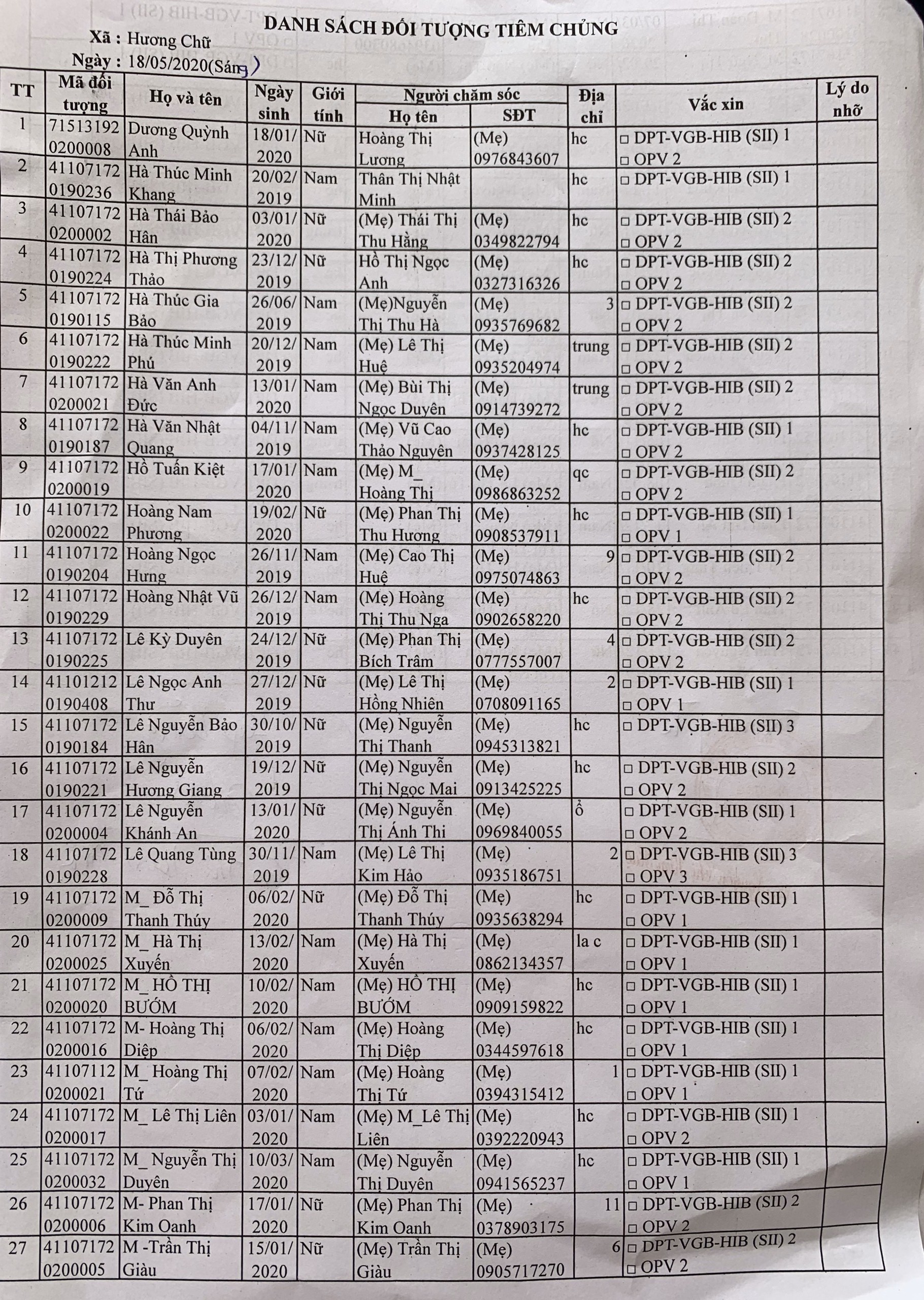 Trong buổi sáng 18/5/2020, tại trạm y tế xã Hương Chữ đã có 49 đối tượng, trạm y tế Hương An có 36 đối tượng đến tham gia tiêm chủng, các đối tượng đến tiêm chủng đã được mời theo các khung giờ khác nhau, buổi tiêm chủng tại các trạm đã được tăng thêm buổi tiêm để han chế đông người, khu vực chờ trước tiêm chủng đã được sắp xếp thông thoáng, đảm bảo giữ khoảng cách an toàn, tất cả các đối tượng đưa trẻ đến tiêm chủng đều đeo khẩu trang được kiểm tra thân nhiệt đầy đủ.. Điểm tiêm chủng được bố trí theo quy tắc một chiều, có dung dịch rửa tay cho người nhà và cán bộ y tế, phòng theo dõi sau tiêm chủng được bố trí rộng rãi, tạo khoảng cách an toàn giữa các trẻ và bố mẹ. Tất cả các đối tượng hoãn tiêm chủng trong tháng 4 đều đã được tiêm bù trong tháng 5/2020.