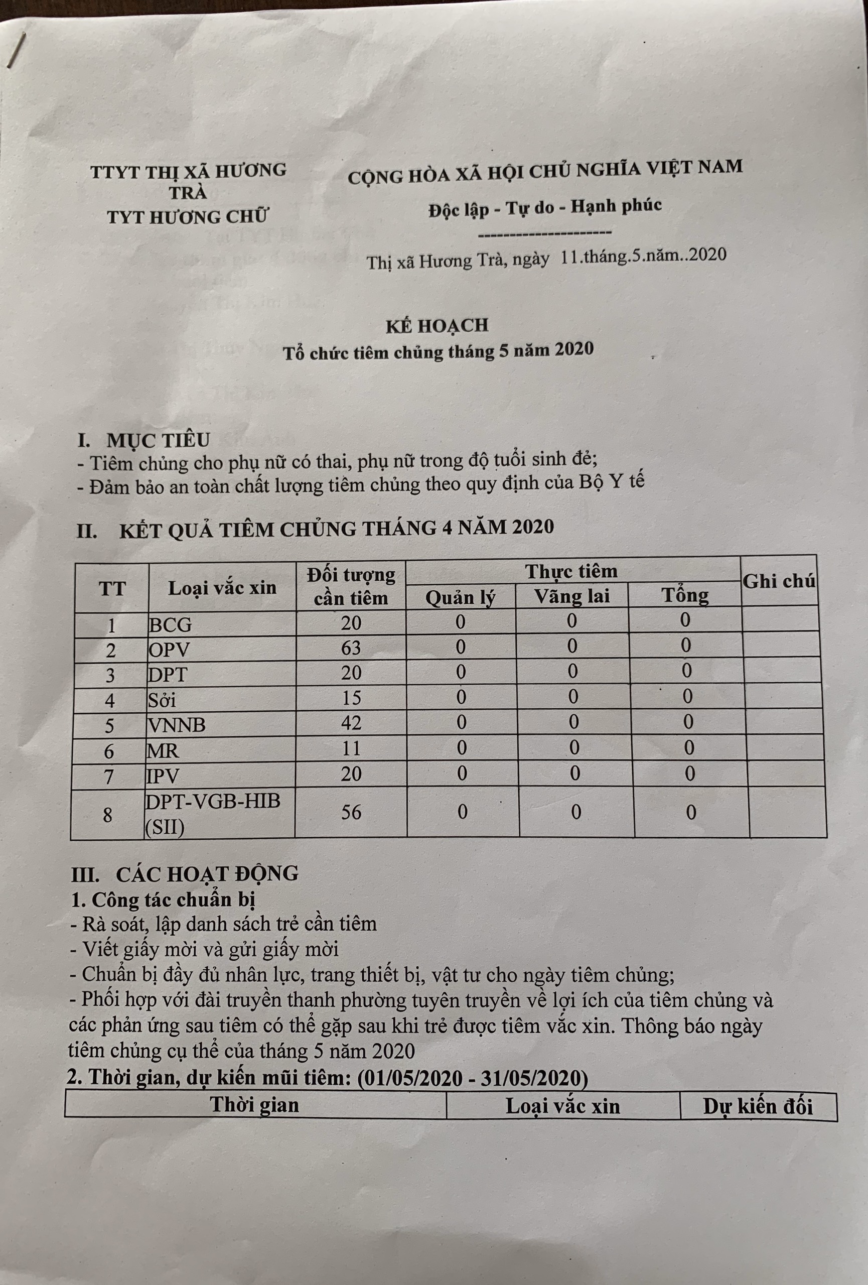 Trong tháng 4/2020 tại các trạm y tế xã phường trên địa bàn toàn tỉnh đã tạm hoãn tiêm chủng, tiếp tục thực hiện Chỉ thị 15/CP-TTg và Chỉ thị 16/C-TTg của Thủ tướng theo Công văn số 3123/UBND-YT ngày 15/4/2020 của UBND tỉnh Thừa Thiên Huế. Nhằm hạn chế gián đoạn tiêm chủng,từ ngày 18/5/2020 công tác tiêm chủng thường xuyên đã tiếp tục triển khai trên địa bàn toàn tỉnh, đảm bảo theo Hướng dẫn của Viện Vệ sinh dịch tễ Trung ương-Tiêm chủng mở rộng Quốc gia.