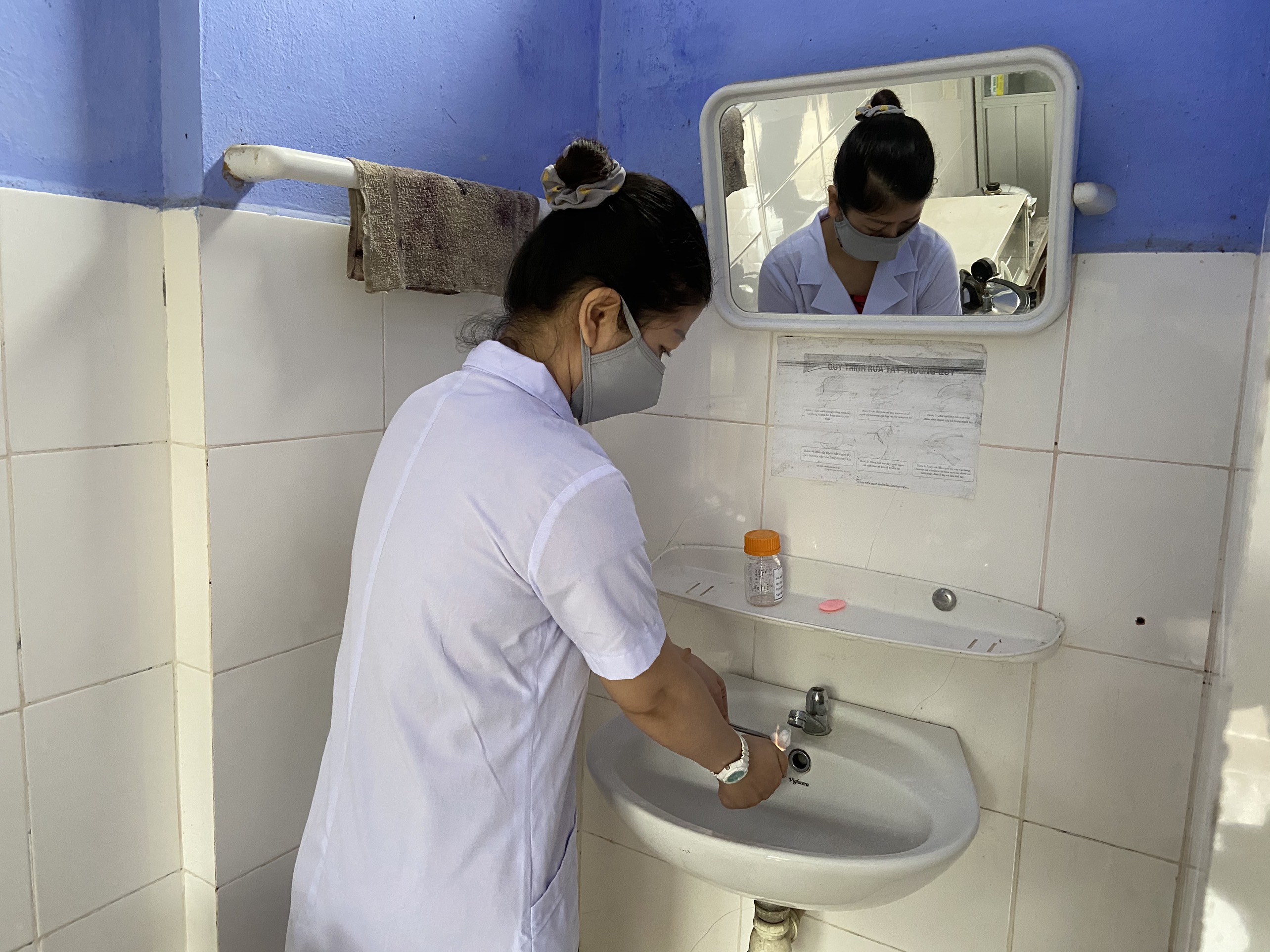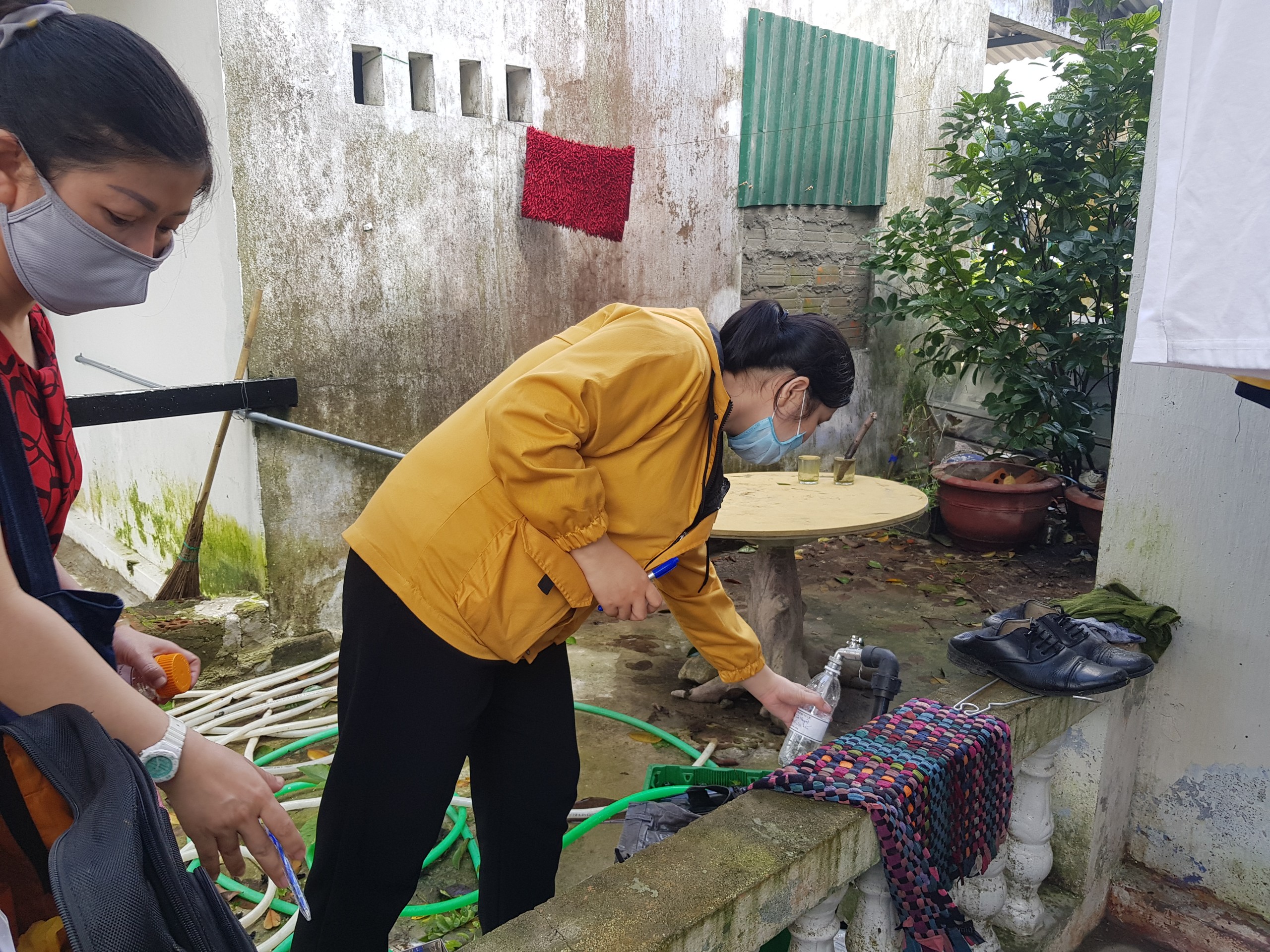 Cán bộ HueWACO lấy mẫu và kiểm tra chất lượng nước tại nhà các hộ dân xã Hồng Hạ