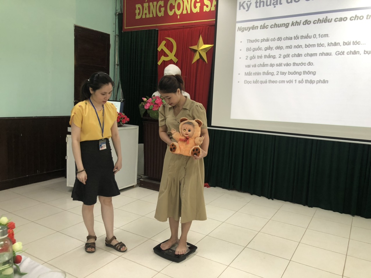 Cán bộ khoa PCBKLN-DD hướng dẫn thực hành cân đo nhân trắc