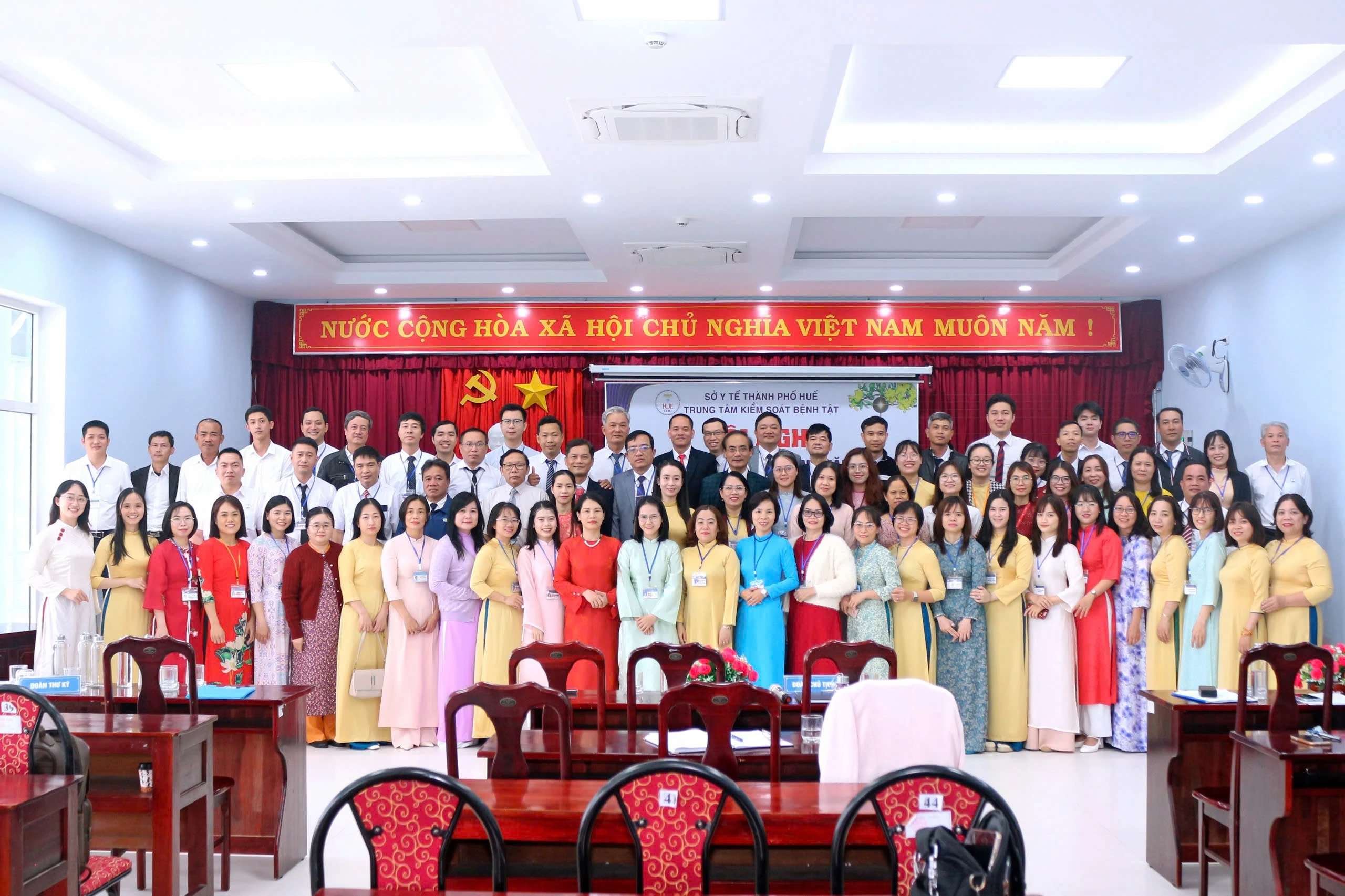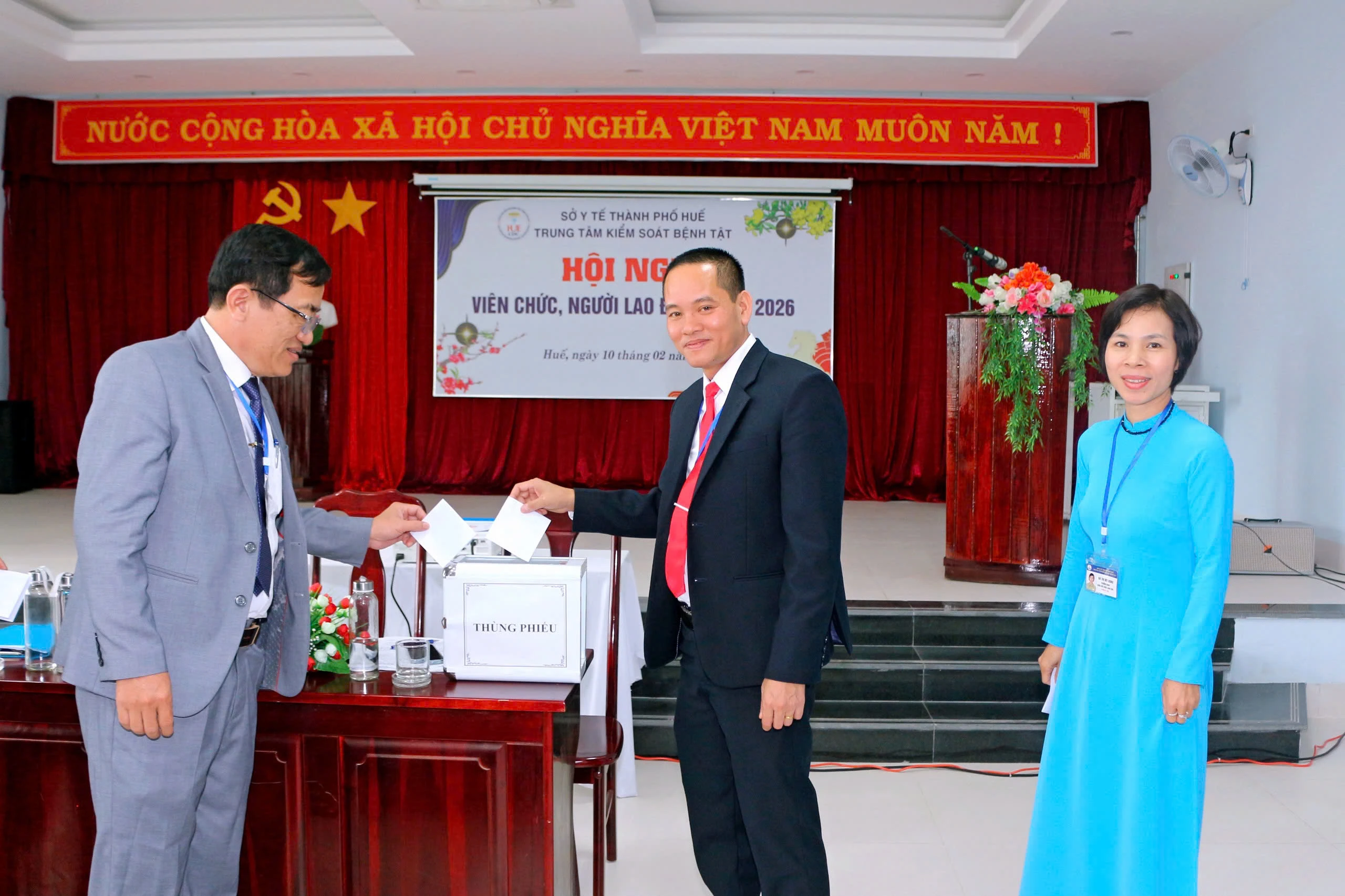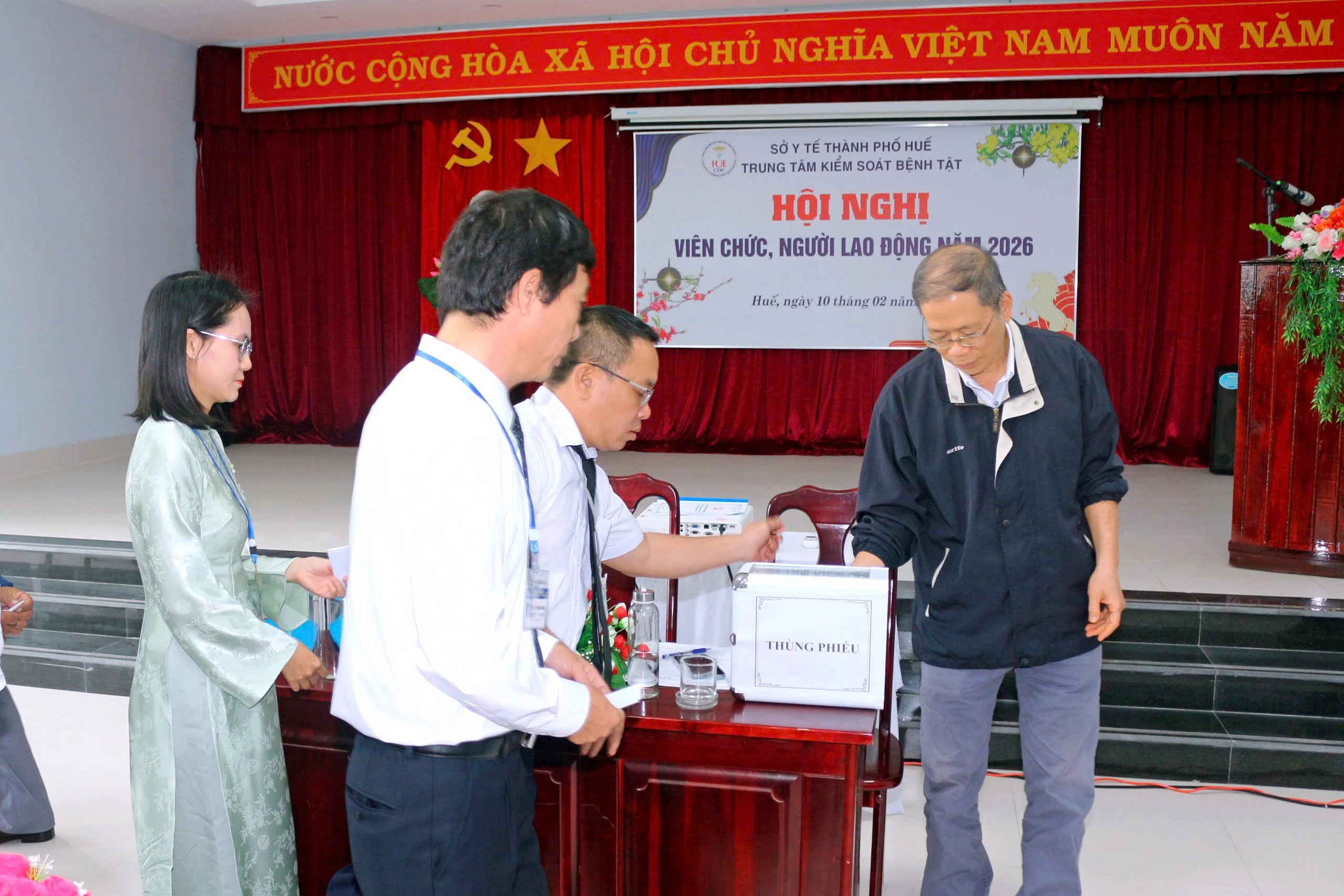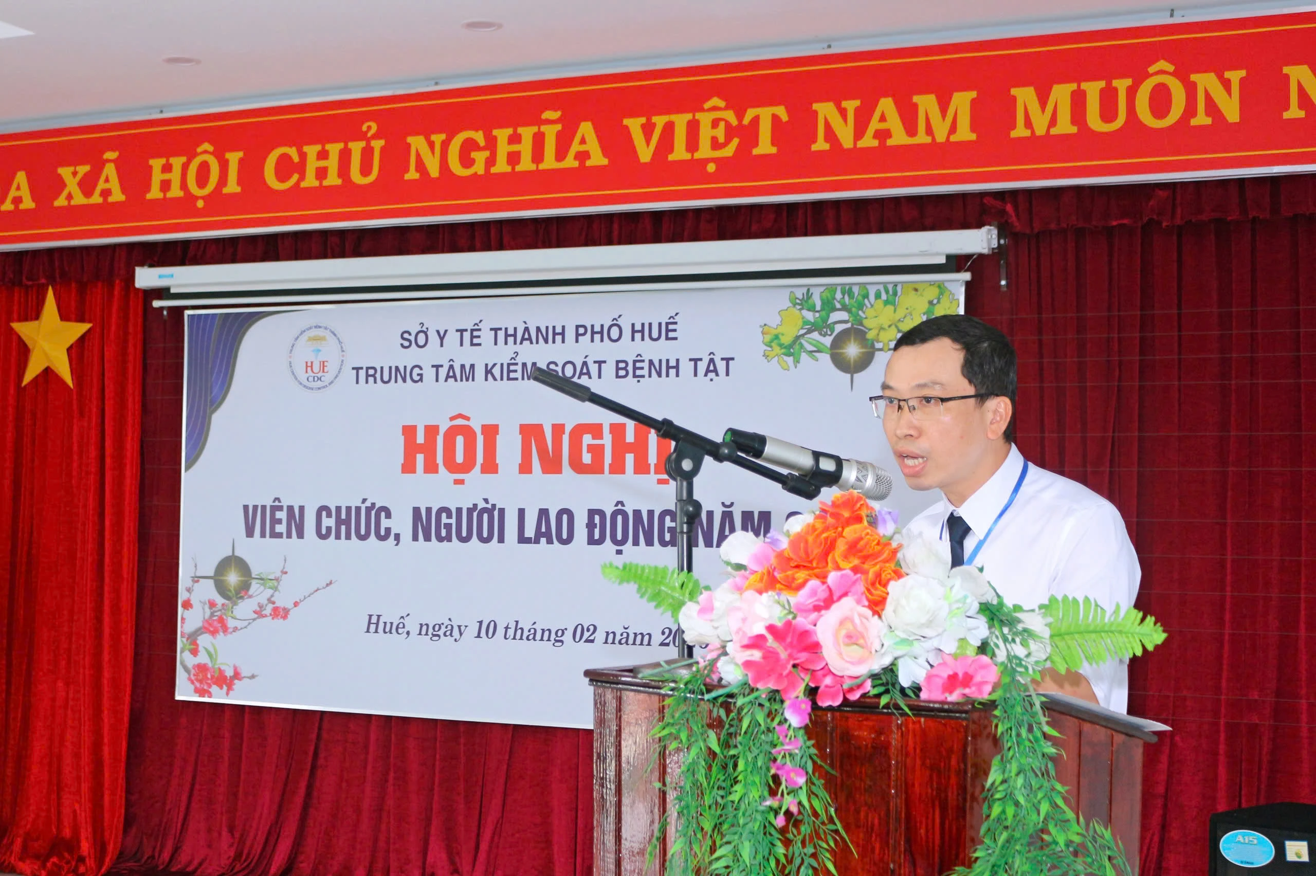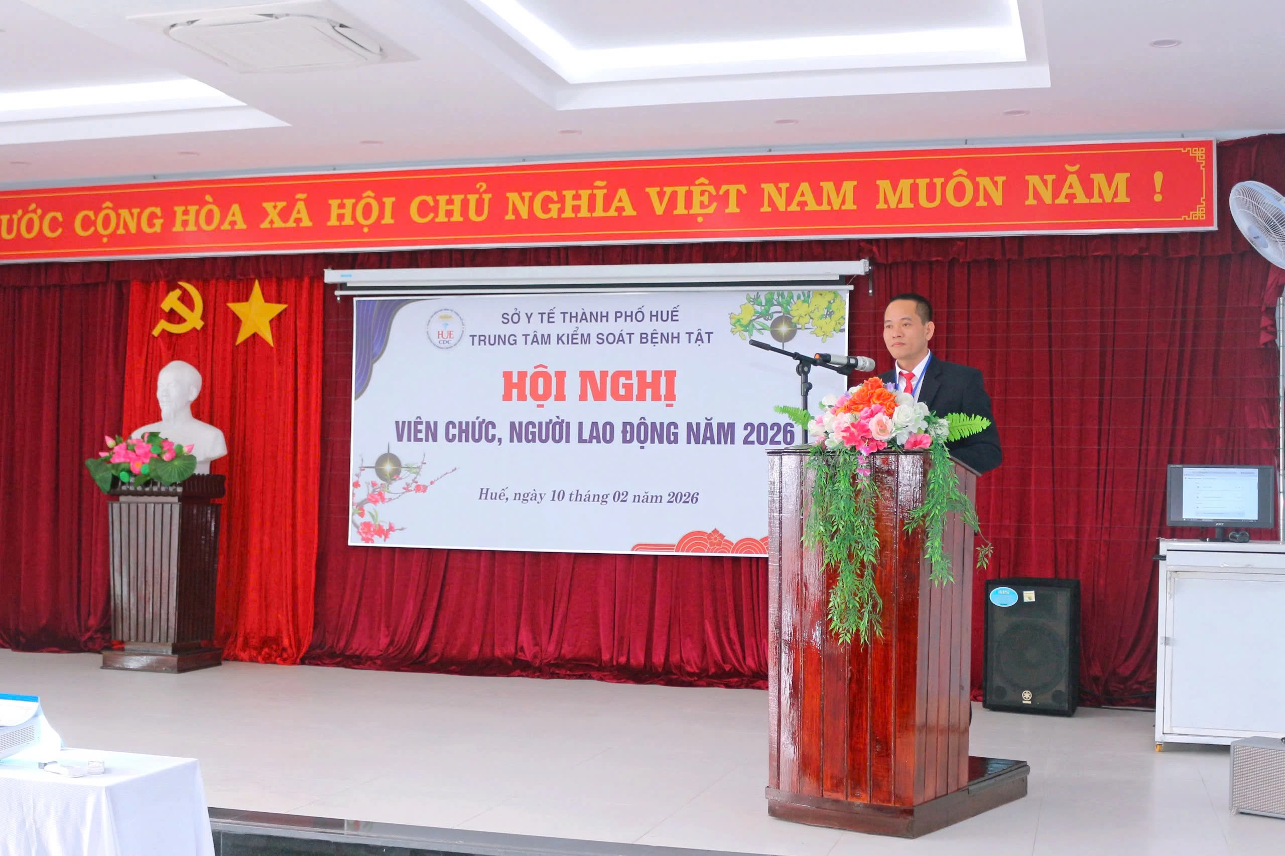 Sáng ngày 10/02/2026, Trung tâm Kiểm soát bệnh tật thành phố Huế tổ chức Hội nghị viên chức, người lao động nhằm đánh giá tình hình, kết quả triển khai thực hiện nhiệm vụ trong năm 2025 và đề ra phương hướng, nhiệm vụ năm 2026. Tham dự và chỉ đạo hội nghị có BSCKII. Thái Văn Tuấn - Bí thư Đảng bộ bộ phận - Giám đốc Trung tâm Kiểm soát bệnh tật thành phố Huế; có các đồng chí trong Ban Giám đốc; Ban Chấp hành Công đoàn; lãnh đạo các Khoa, phòng và viên chức, người lao động thuộc Trung tâm Kiểm soát bệnh tật.