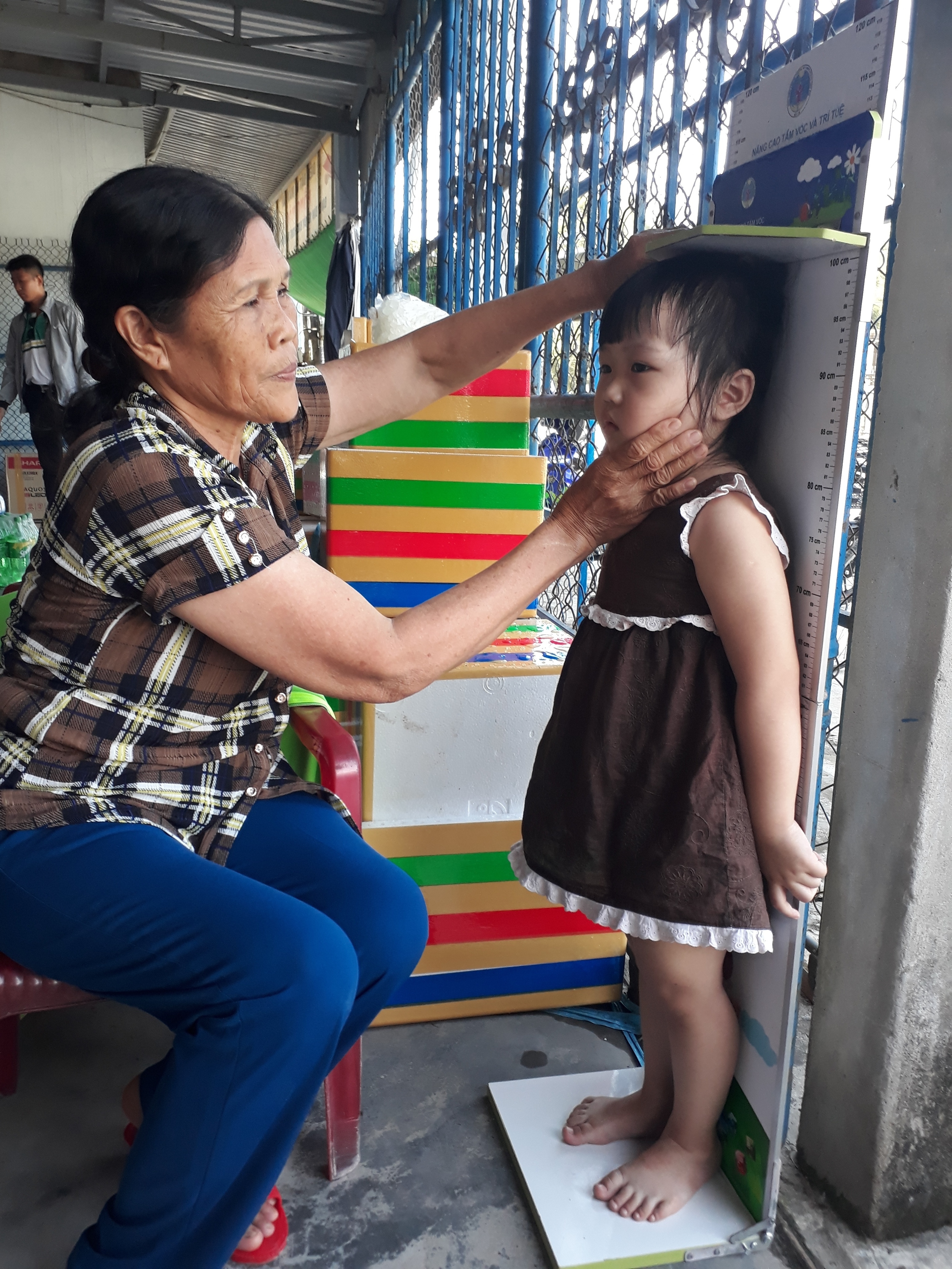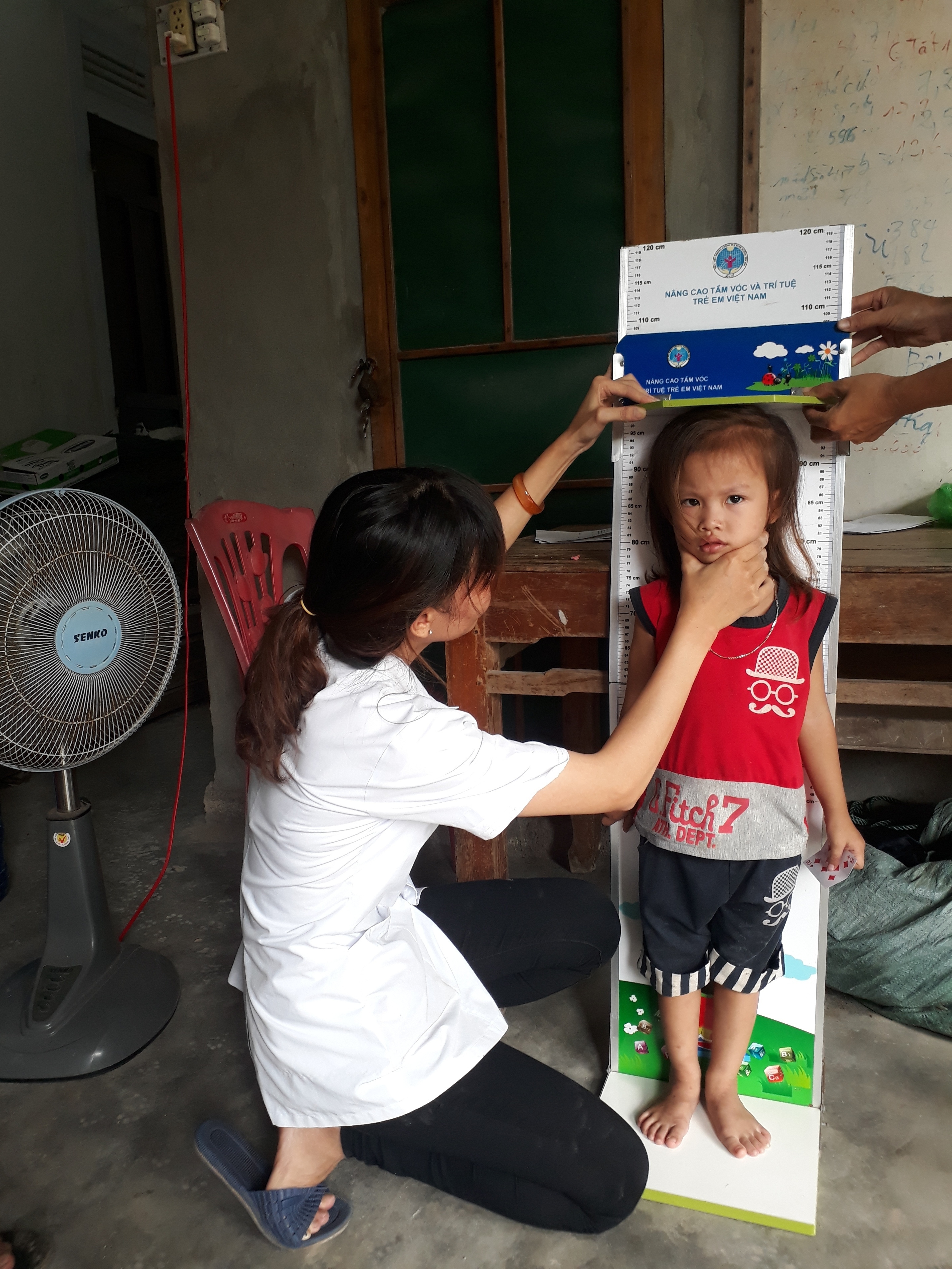 Cán bộ y tế thôn tham gia đo chiều cao đứng cho trẻ trên 2 tuổi tại nhà dân