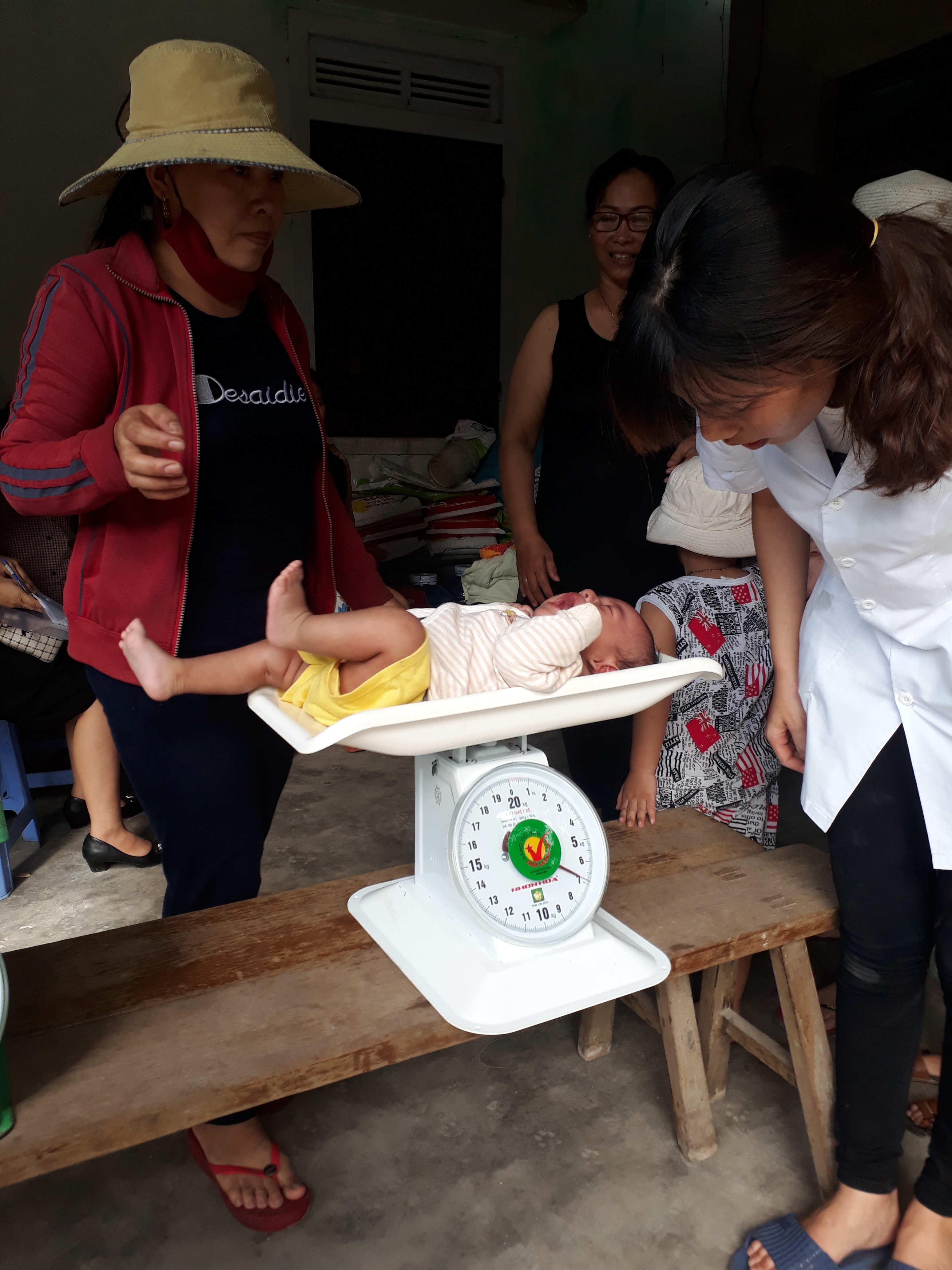 Cán bộ y tế tham gia cân trẻ tại nhà dân
