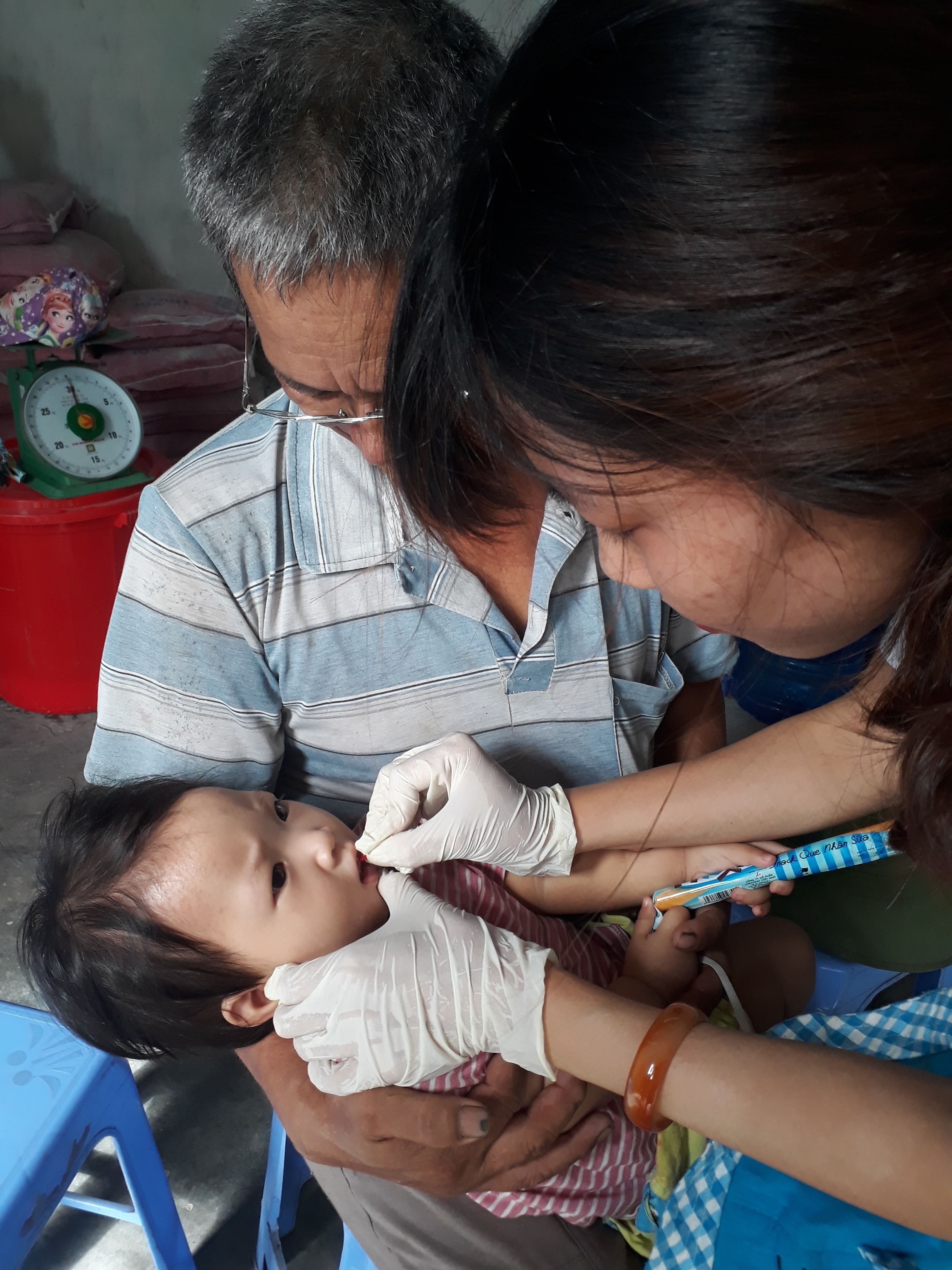 Cán bộ y tế thôn tham gia cho trẻ uống Vitamin A tại nhà dân