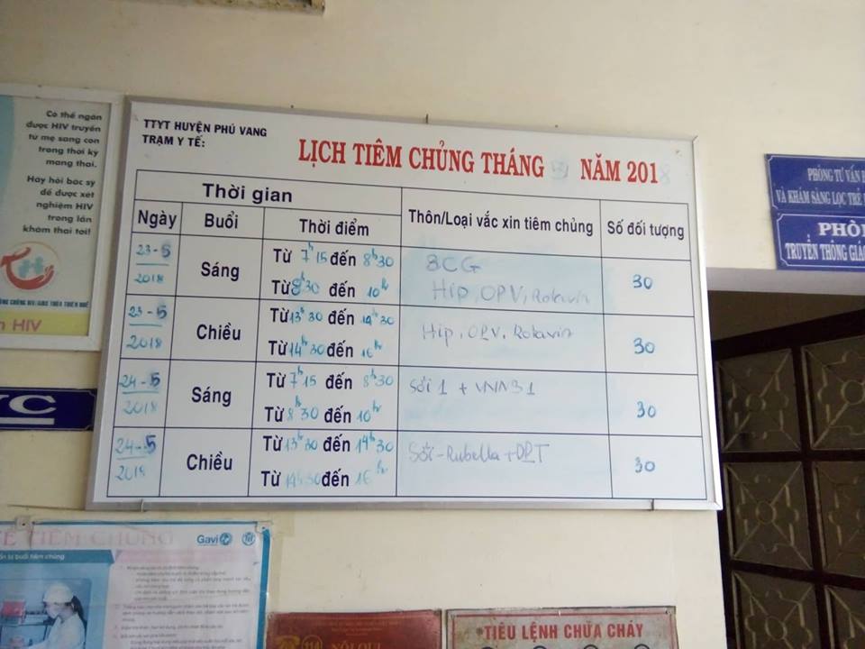- Tất cả các trạm Y tế đã tổ chức tiêm chủng theo đúng kế hoạch và đúng theo quy định của Thông tư 12/2014/TT-BYT. Các trạm Y tế đều có kế hoạch tiêm chủng tháng 5/2018, có phân công nhân lực, lập danh sách đối tượng tiêm chủng trong tháng, chuẩn bị đầy đủ vắc xin và vật tư cho buổi tiêm chủng.