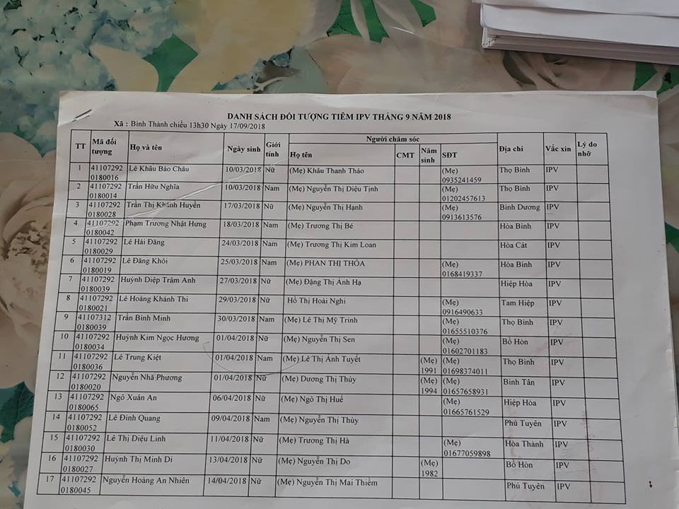 Trạm Y tế xã Bình Thành và Bình Điền đã triển khai tiêm vắc xin bại liệt tiêm (IPV) cho trẻ đủ 5 tháng tuổi trên địa bàn xã. Do xã Hồng Tiến có số lượng trẻ đủ 5 tháng tuổi quá ít nên Trạm Y tế sẽ triển khai 3 tháng 1 lần tiêm vắc xin bại liệt tiêm (IPV) cho trẻ (dự kiến tháng 11/2018) để đảm bảo hệ số vắc xin.