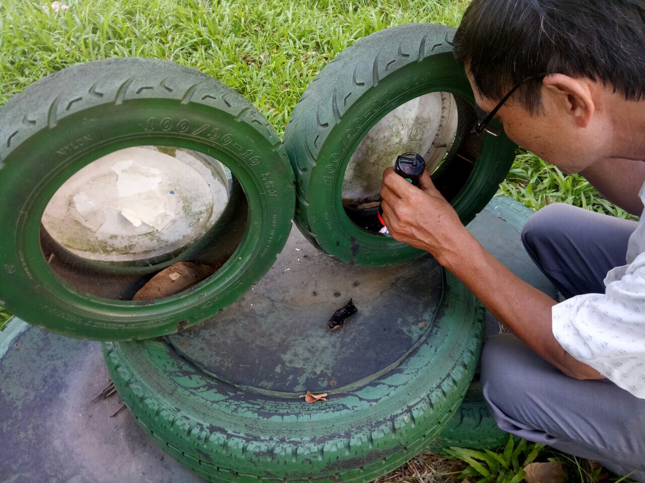 Theo thông tin phản ánh về việc muỗi xuất hiện nhiều tại tổ dân phố 9, phường Tứ Hạ, Thị xã Hương Trà. Trong những ngày vừa qua TTYT thị xã phối hợp với UBND phường Tứ Hạ đã tiến hành làm việc tại nhà dân được phản ánh. Qua quá trình làm việc nhận thấy lốp xe phế thải được để phía sau sân vườn quá nhiều, trong những ngày mưa nắng thất thường làm đọng nước trong lốp xe là môi trường thuận lợi để muỗi đẻ trứng và bọ gậy phát triển. Đoàn kiểm tra đã tiến hành xử lý, thau vét ổ bọ gậy vào ngày 15/09/2019, dùng muối cho vào lốp xe nhằm hạn chế bọ gậy phát triển.